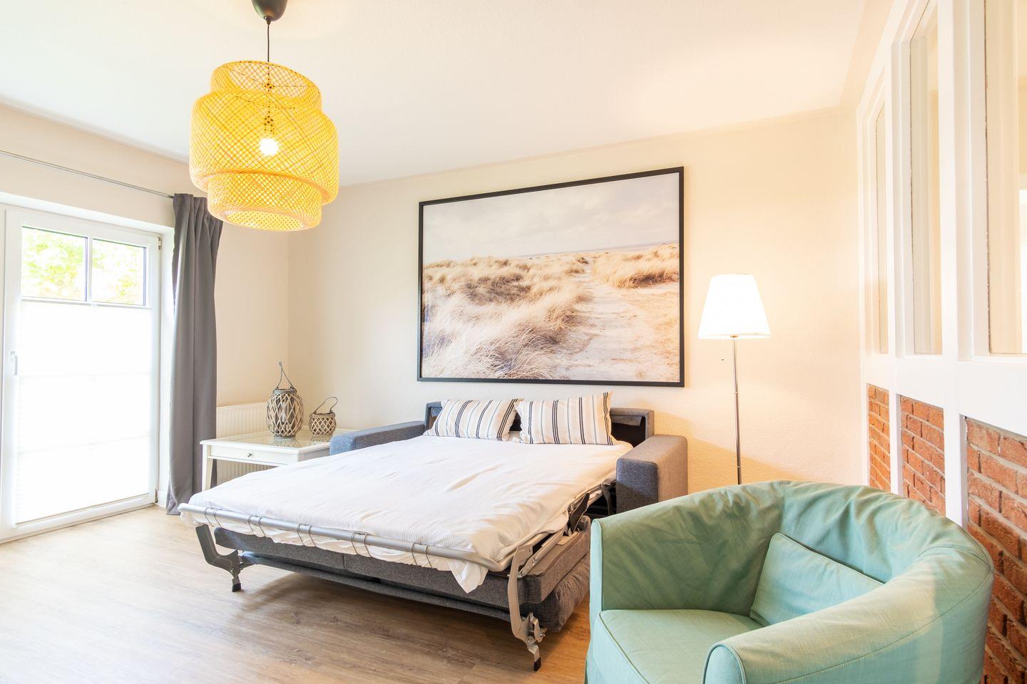 Im Wohnbereich befindet sich ein Schlafsofa (180 x 190 cm mit einer richtigen Matratze ) und zwei Sessel, ein Fernseher und eine kleine Stereoanlage mit CD- Player zu geselligen Fernsehabenden ein. Das Wohnzimmer wurde mit Design-Belag ausgelegt.
