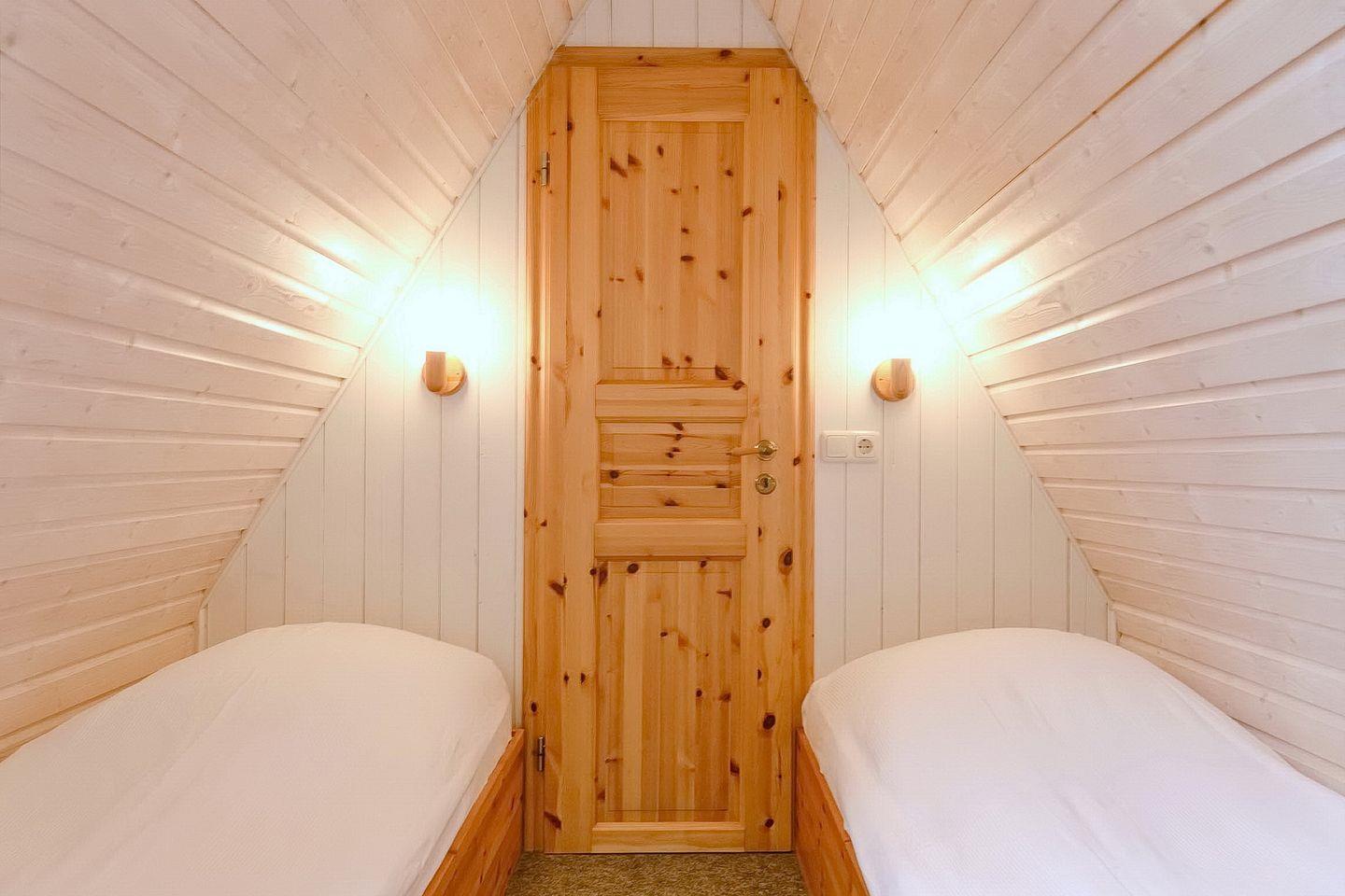 Über eine Holzwendeltreppe erreichst du die im Dachgeschoss hintereinander gelegenen Schlafzimmer mit je 2 Einzelbetten (80 x 190 cm). Für deine Garderobe nutzt du die im Treppenbereich befindliche Kommode mit Schiebetür und die Garderobestange. Die Fenster sind mit Plissees und Rollläden ausgestattet.