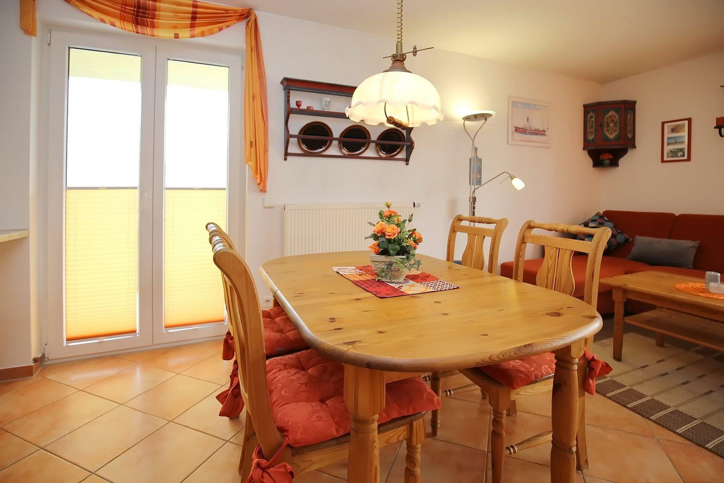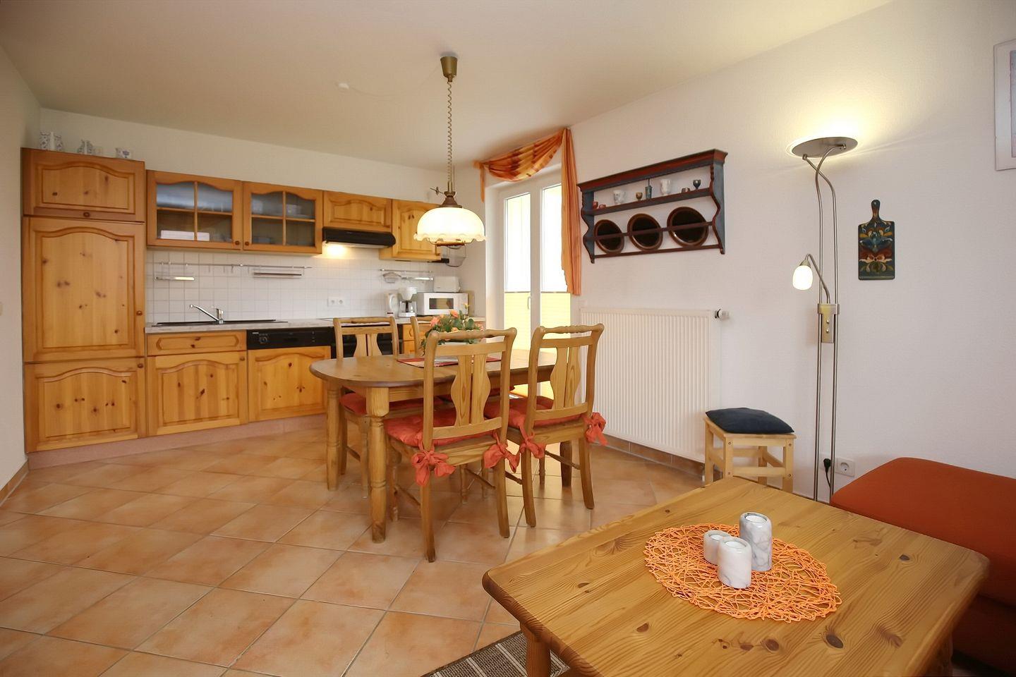 In der Küchenzeile stehen für die Zubereitung deiner Mahlzeiten ein Backofen, ein 4-Platten-Cerankochfeld und Mikrowelle zur Verfügung. Zusätzlich findest du noch Geschirrspüler und Kühlschrank mit Gefrierfach vor. Am Esstisch der Ferienwohnung können die Speisen gemeinsam eingenommen werden.