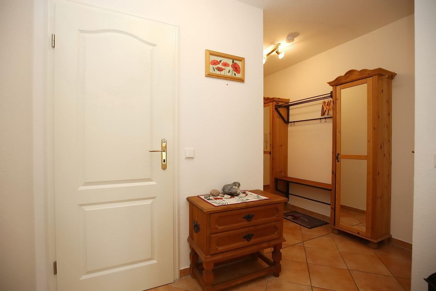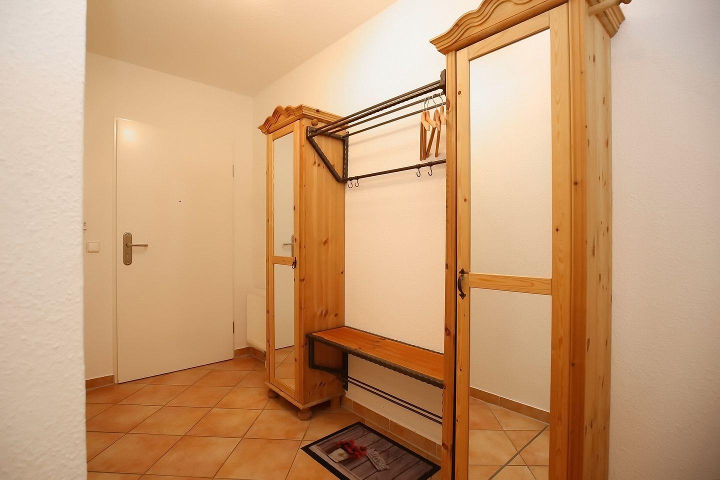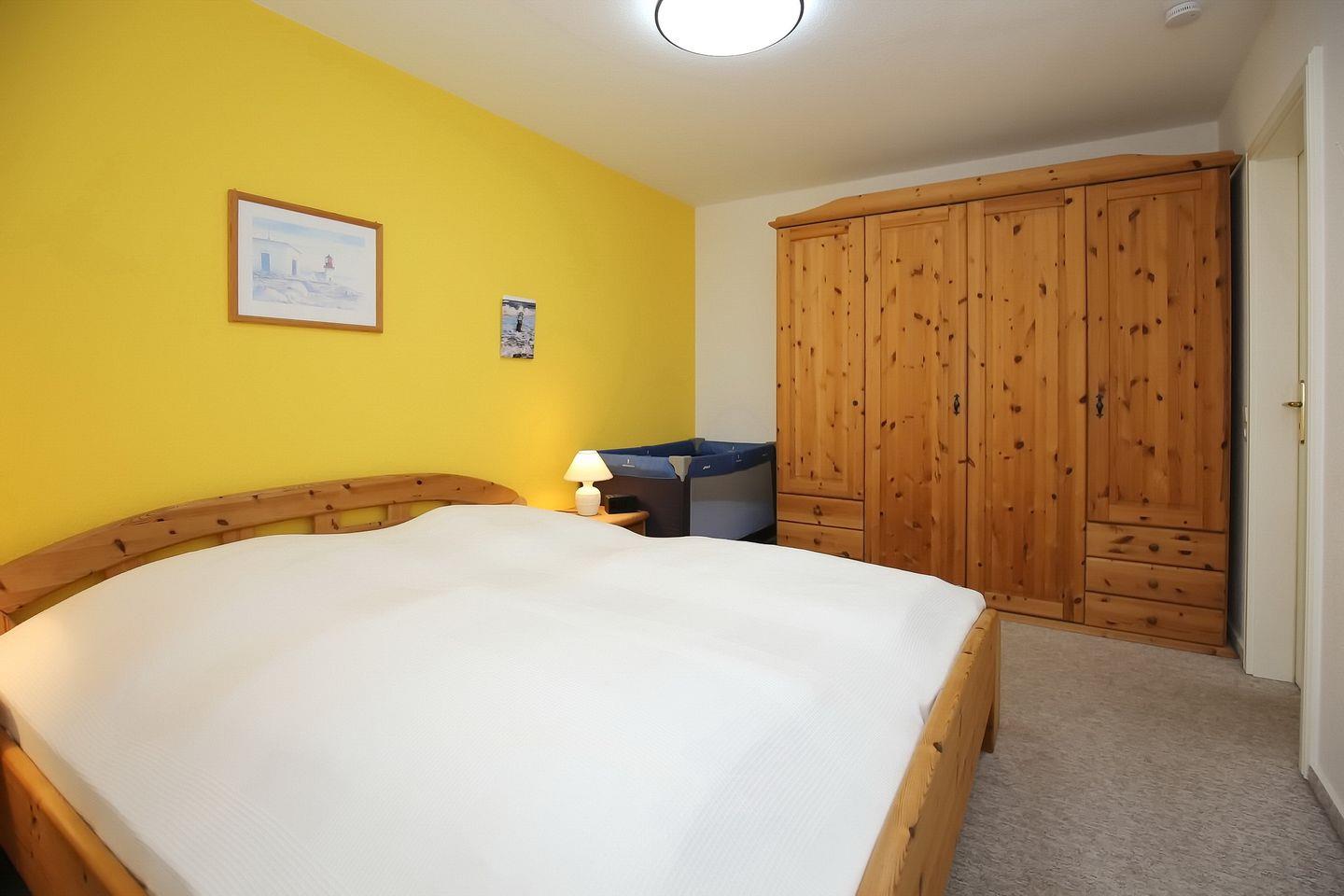 Im Schlafzimmer fällt das Träumen im bequemen Doppelbett (2 x 90 x 200 cm) und mit Vorhängen an den Fenstern leicht. Ablagemöglichkeiten bietet der große Kleiderschrank. Als Bodenbelag wurde in der Ferienwohnung Fliesen gewählt. Der Boden im Schlafzimmer ist mit Teppich ausgelegt.