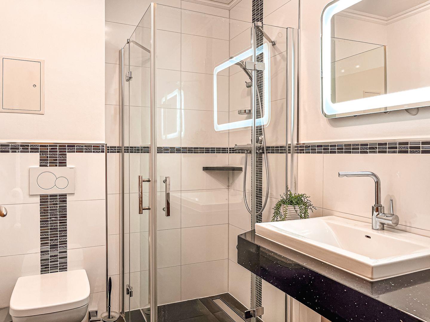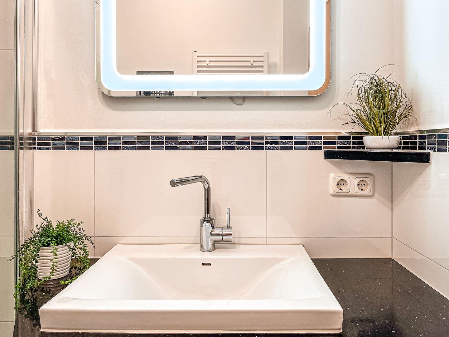 Das hochwertig geflieste Duschbad bietet eine Glasdusche und einen Waschtisch. Der Boden wurde in der Ferienwohnung mit Fliesen ausgelegt. In dieser Nichtraucherwohnung sind Haustiere nicht erlaubt.