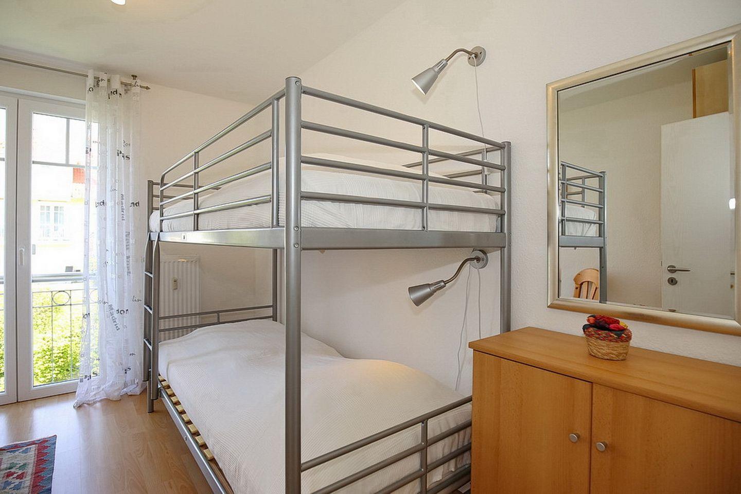 Das erste Schlafzimmer verfügt über ein gemütliches Doppelbett (2x90x200 cm) und einen Kleiderschrank mit viel Stauraum. Im zweiten Schlafzimmer findest du ein Etagenbett (jeweils 90 x 200 cm) und einen Kleiderschrank vor. Jedes Schlafzimmer kann mit Außenjalousien verdunkelt werden. Für kleine Gäste sind ein Kinderbett mit hochwertiger Matratze und ein Kinderhochstuhl vorhanden.