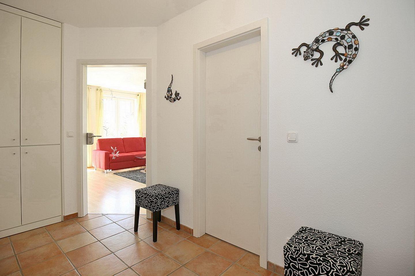 Als Bodenbelag wurde für diese Ferienwohnung im Flur und im Bad Fliesen gewählt. Im Wohn- und Essbereich und im zweiten Schlafzimmer befinden sich Laminat. Im ersten Schlafzimmer liegt ein Teppichboden.