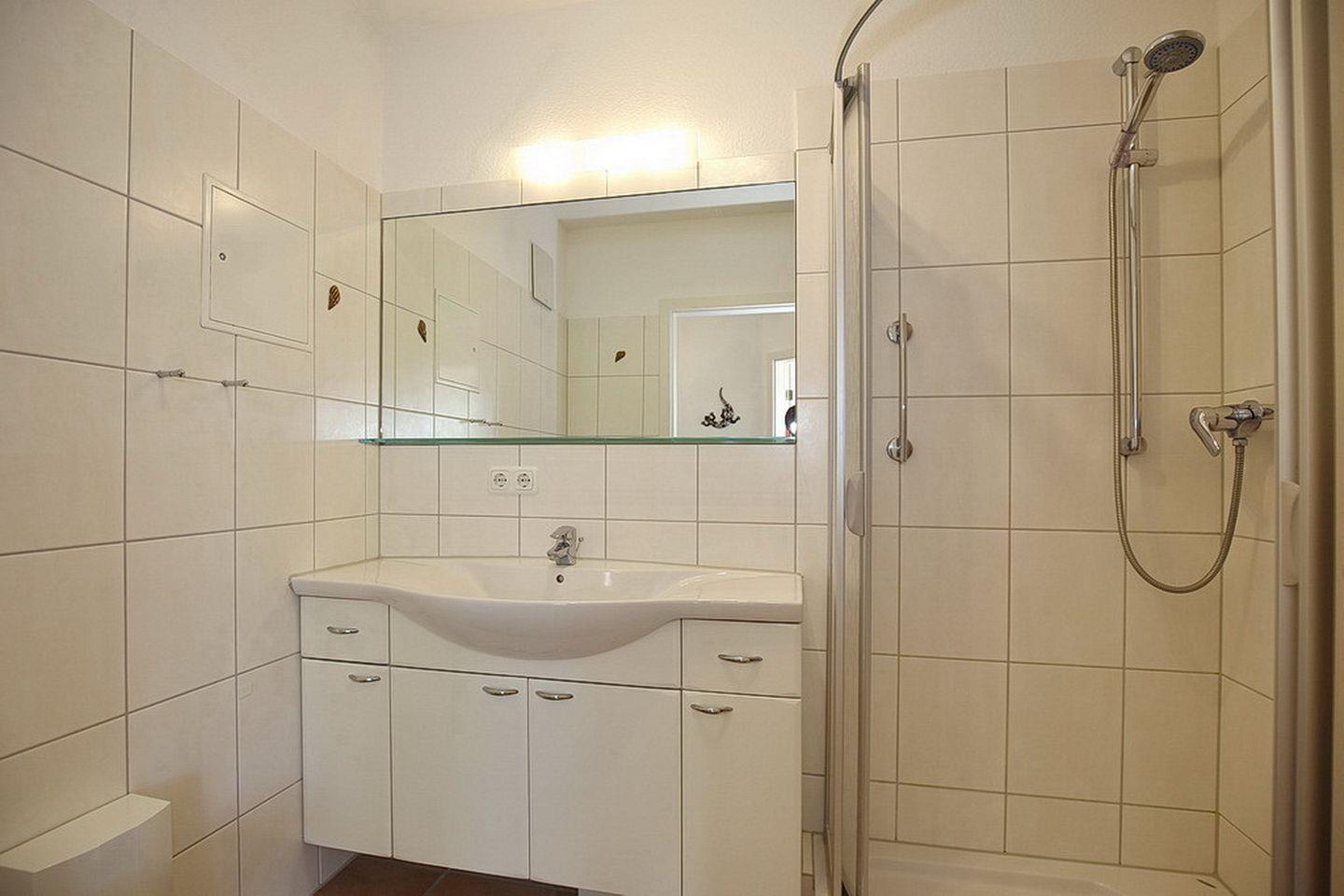 Im vorhandenen Duschbad gibt es eine Dusche und einen Waschtisch mit vielen Ablagemöglichkeiten.