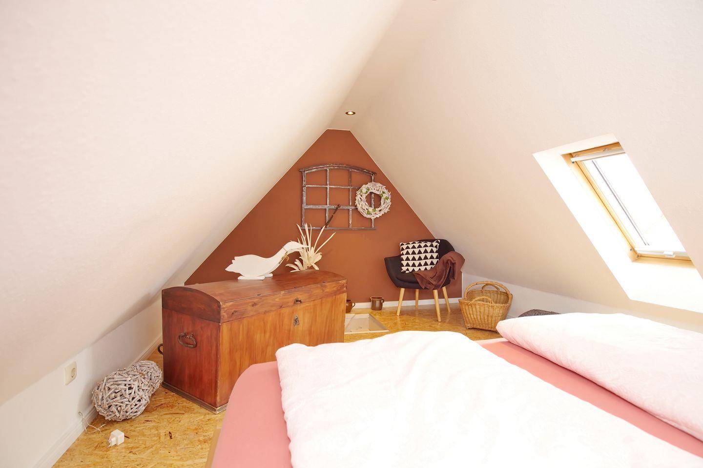 Für die Zubereitung deiner Mahlzeiten nutzt du in der kleinen Küchenzeile: Mikrowelle, Kühlschrank mit Gefrierfach und das 2-Plattenkochfeld. Über die innenliegende (steile) Treppe gelangst du in das Schlafzimmer unter dem Dach. Hier träumst du in einem bequemen Doppelbett. Abgedunkelt werden die Fenster mit Rollos. Dein Urlaubsgepäck findet seinen Platz im Kleiderschrank im Wohnraum.