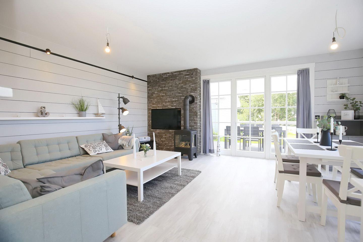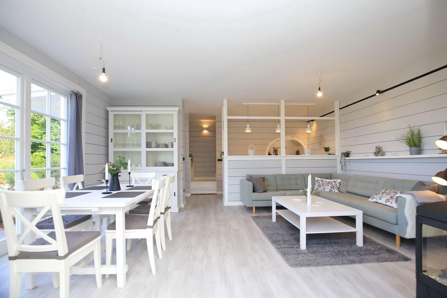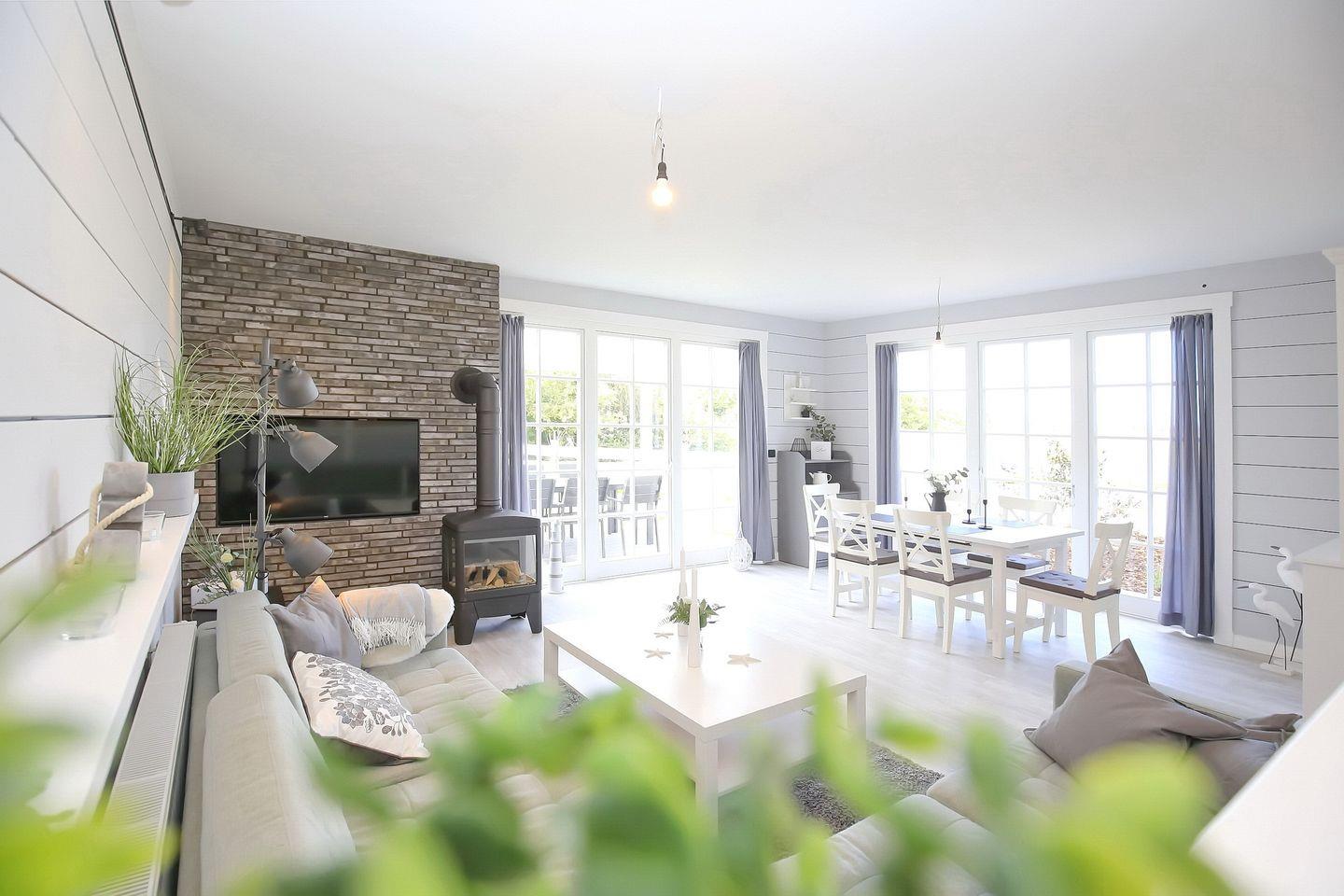 Im Wohnzimmer findest du ein modernes Sofa und einen Essbereich vor. Ein Gas-Kamin sorgt für gemütliche Stimmung und wohlige Wärme. Für Unterhaltung sorgen ein Flachbild-TV und eine Radio mit CD-Spieler. Die Fenster im Erdgeschoss sind mit Vorhängen versehen.
