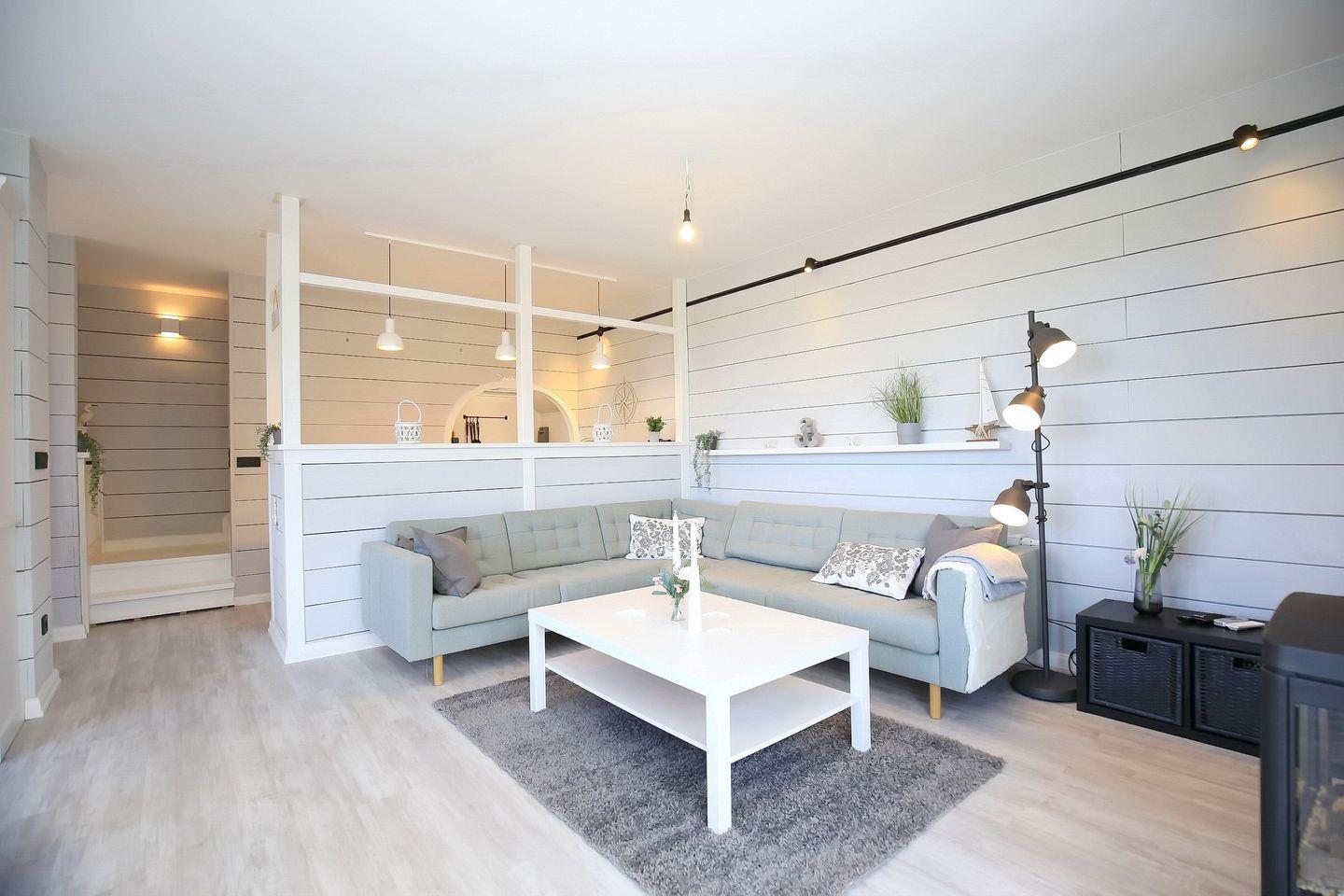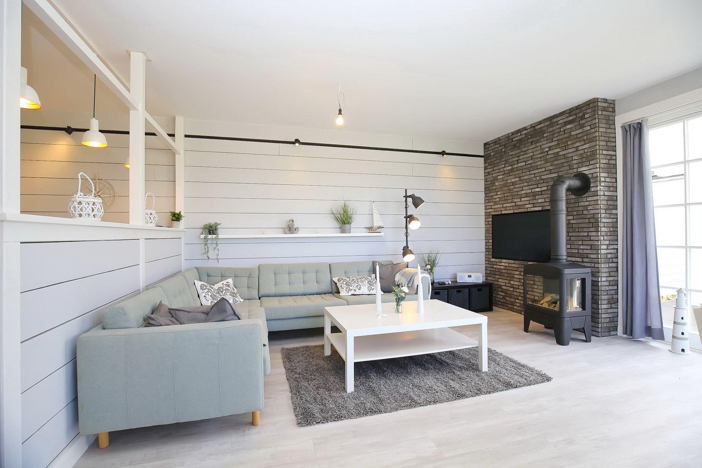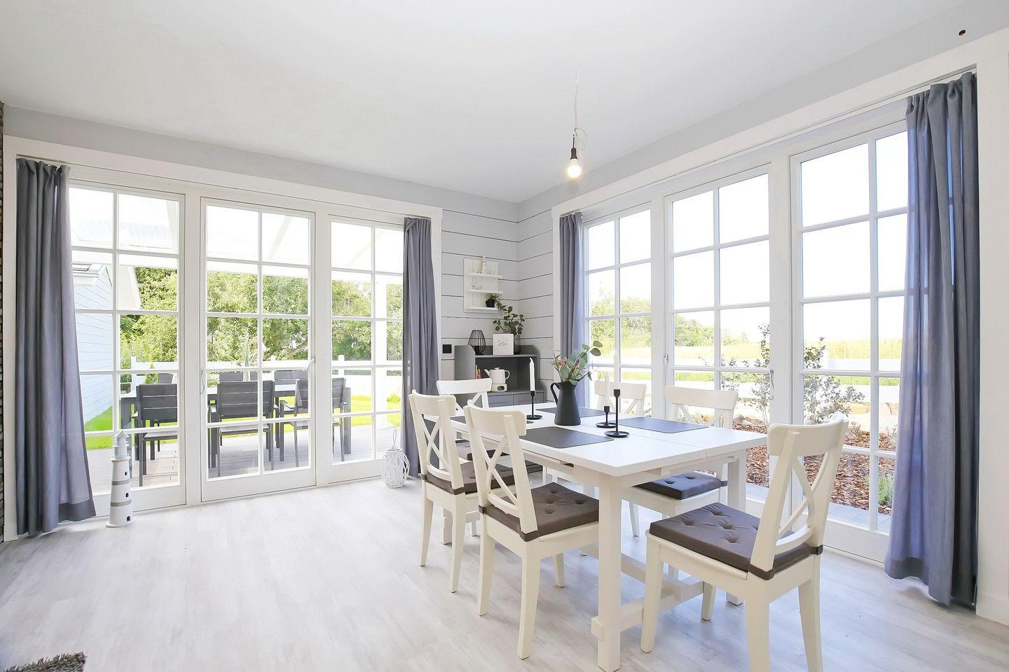 Im Wohnzimmer findest du ein modernes Sofa und einen Essbereich vor. Ein Gas-Kamin sorgt für gemütliche Stimmung und wohlige Wärme. Für Unterhaltung sorgen ein Flachbild-TV und eine Radio mit CD-Spieler. Die Fenster im Erdgeschoss sind mit Vorhängen versehen.