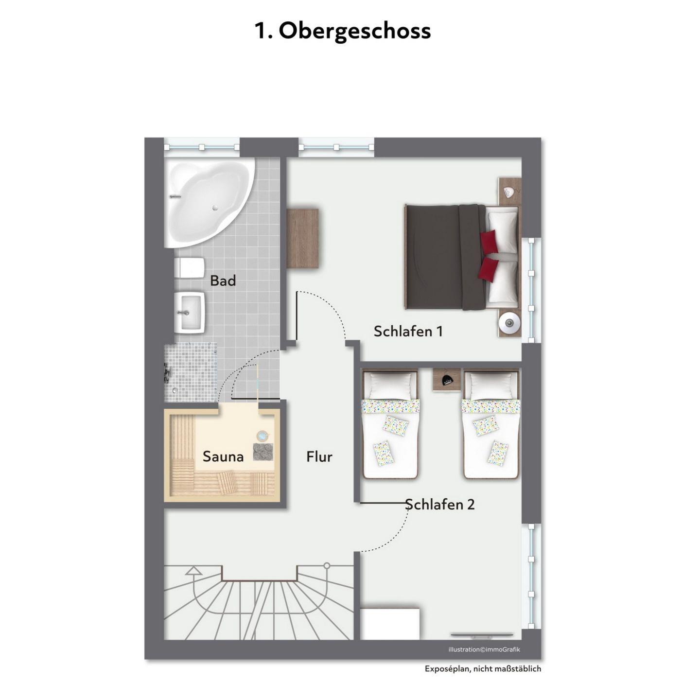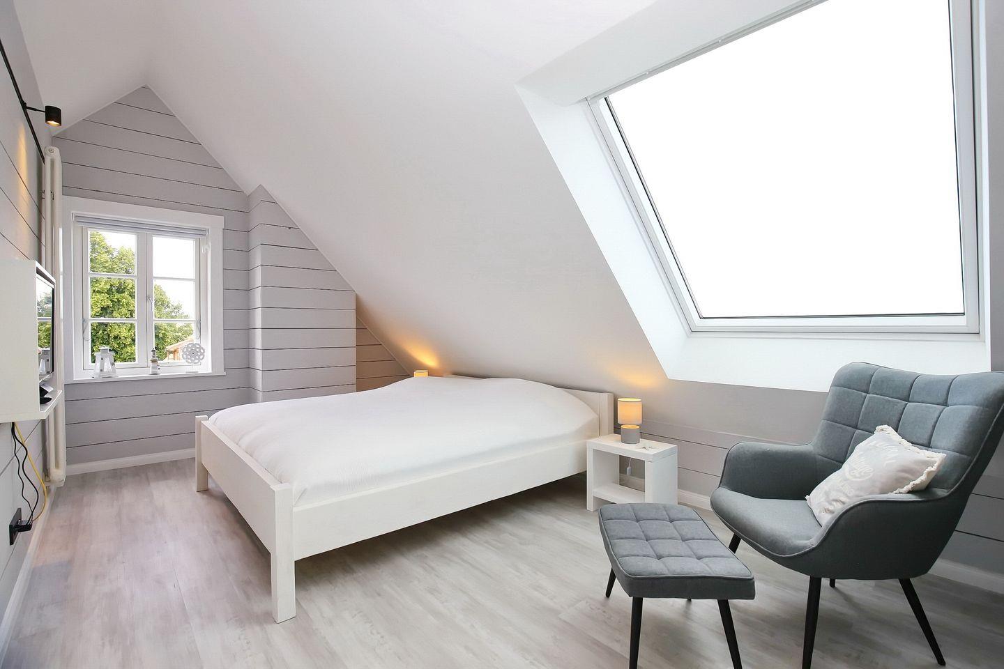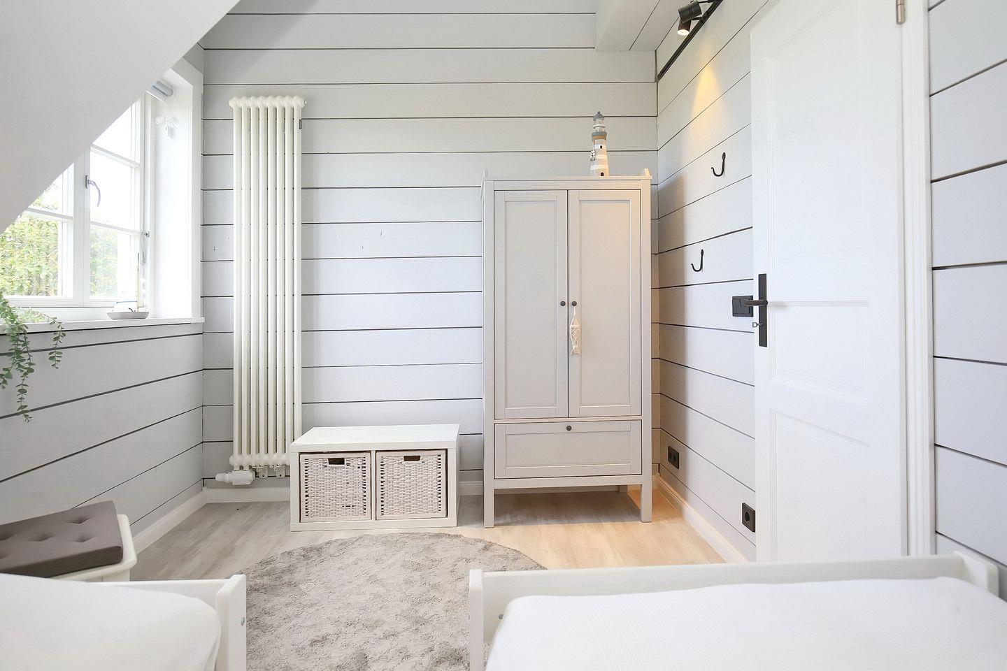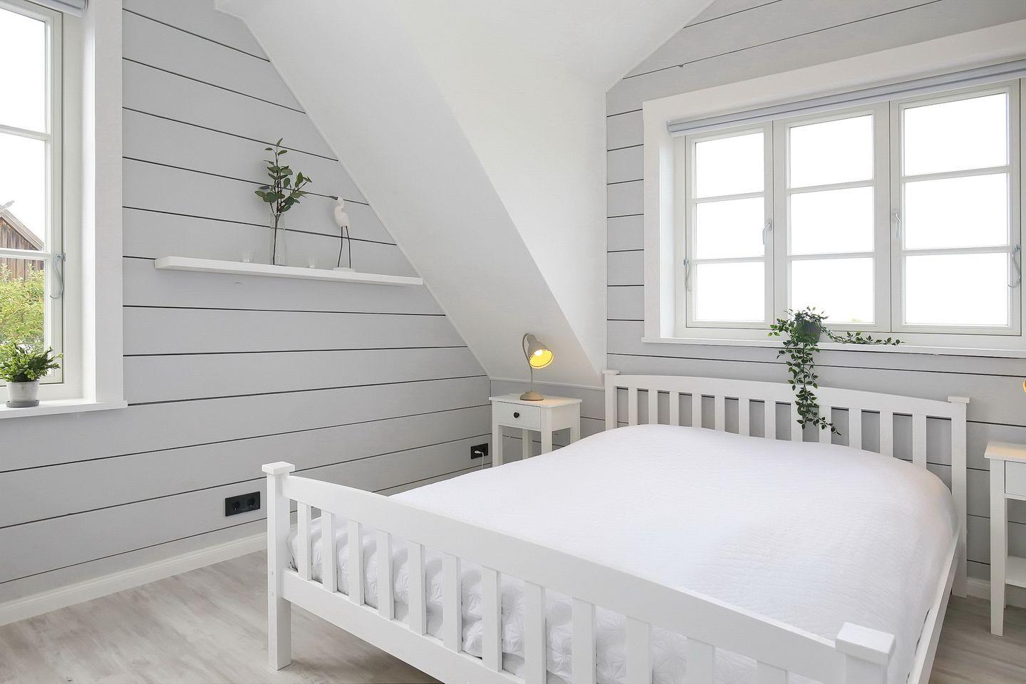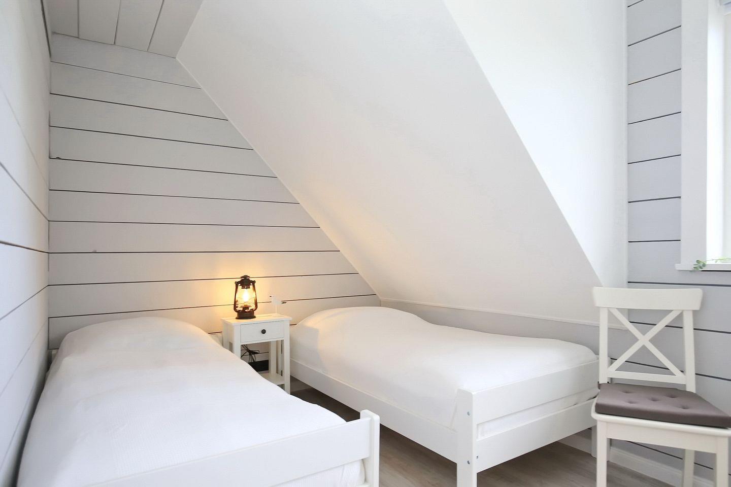 Das erste Schlafzimmer ist mit zwei Einzelbetten (je 90 x 200) ausgestattet. Im zweiten Schlafzimmer der ersten Etage sorgt ein Doppelbett (2x 80 x 200) für erholsamen Schlaf. In beiden Schlafzimmern kannst du in geräumigen Kleiderschränken deine Urlaubsgarderobe unterbringen.