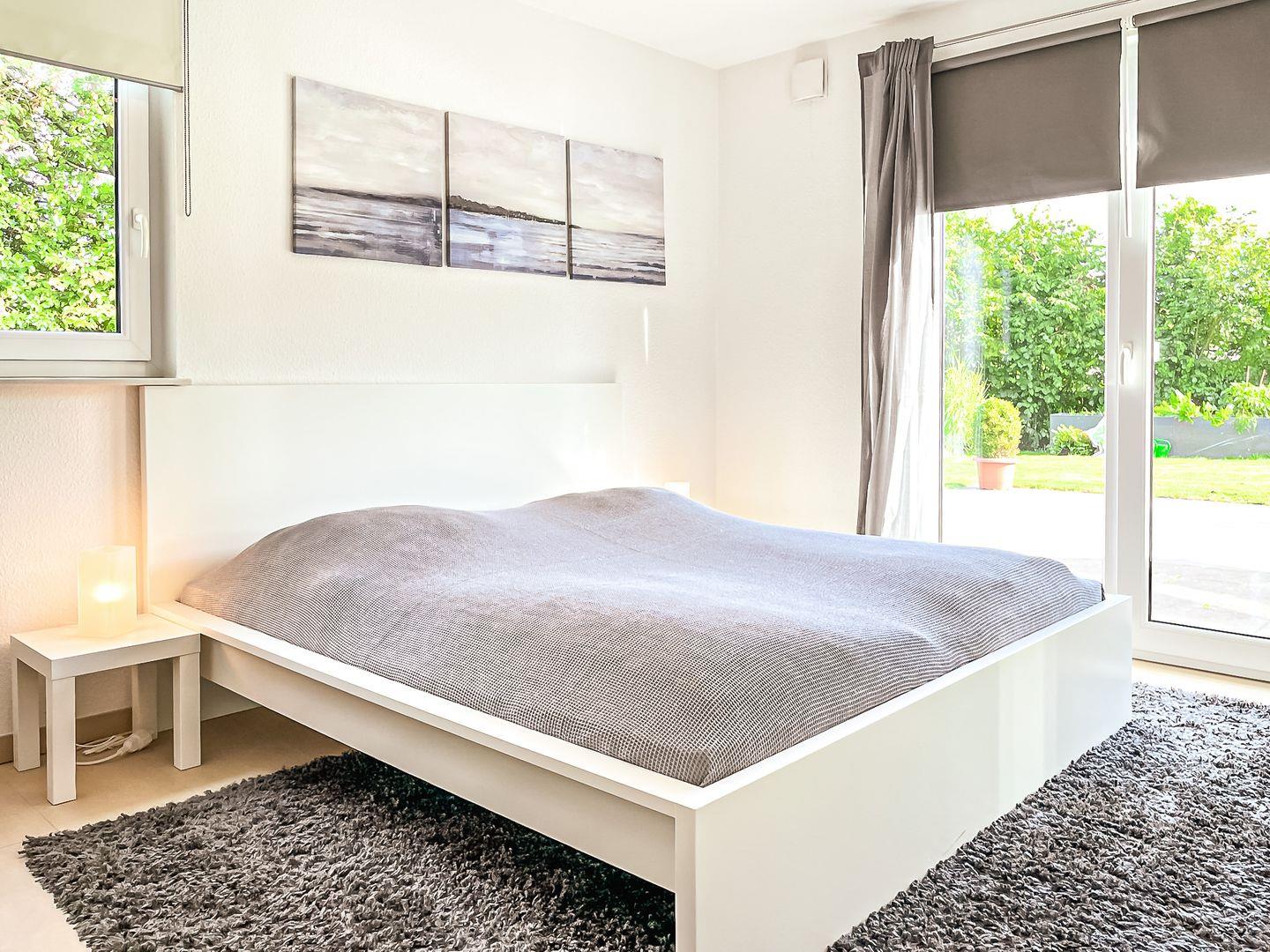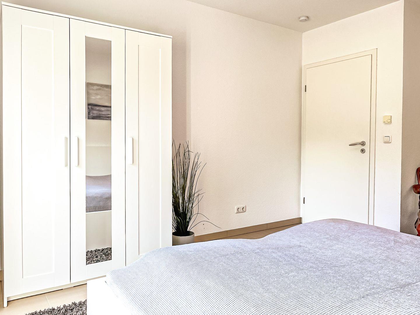 Im ersten Schlafzimmer stehen zwei Einzelbetten (mäßige Höhe) sowie ein Kleiderschrank, welcher genügend Platz für deine Urlaubsgarderobe bietet. Das zweite Schlafzimmer der Ferienwohnung ist mit einem Doppelbett ausgestattet. Ebenfalls steht hier ein geräumiger Kleiderschrank. Von diesem Schlafzimmer aus gelangst du ebenfalls auf die große Terrasse.