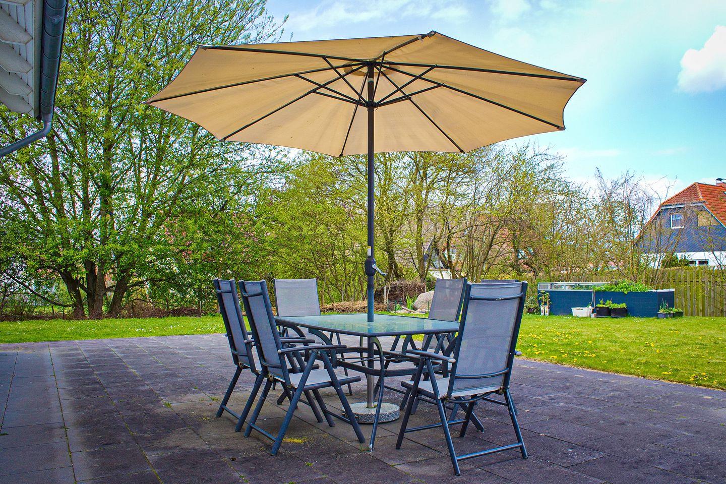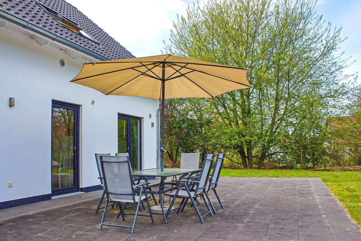 Im gemütlich eingerichteten Wohnzimmer lädt das Sofa mit den Sesseln zum entspannten TV-Abend ein. Für ein gemütliches Ambiente und wohlige Wärme sorgt der Kamin. Vom Wohnzimmer aus gelangst du auf die Nord-Ost-Terrasse. Hier findest du während der Saison Terrassenmöbel und einen Sonnenschirm vor. Ebenfalls kann die hinter dem Haus liegende Wiese zum Spielen genutzt werden.