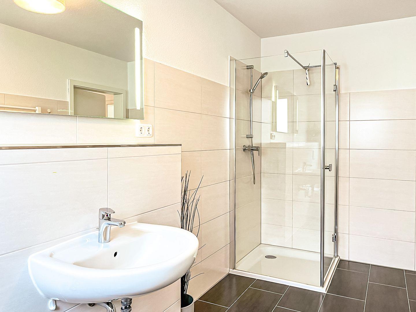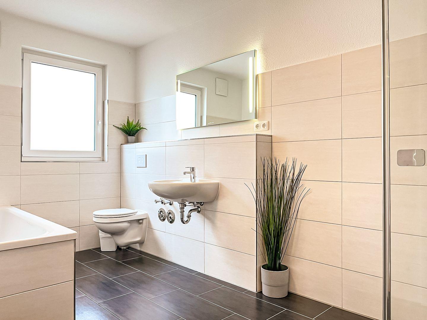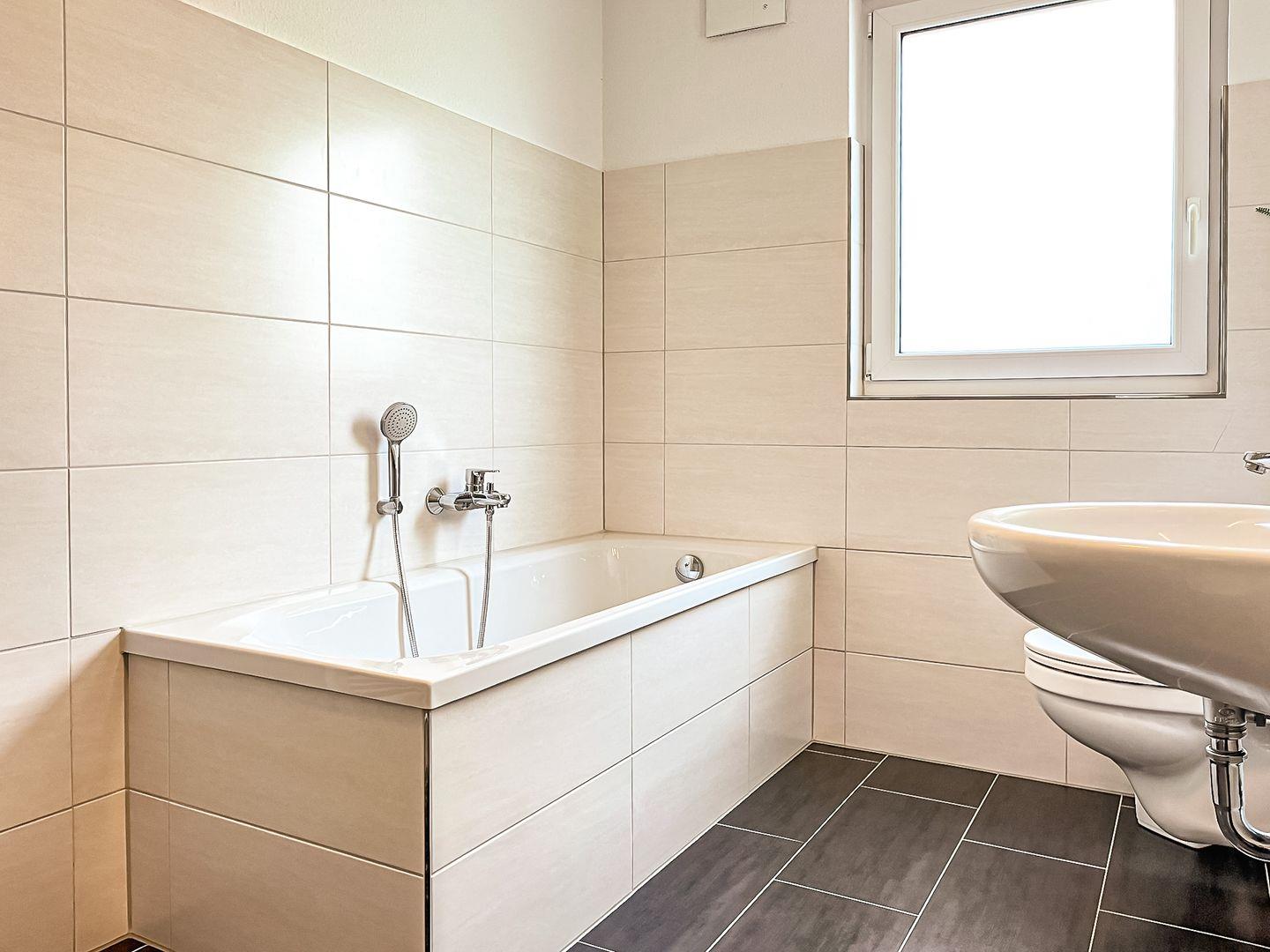 Das helle Duschbad ist geräumig und hat eine Badewanne und eine Dusche. Am Waschtisch findest du genügend Platz für deine Kosmetikartikel.