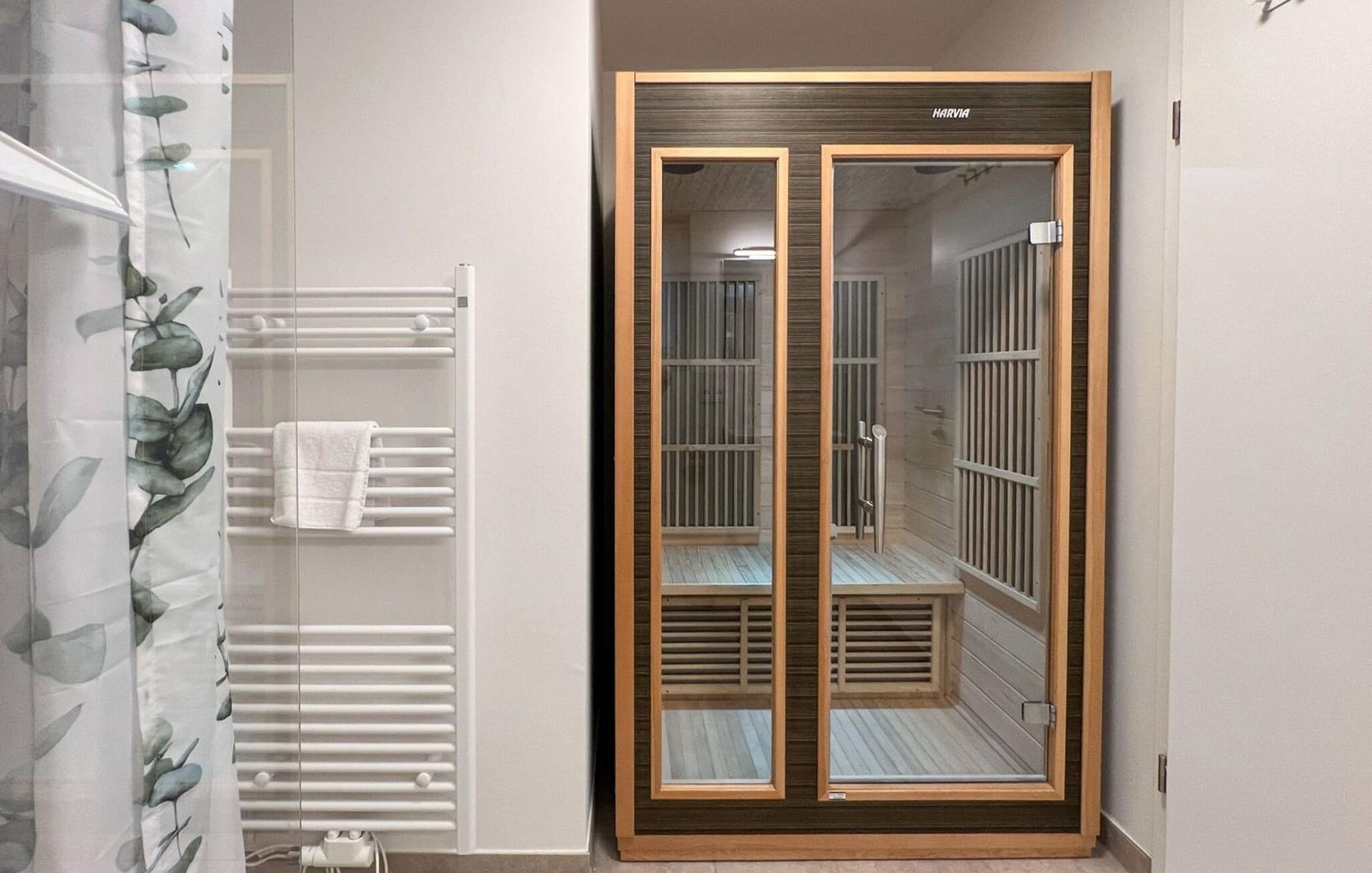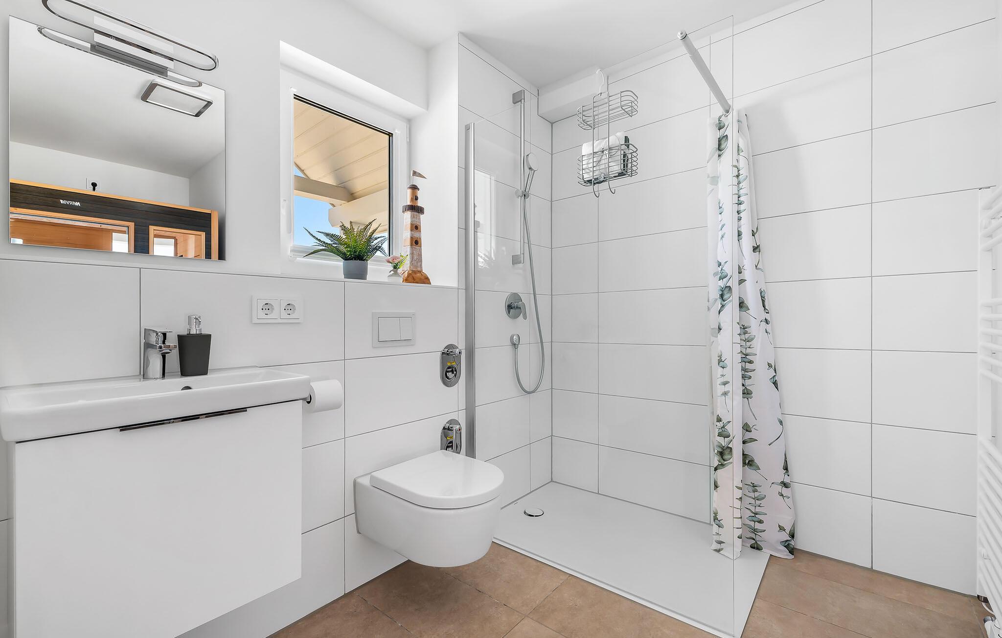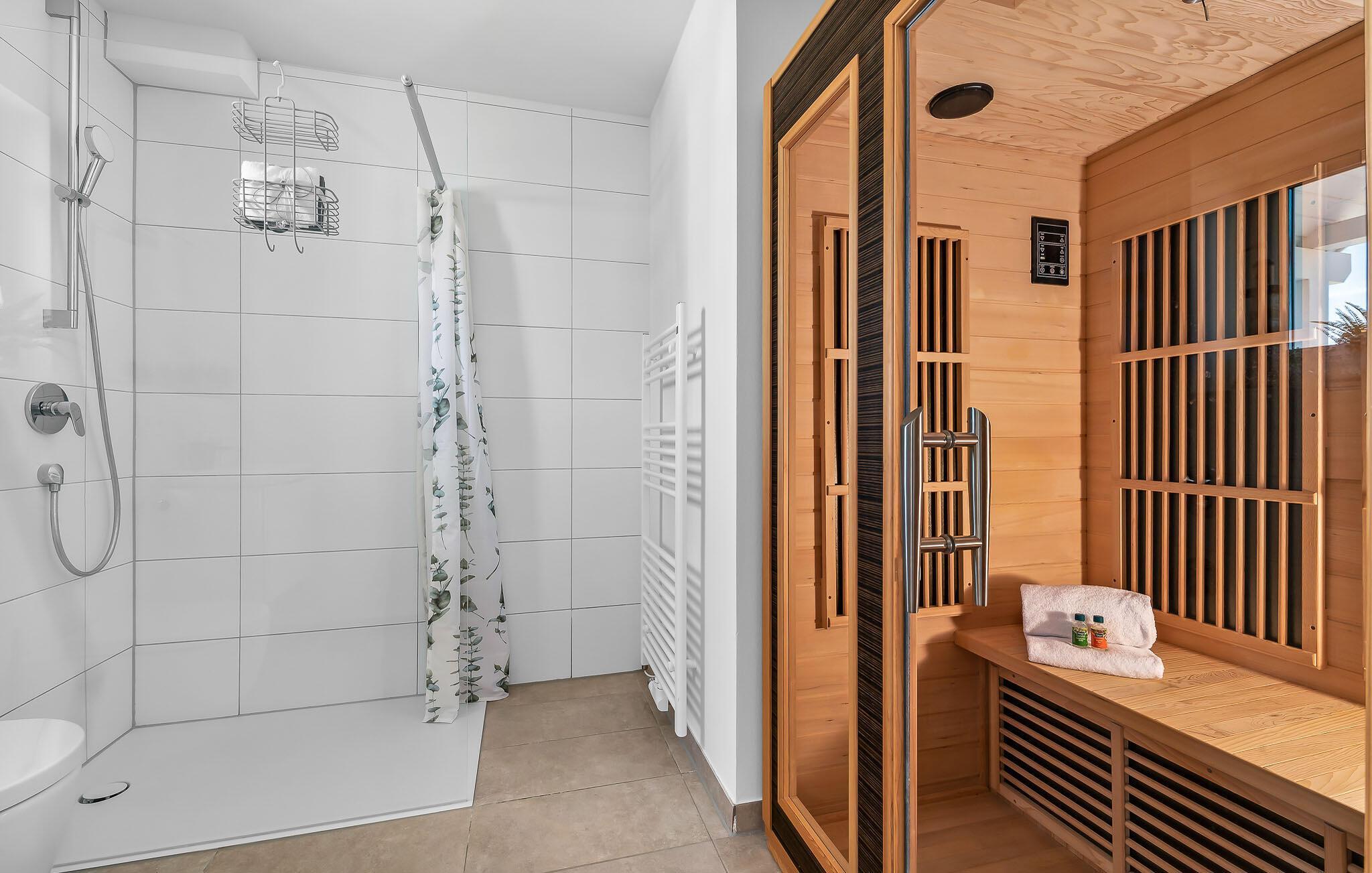 Das Duschbad verfügt über eine bodengleiche Dusche und eine InfrarotSauna (Wärmekabine), in der ihr euch wunderbar erholen könnt.
