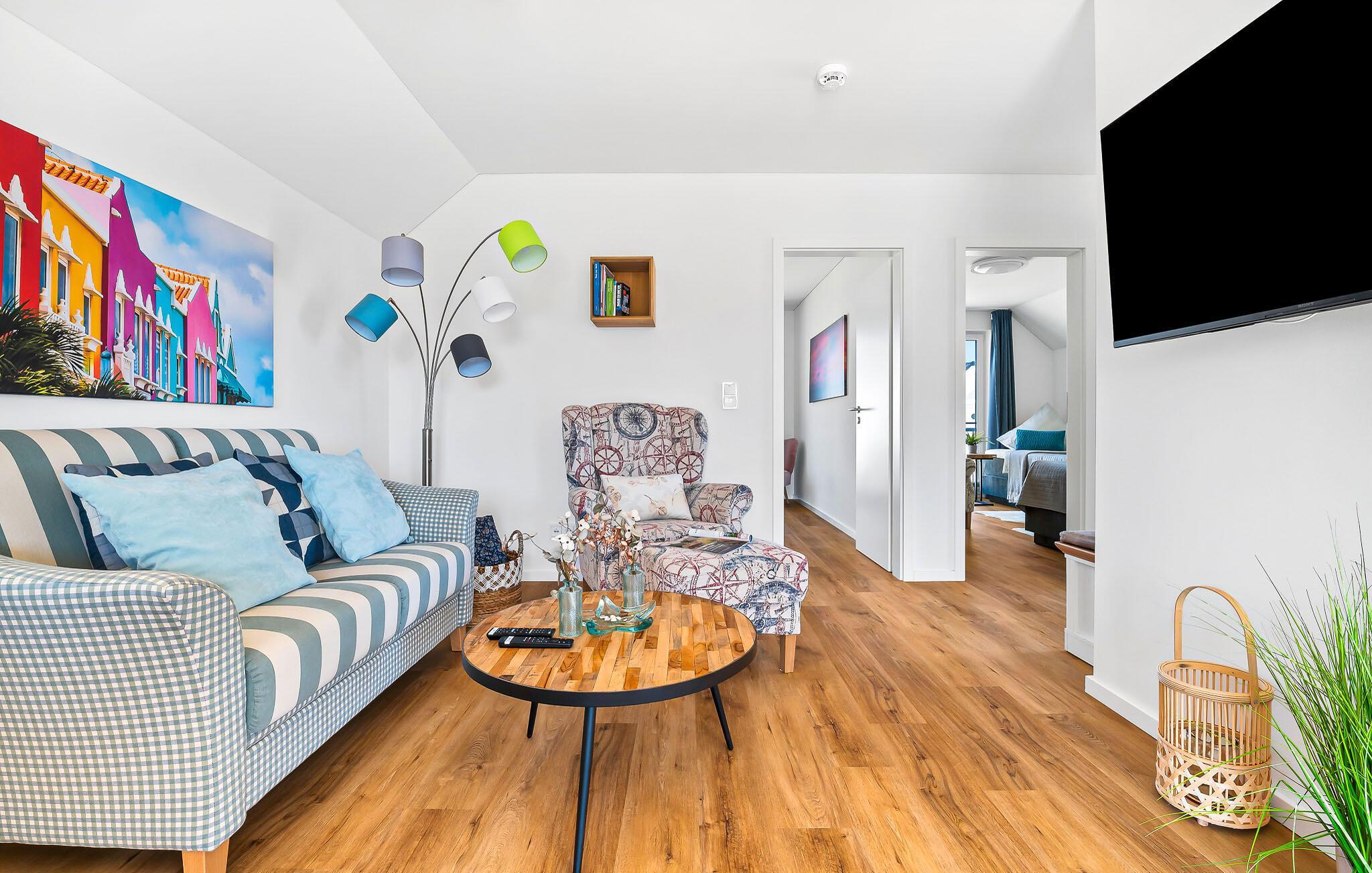 Der große Wohn-/Essbereich der Wohnung ist mit einem gemütlichen Sofa und Sesseln und einem Smart-TV ausgestattet. Dieser verfügt über Netflix und RTL+ Accounts, welches ihr kostenfrei benutzen könnt. Hier könnt ihr euch nach einem ereignisreichen Tag entspannen oder einen gemütlichen Abend mit euren Lieben verbringen. BONAIRE ist mit Highspeed Internet ausgestattet. Und wenn der Fernseher einmal aus bleibt, macht man es sich vor dem Kamin gemütlich.