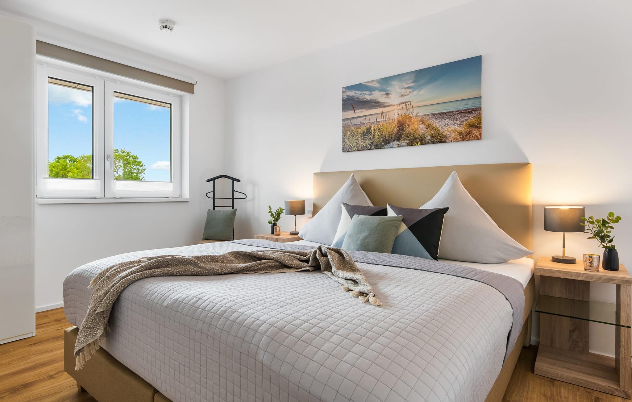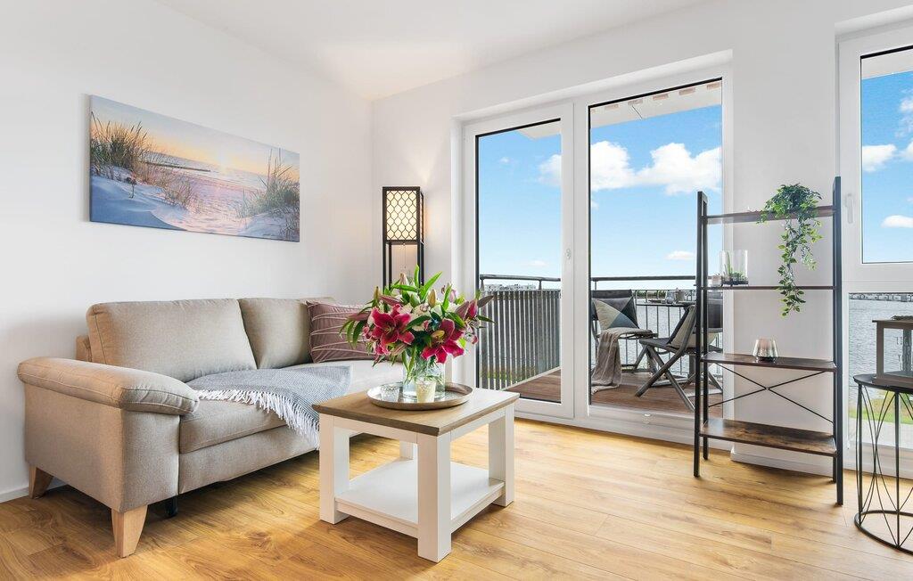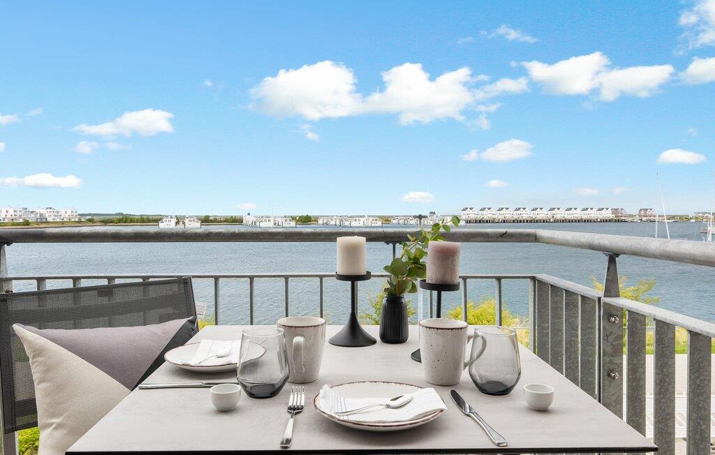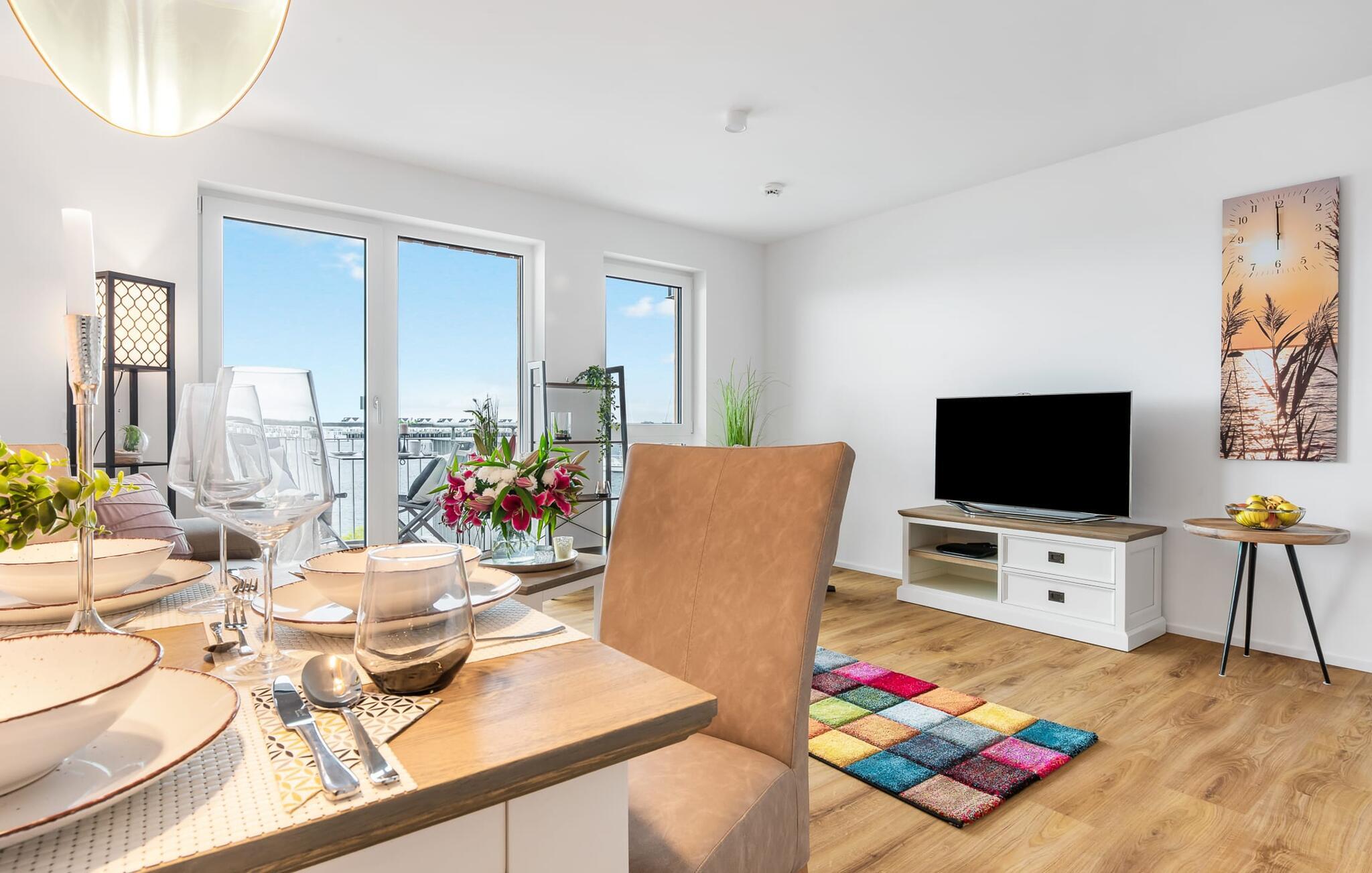 Stilvolle Ferienwohnung mit Balkon und Blick auf OstseeResort Olpenitz und Hafenpromenade.