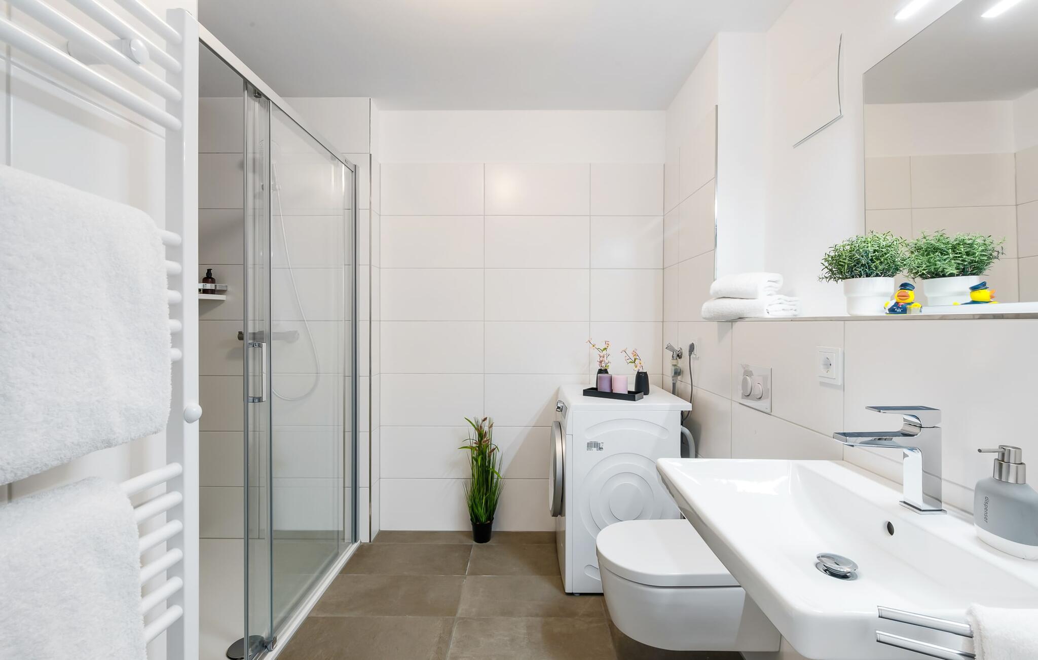 Im Badezimmer befindet sich eine moderne, bodengleiche Dusche, ein Waschtisch mit Unterschrank und ein großer Spiegel.
