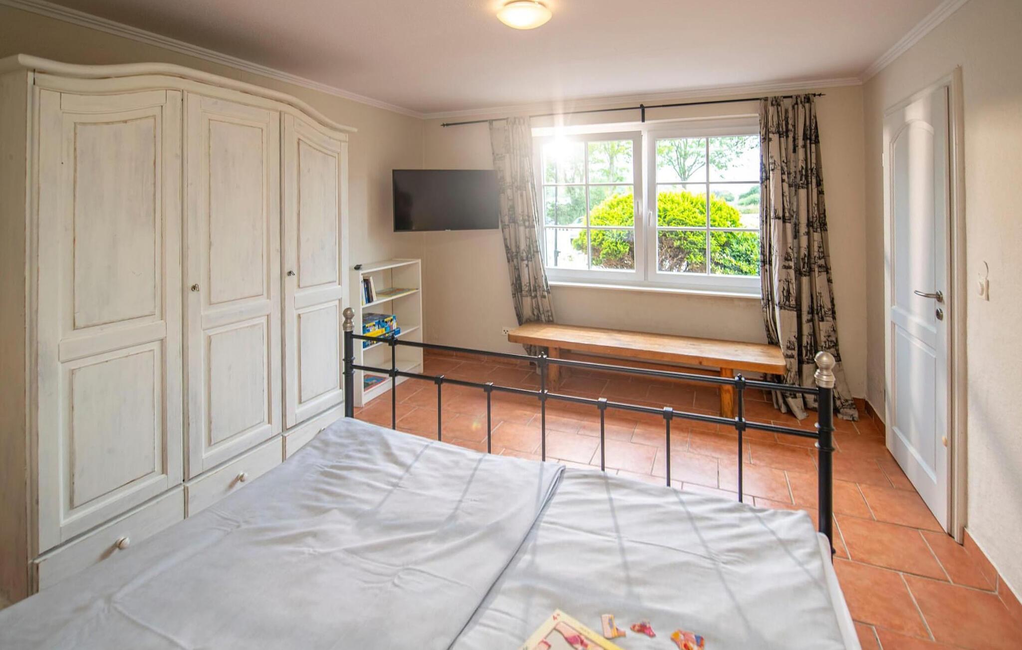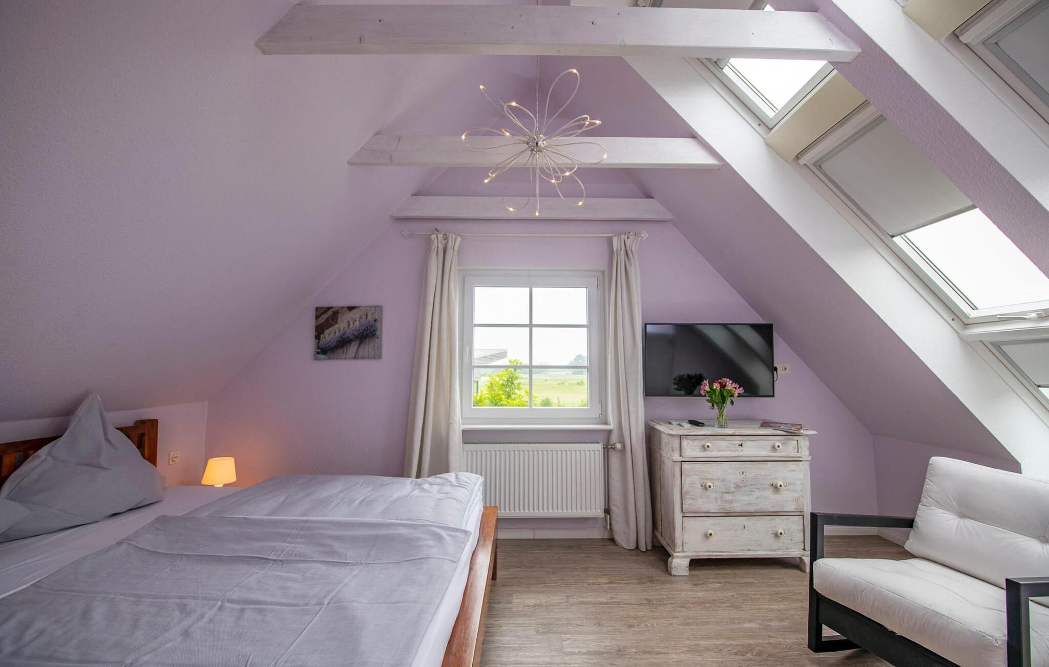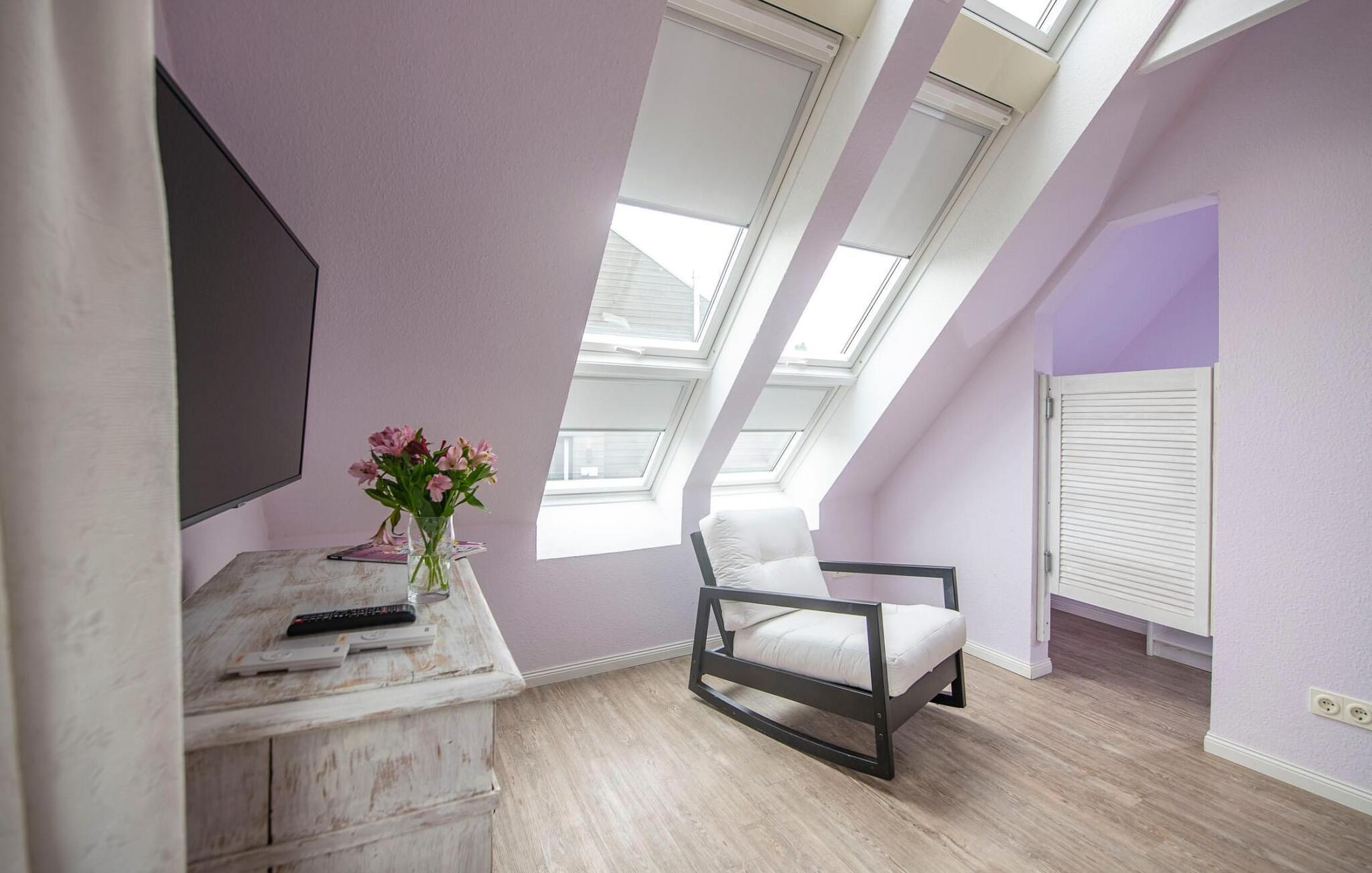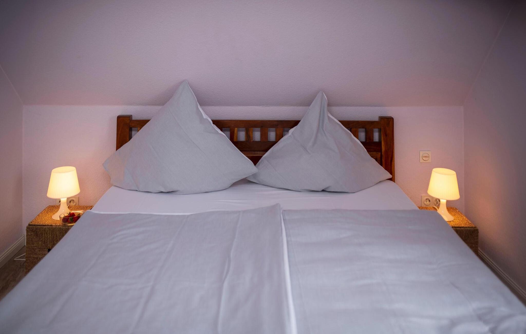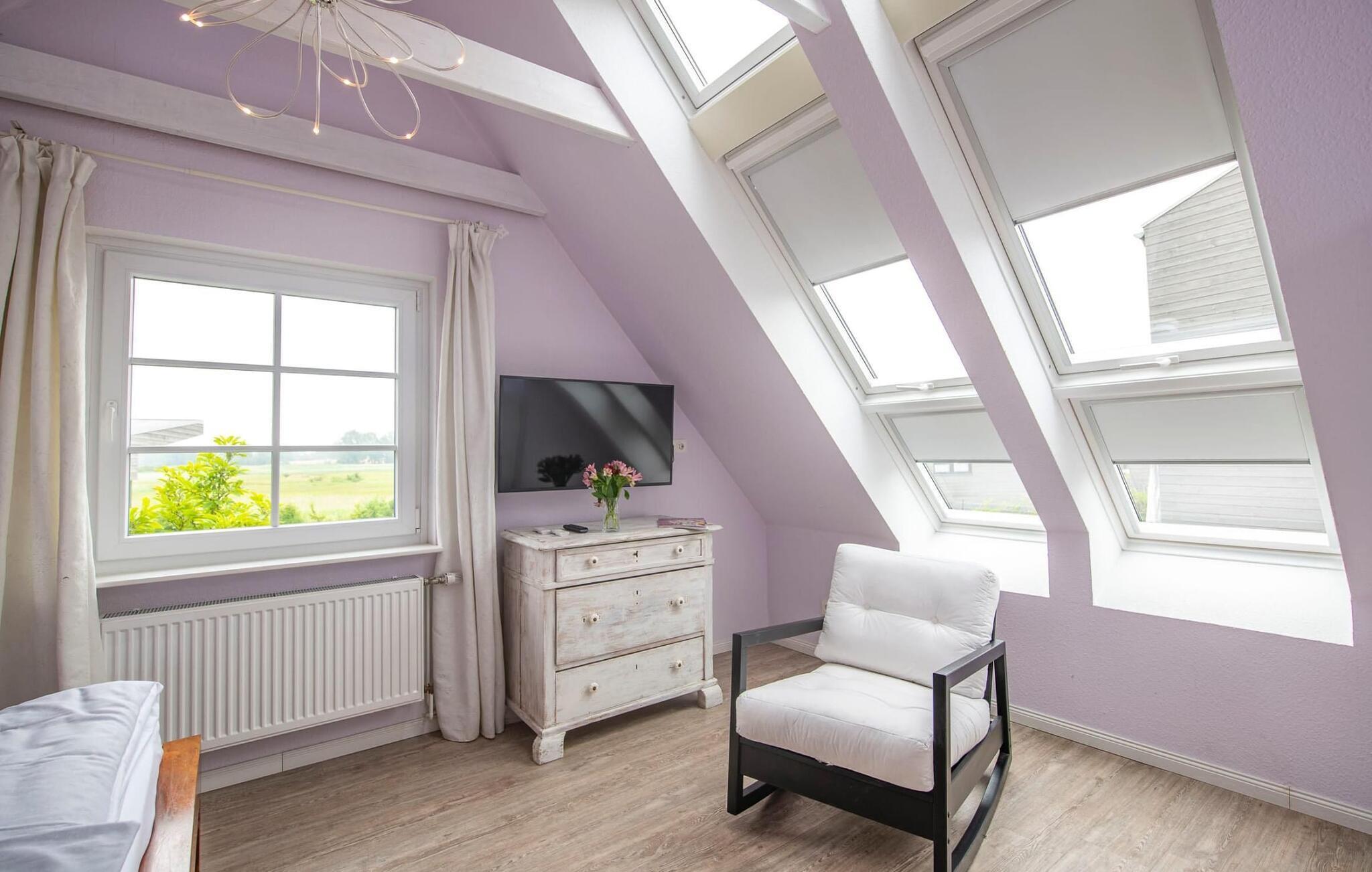 Neben einem großen hellen Schlafzimmer im Erdgeschoss, ermöglicht das zweite Schlafzimmer im Dachgeschoss einen traumhaften Blick in den Sternenhimmel. Durch eine Velux-Fensterfront, die sich bis in die Giebel erstreckt, lässt sich die Milchstraße aus dem Bett heraus erobern. Für 2 weitere Personen steht ein gemütliches Schlafsofa zur Verfügung.