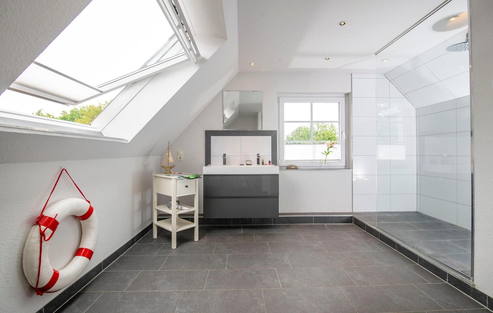 Das Highlight des BOOTSHAUSes stellt das ebenfalls im Dachgeschoss gelegene riesige Badezimmer dar, denn die gläserne Regenwalddusche bietet mit einem phänomenalen Ostseeblick ein unvergessliches Relax-Erlebnis.