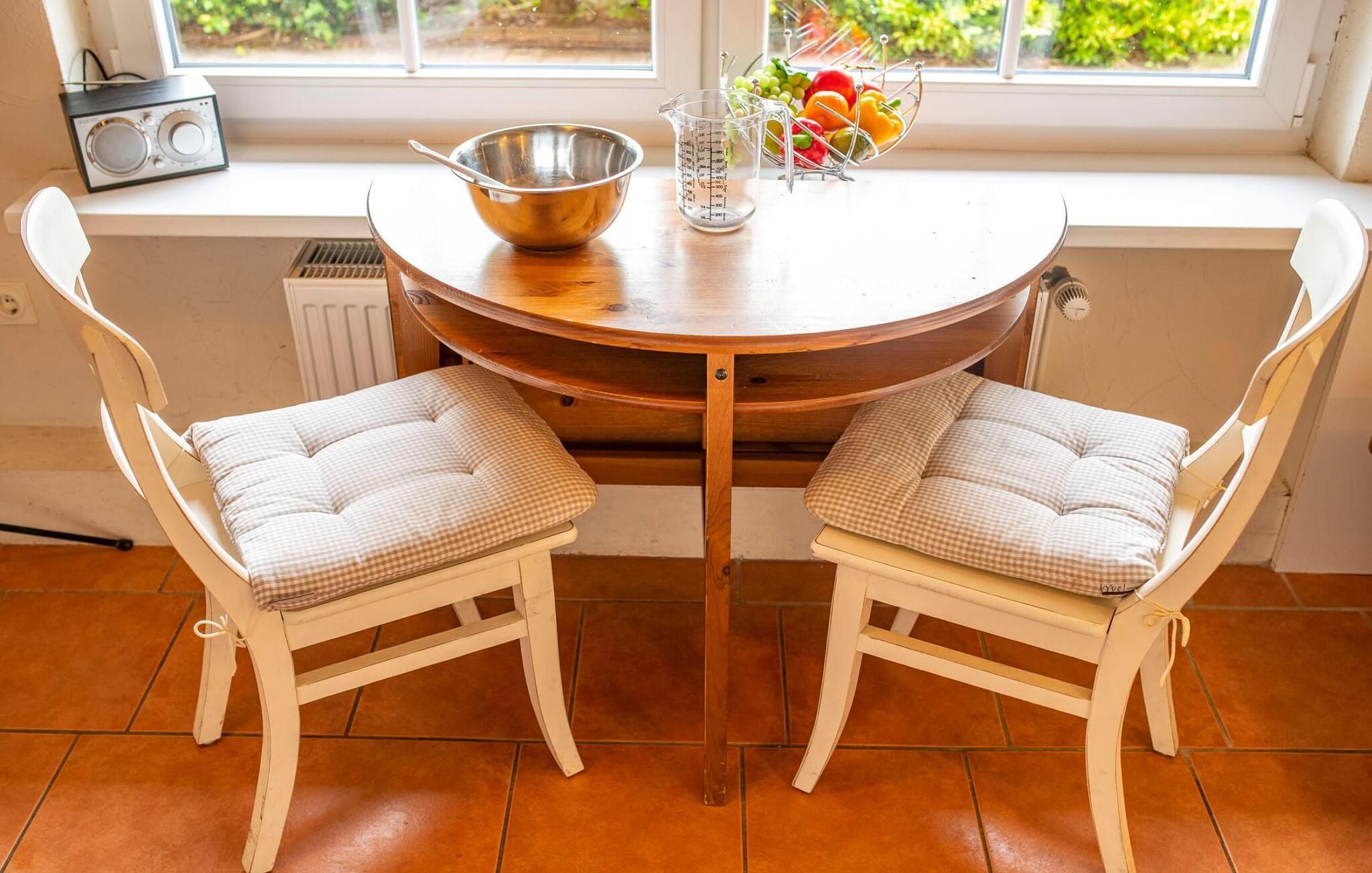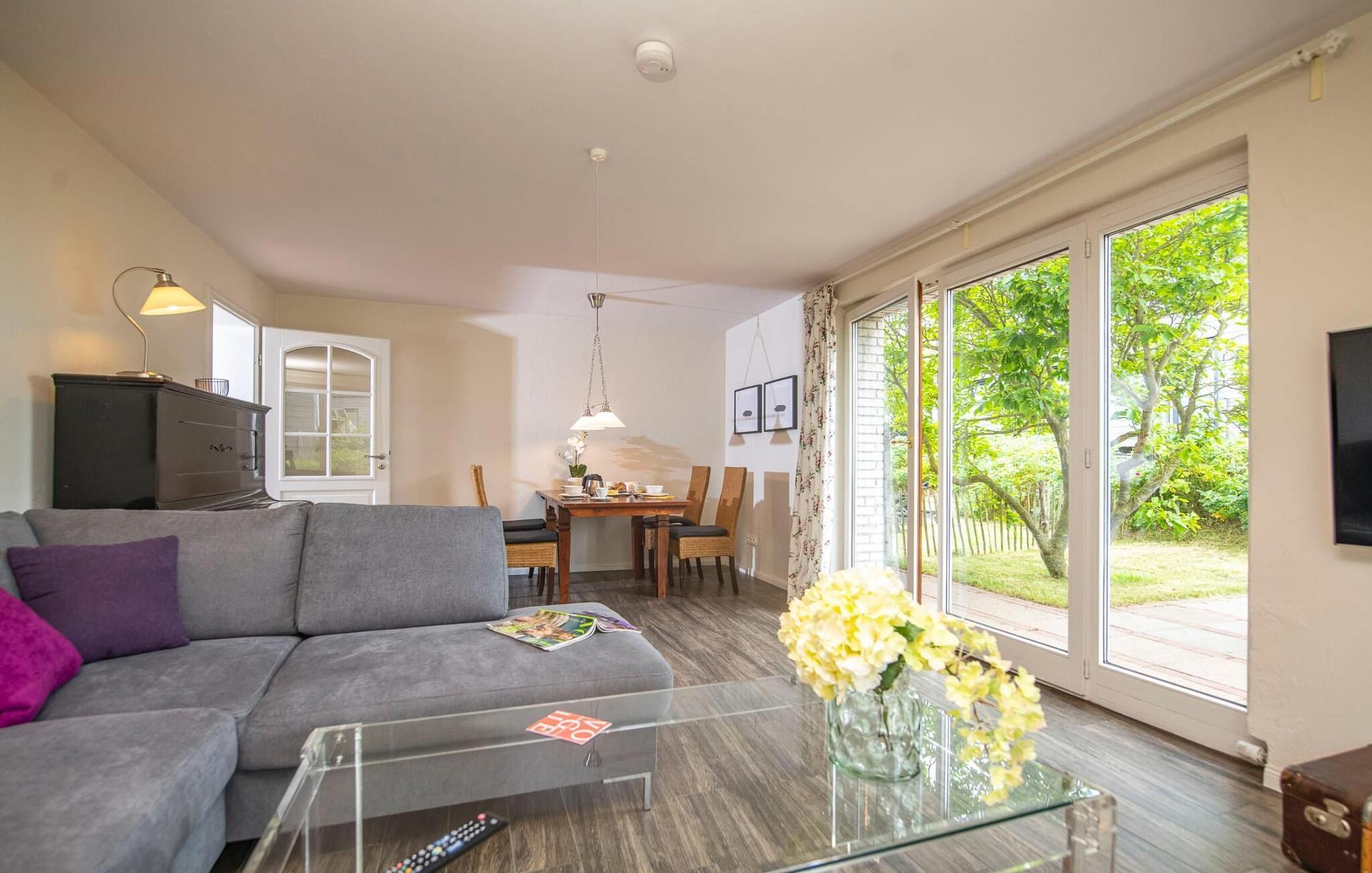 Der geräumige und stilvoll eingerichtete Wohn- und Essbereich des Ferienhaus BOOTSHAUS lädt mit Blick auf die Terrasse und in den Garten zum Verweilen ein, während ein antikes Klavier an Seemannslieder erinnert. An ungemütlichen Herbst-/Winterabenden spendet die Fußbodenheizung im gesamten Untergeschoss wohltuende Wärme.