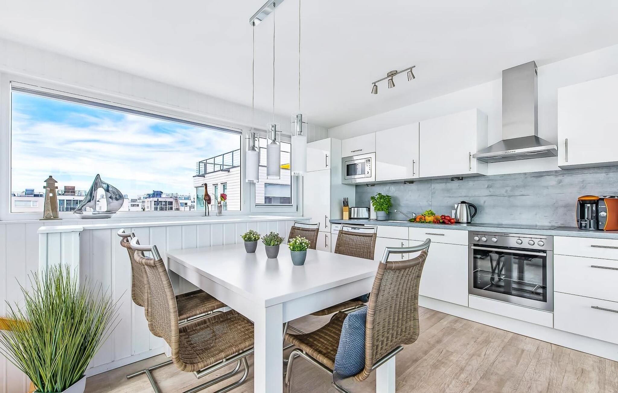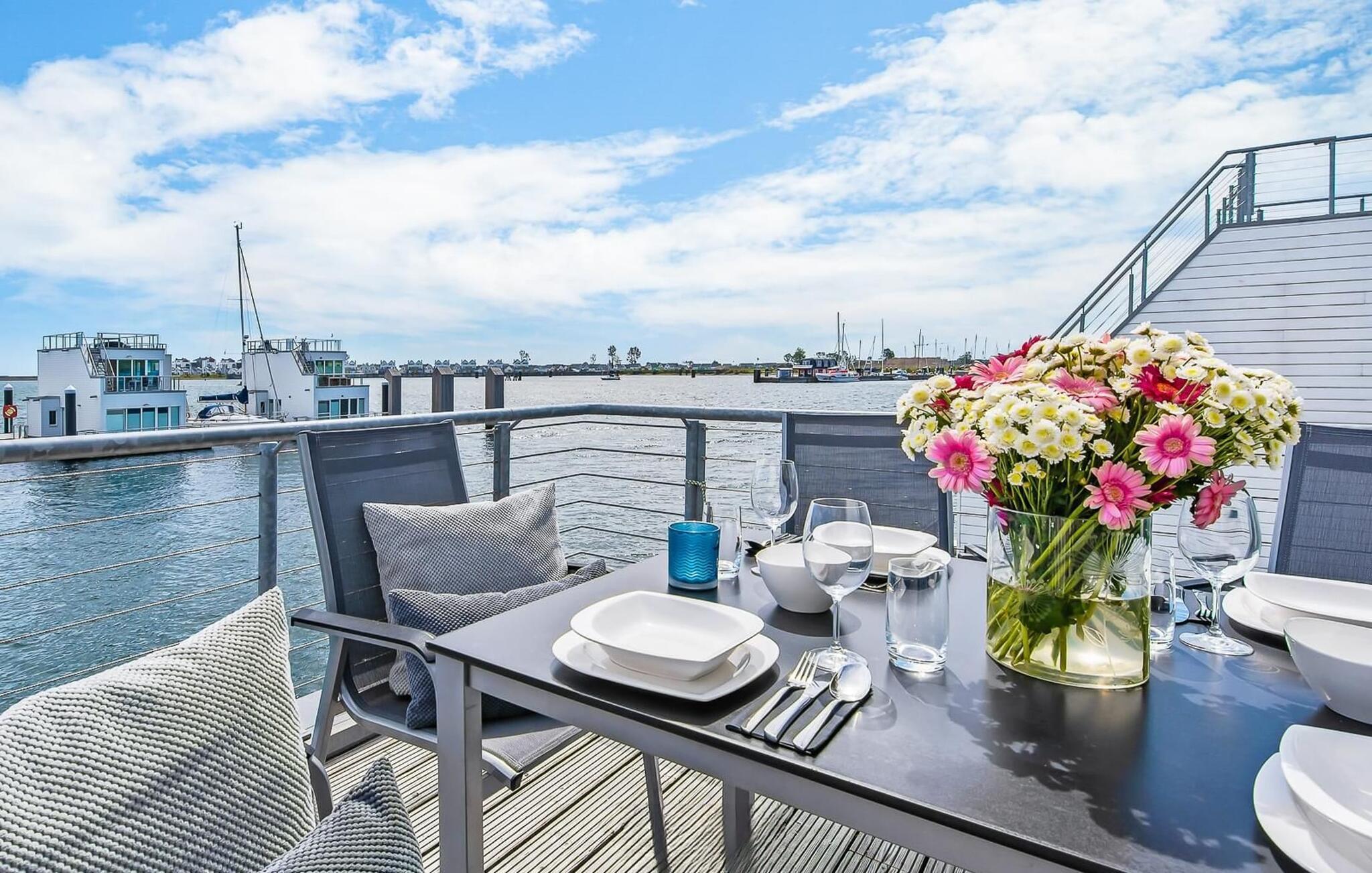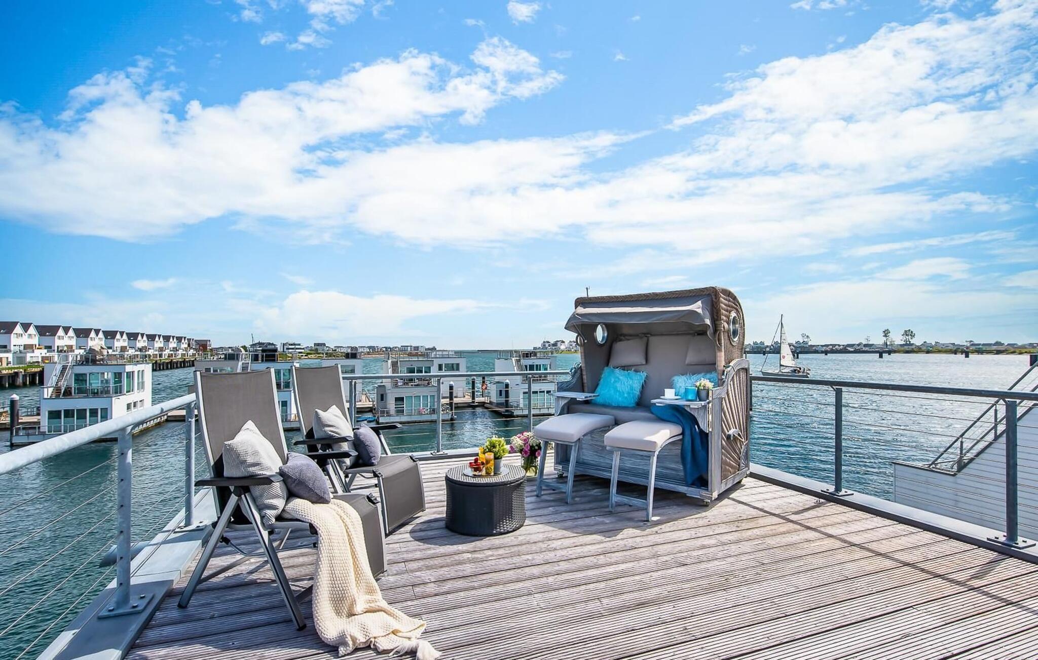 Ein besonderes Highlight stellt die große Dachterrasse mit Rundum-Wasserblick und ganztags Sonne dar. Der weiße Sandstrand des Ostseeresorts befindet sich nur einige hundert Meter entfernt. Das charmant eingerichtete Hausboot sorgt für schnelles Ankommen und sofortiges Wohlfühlen.