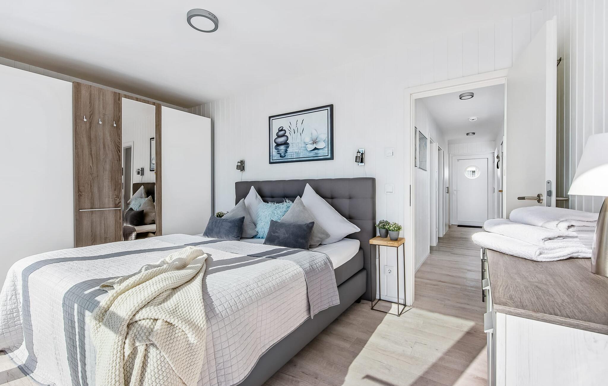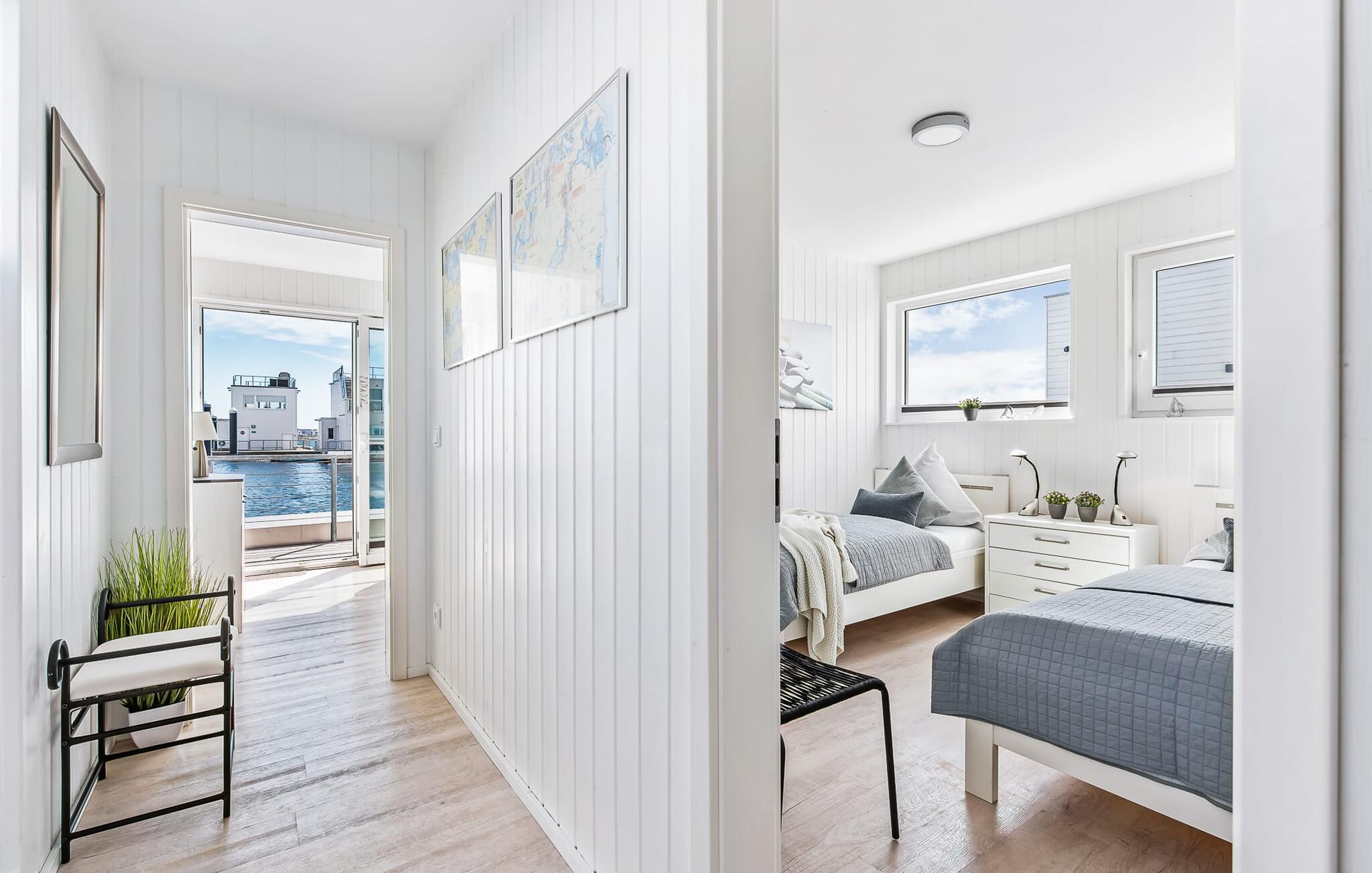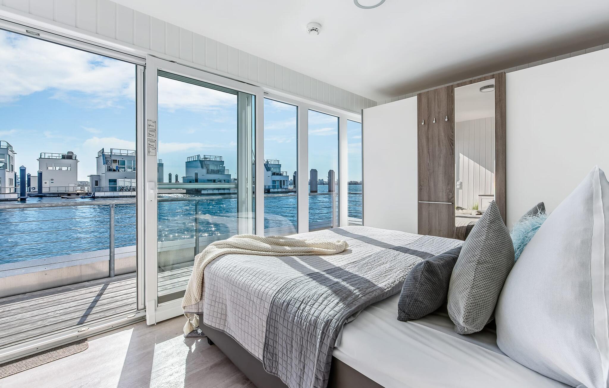 Der Schlafbereich des schwimmenden Ferienhauses befindet sich im Erdgeschoss. Auch während des Erholungsschlafes genießt der Gast maximalen Urlaubskomfort: Im Hauptschlafzimmer, welches mit einem Doppel-Boxspringbett ausgestattet ist, eröffnen bodentiefe Fenster vor unmittelbarer Wasserkulisse neue Perspektiven. Über eine Terrassentür ist von hier aus die umläufige Begehung des Hauses möglich. Das zweite Schlafzimmer verfügt über zwei bequeme Einzelbetten; des Weiteren bietet das Schlafsofa im Wohn- und Essbereich einen weiteren großzügigen Schlafplatz.