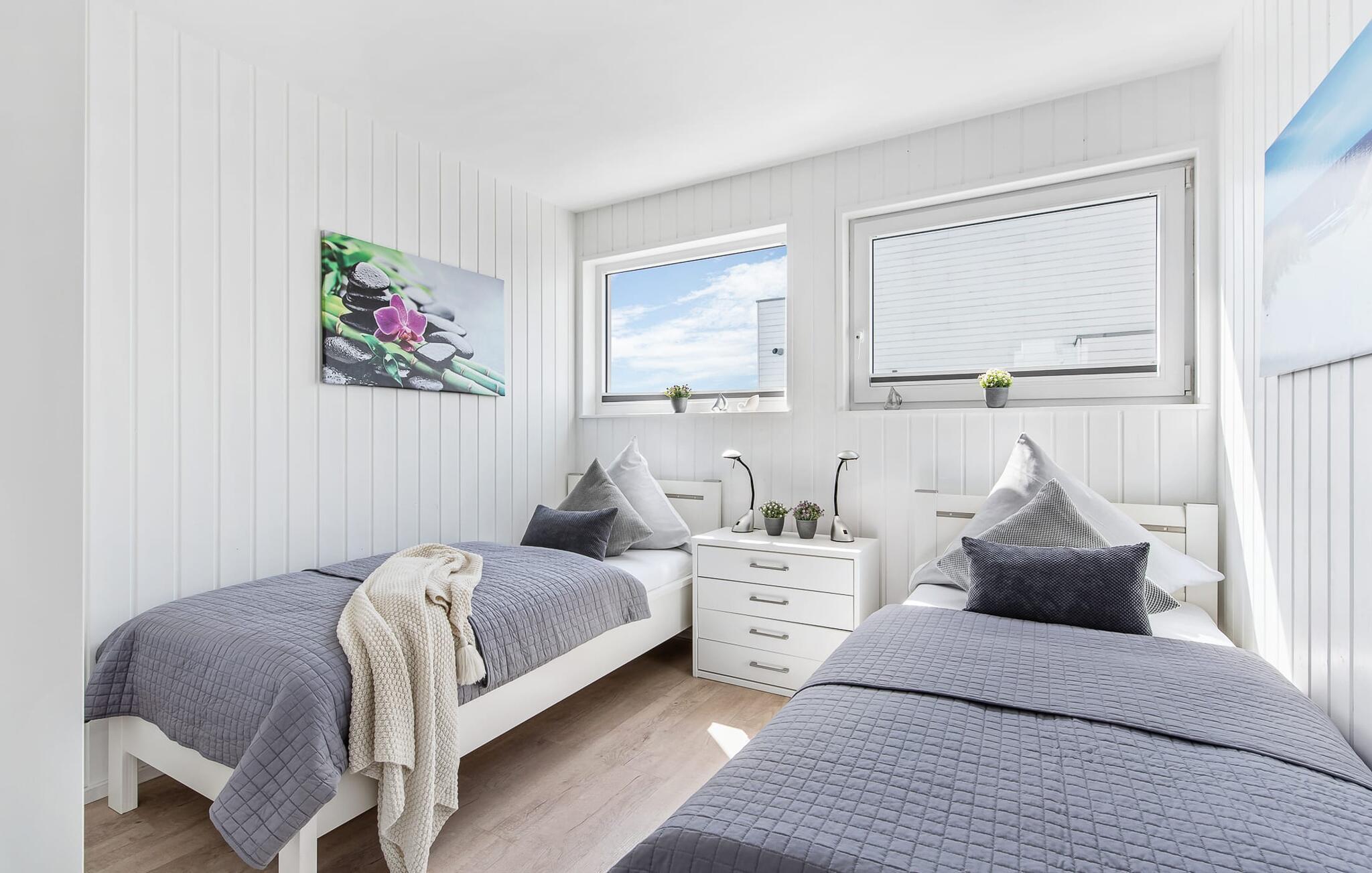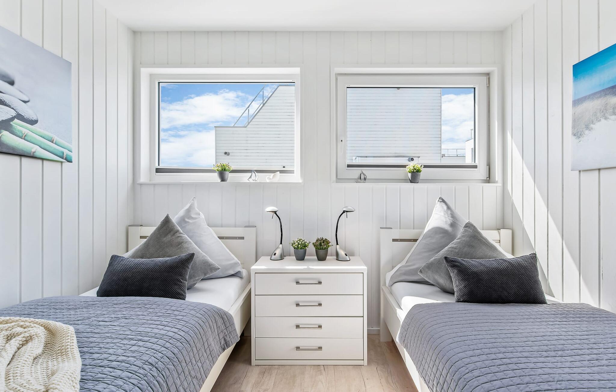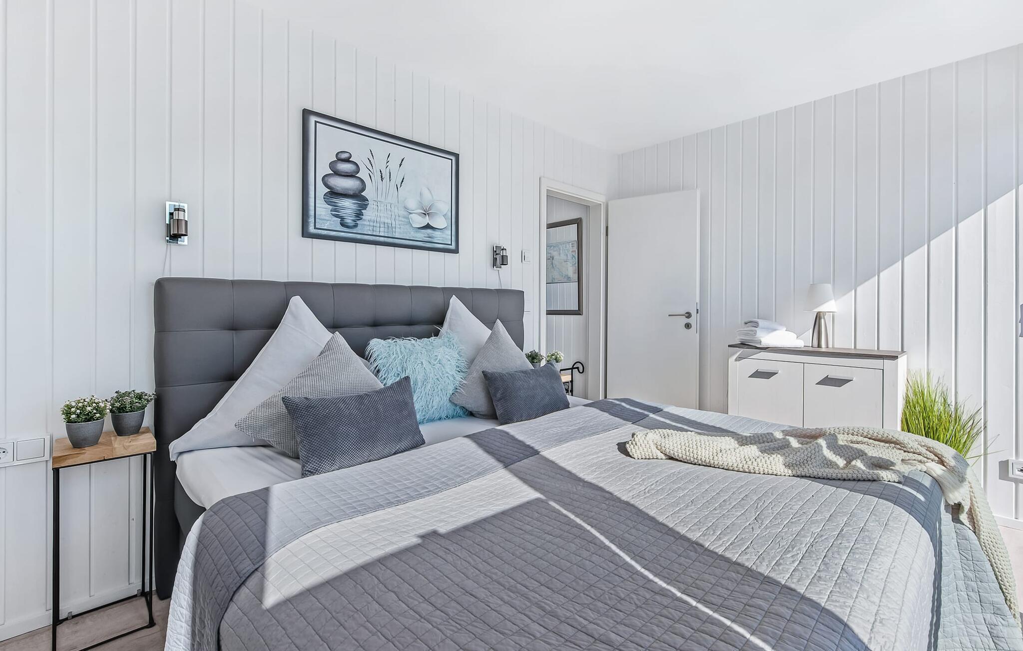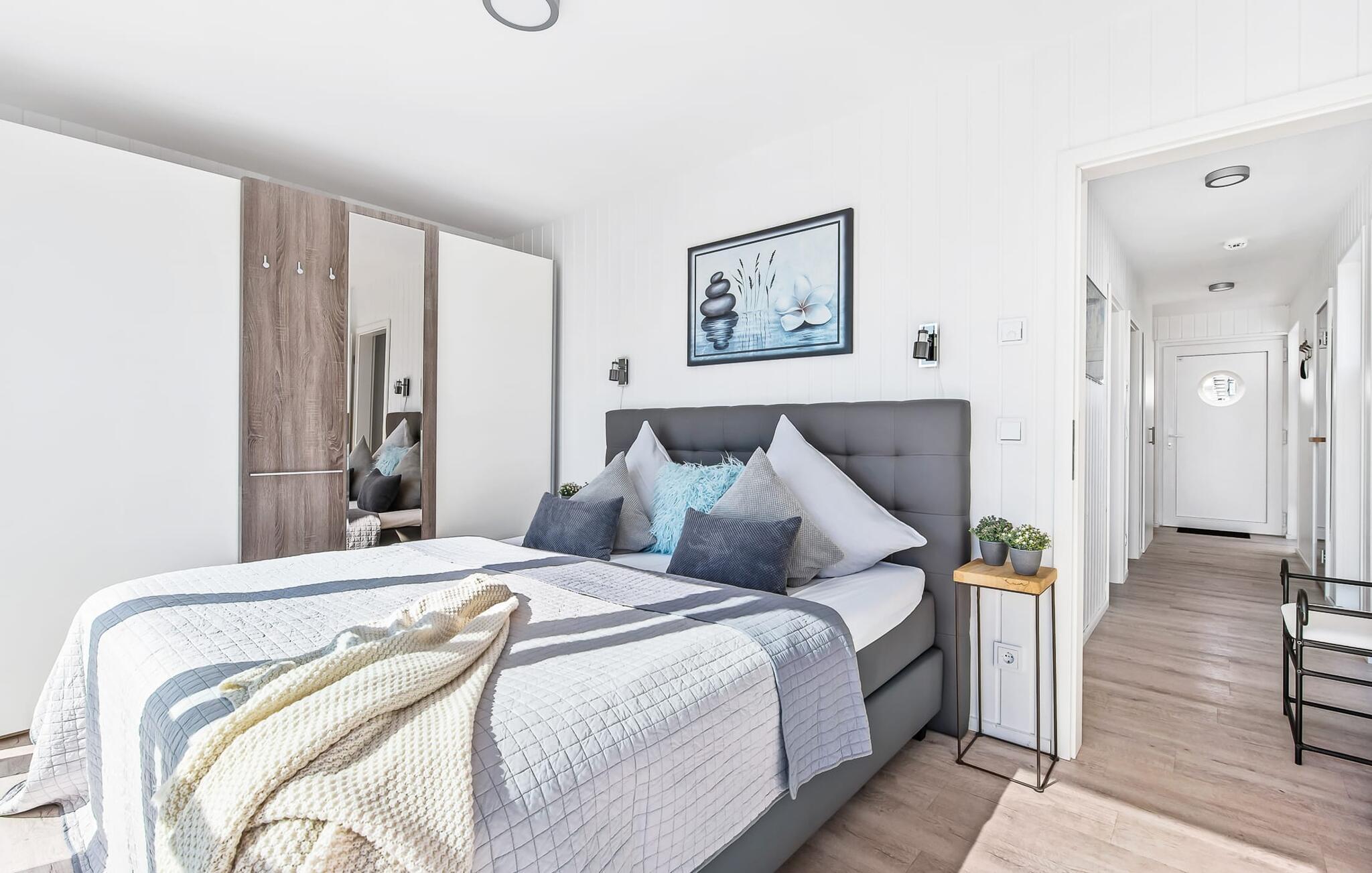 Der Schlafbereich des schwimmenden Ferienhauses befindet sich im Erdgeschoss. Auch während des Erholungsschlafes genießt der Gast maximalen Urlaubskomfort: Im Hauptschlafzimmer, welches mit einem Doppel-Boxspringbett ausgestattet ist, eröffnen bodentiefe Fenster vor unmittelbarer Wasserkulisse neue Perspektiven. Über eine Terrassentür ist von hier aus die umläufige Begehung des Hauses möglich. Das zweite Schlafzimmer verfügt über zwei bequeme Einzelbetten; des Weiteren bietet das Schlafsofa im Wohn- und Essbereich einen weiteren großzügigen Schlafplatz.