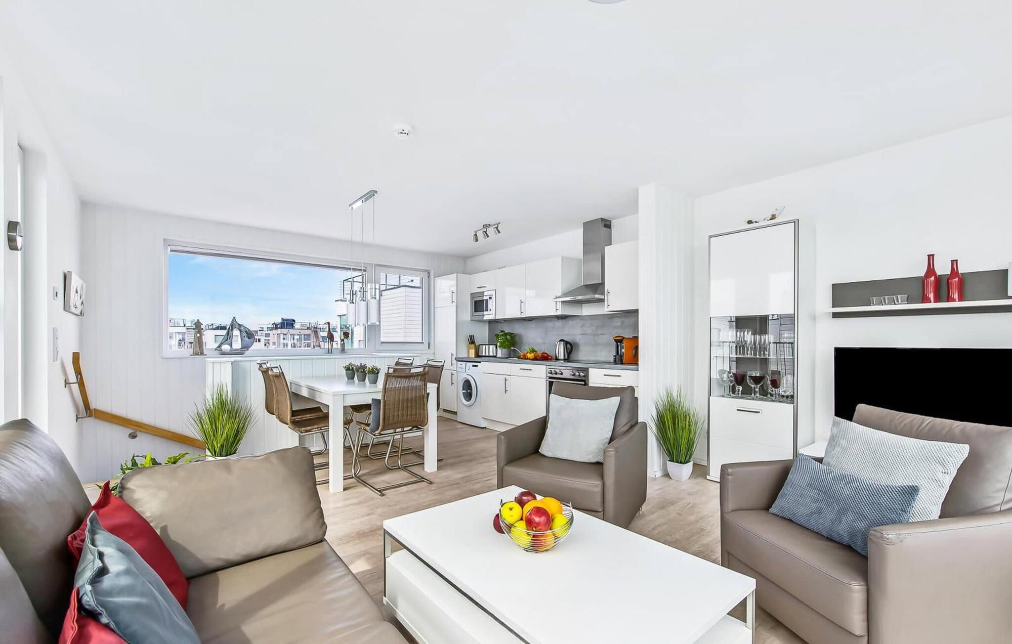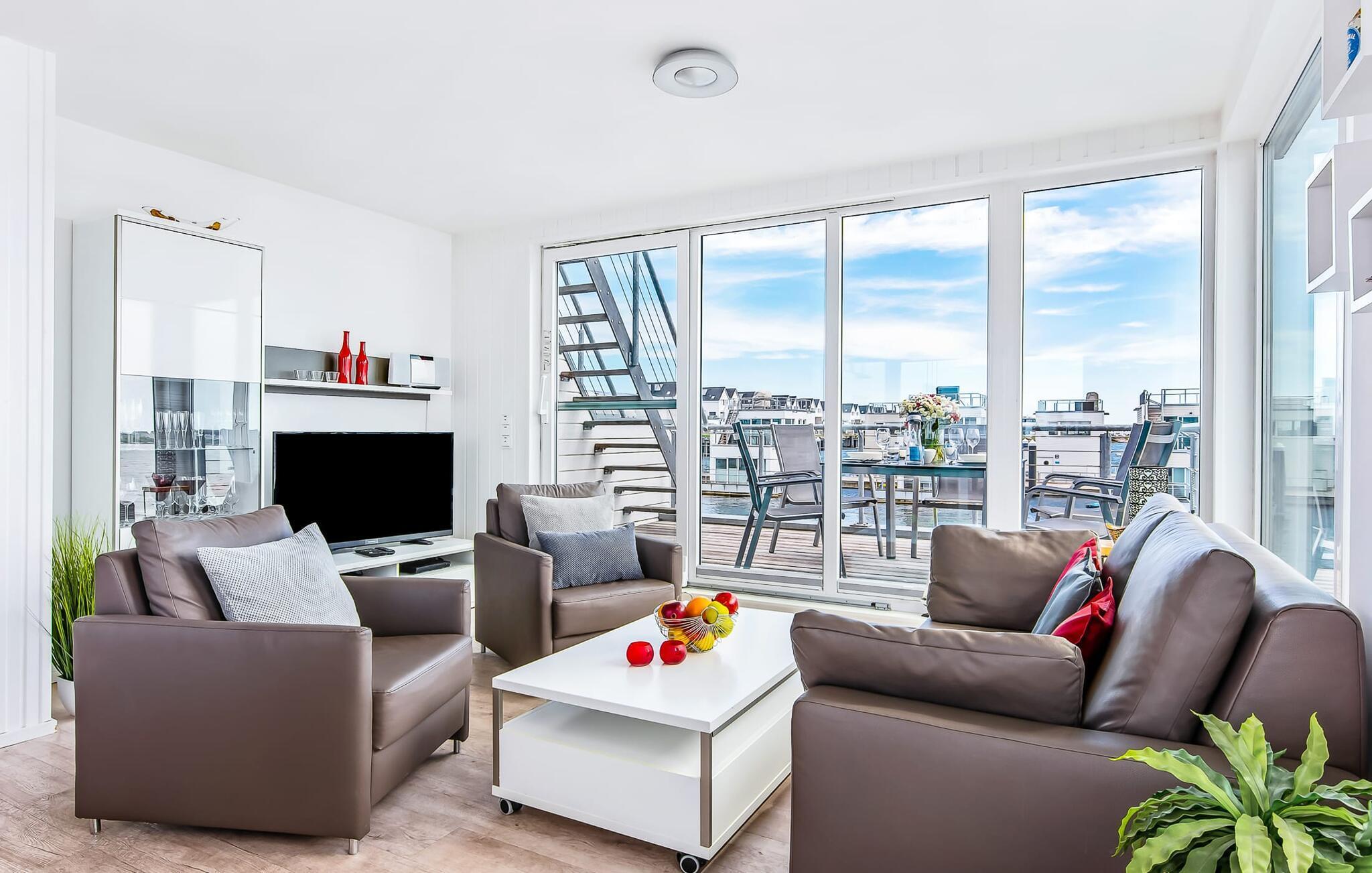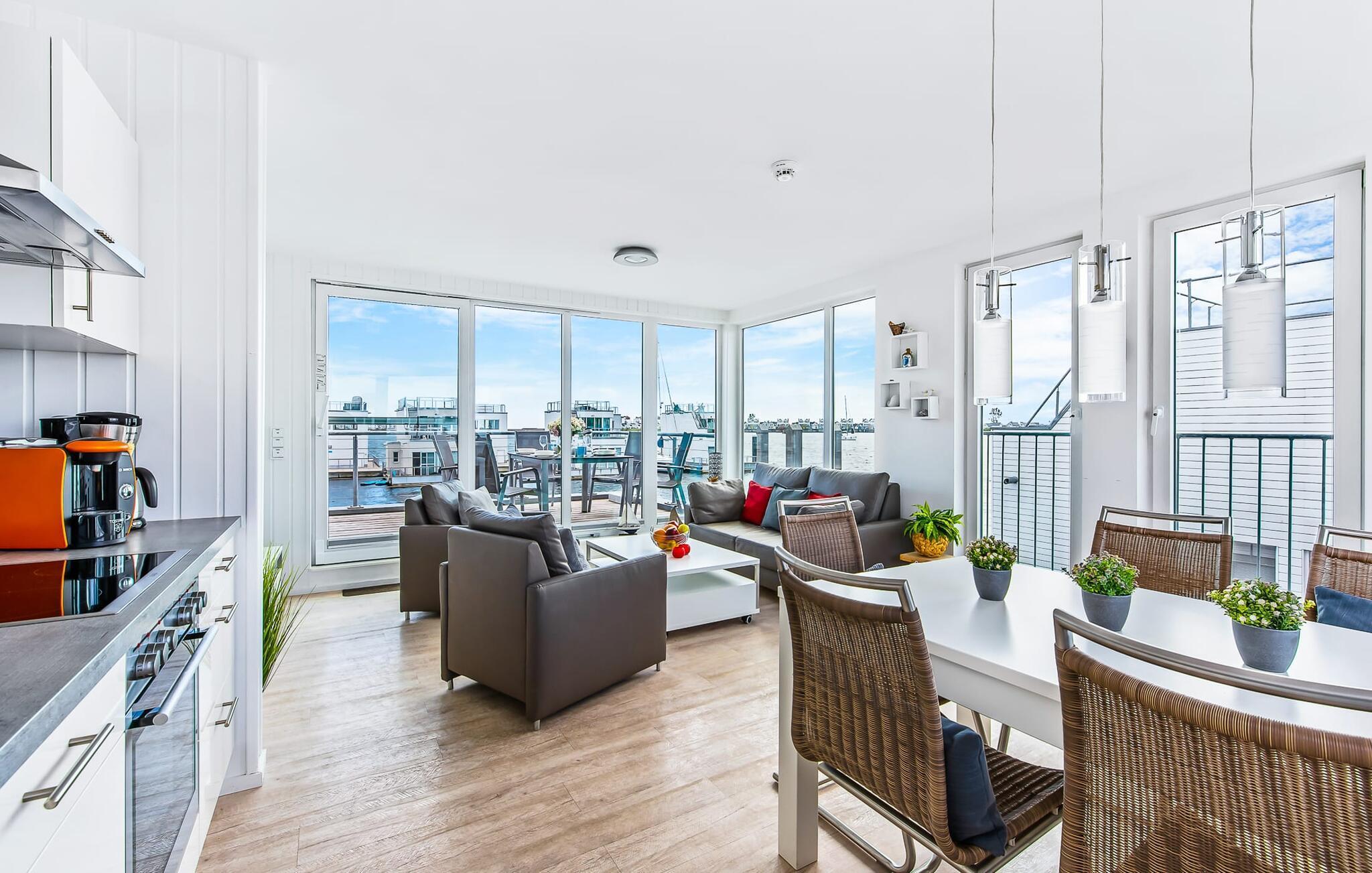 Der offen und freundlich gestaltete Wohn- und Essbereich im ersten Obergeschoss ist das Herzstück des schwimmenden Ferienhauses. Großzügige Fensterfronten bieten einen tollen Blick auf den Segel- und Sportboothafen. Sonnenschein und immer eine frische Brise Meer gibt es auf der angrenzenden Holzterrasse. Zusätzlich bietet die Terrasse bewegende Ansichten, wenn die Segel- und Sportboote vorbeischippern. Von hieraus gelangt man über eine Außentreppe auf die 30 m² große Dachterrasse mit vielen Sonnenstunden, einen rundum Blick über die Marina sowie auf Schlei und Ostsee. Und für die nordischen Schietwettertage gibt es das kompakte Home Entertainment Programm der Telekom.