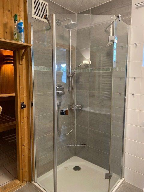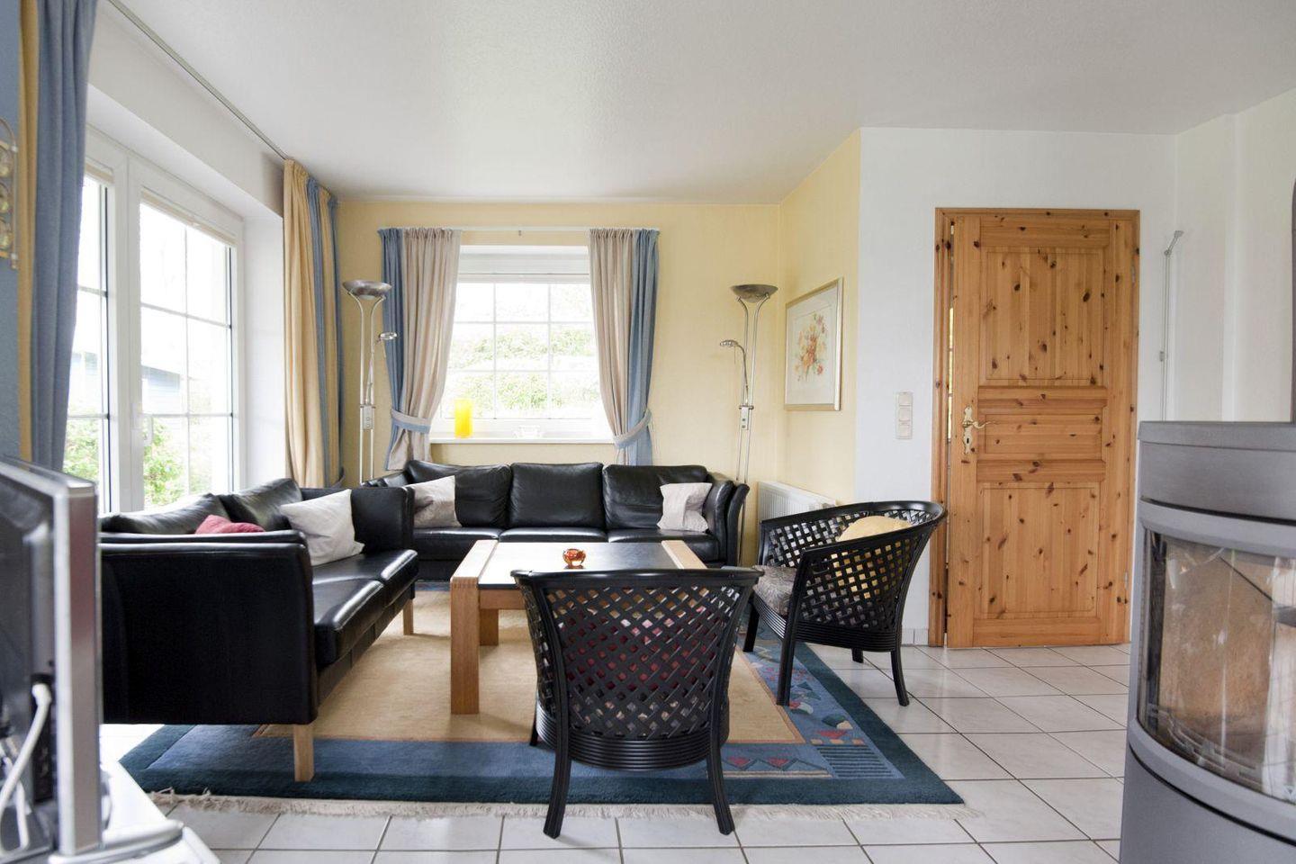 Der großzügige Wohnraum mit offener Küche und Kaminofen ist hell gestaltet und lichtdurchflutet. Das untere Bad verfügt über eine Dusche und eine Sauna.