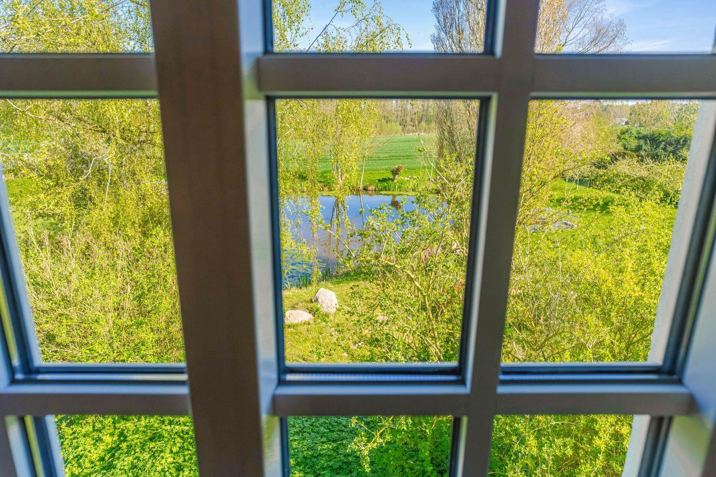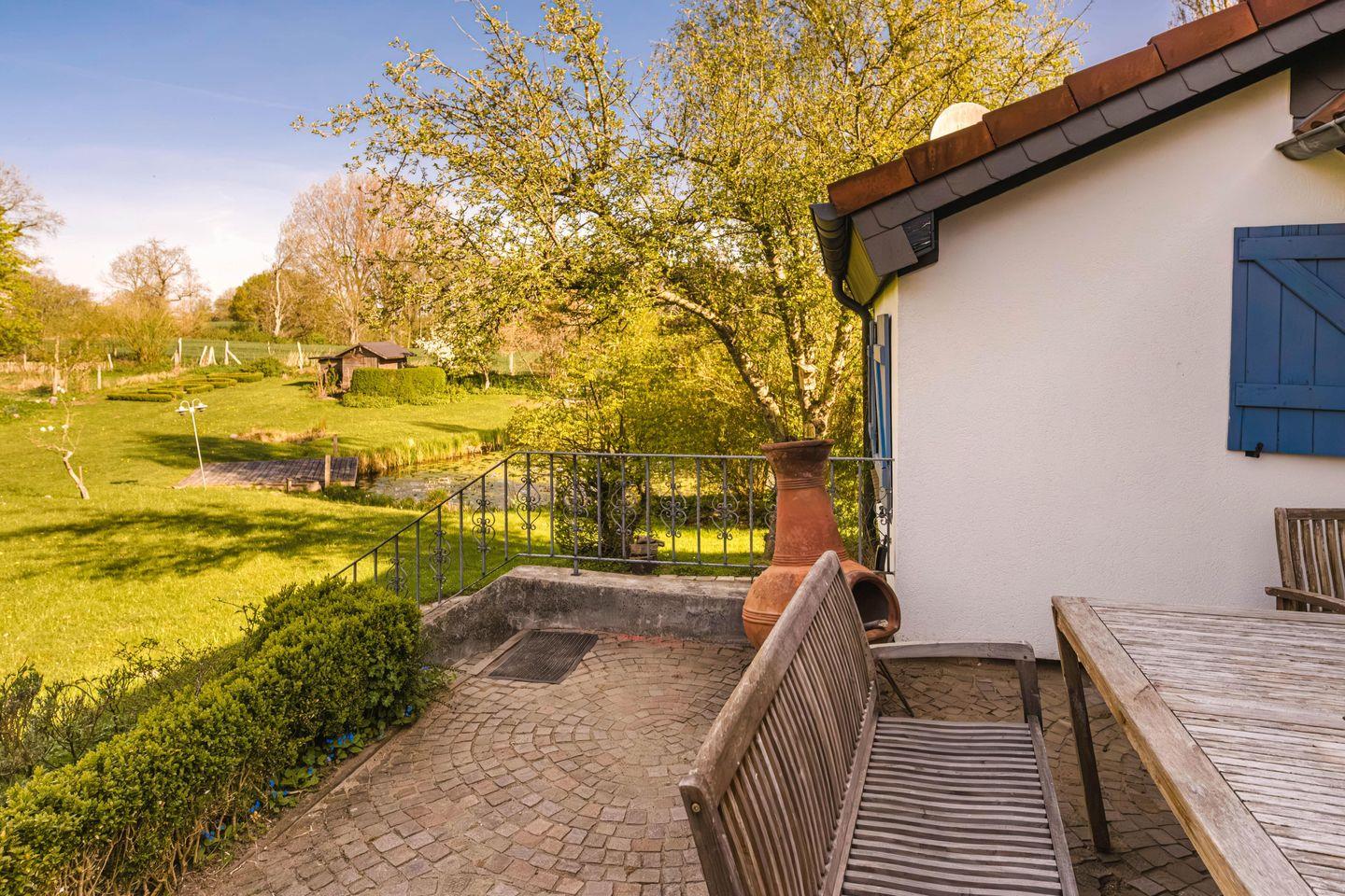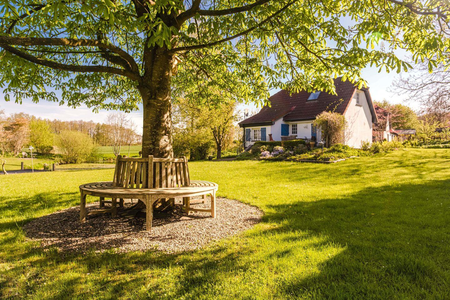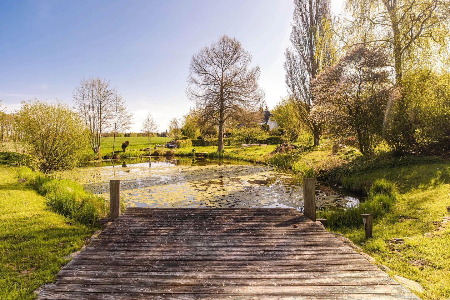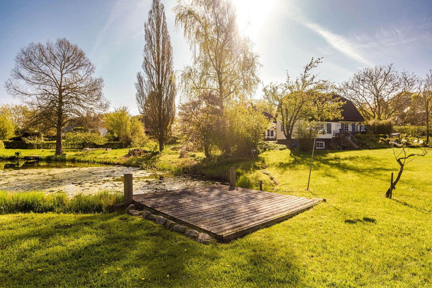 Die Grundstücksgröße, überwiegend mit Rasenflächen, beträgt 2500 qm und grenzt an einen Teich mit Seeterrasse. Das Haus liegt am Rand der Siedlung, und man hat einen freien Blick auf die Felder. Der Niswald mit altem Baumbestand lädt zu Spaziergängen ein.
