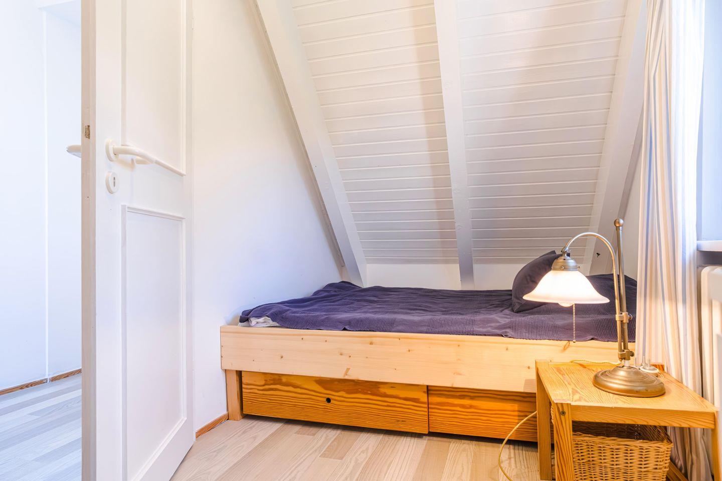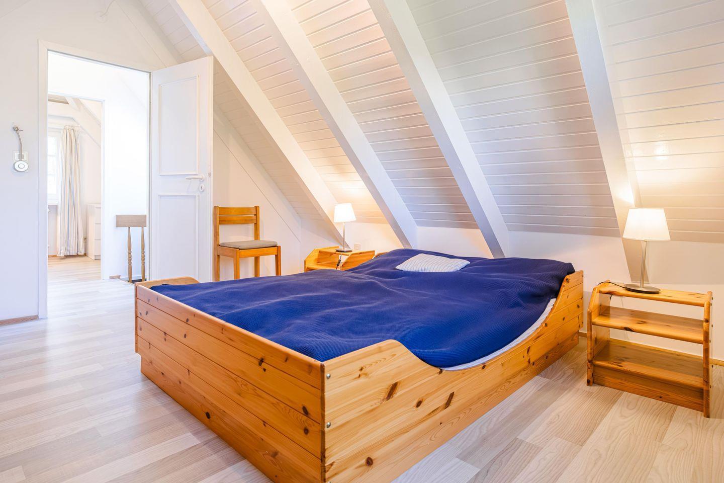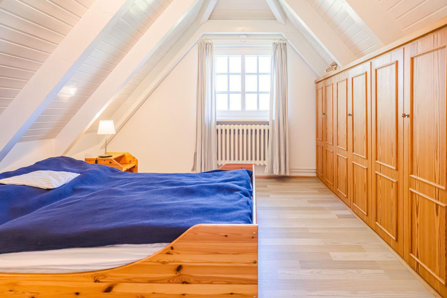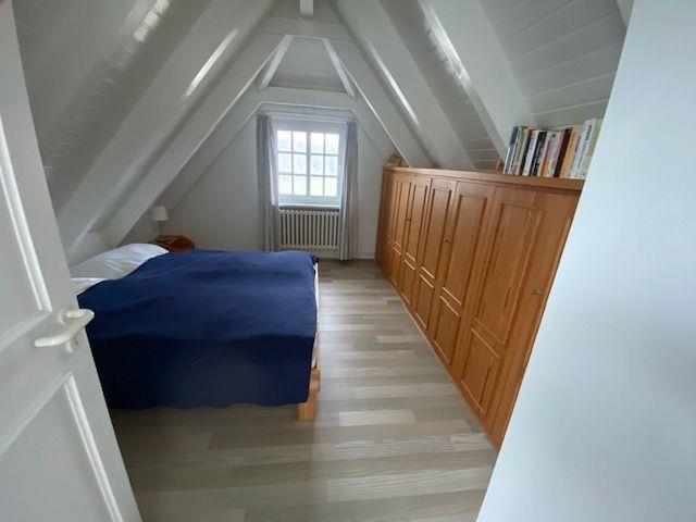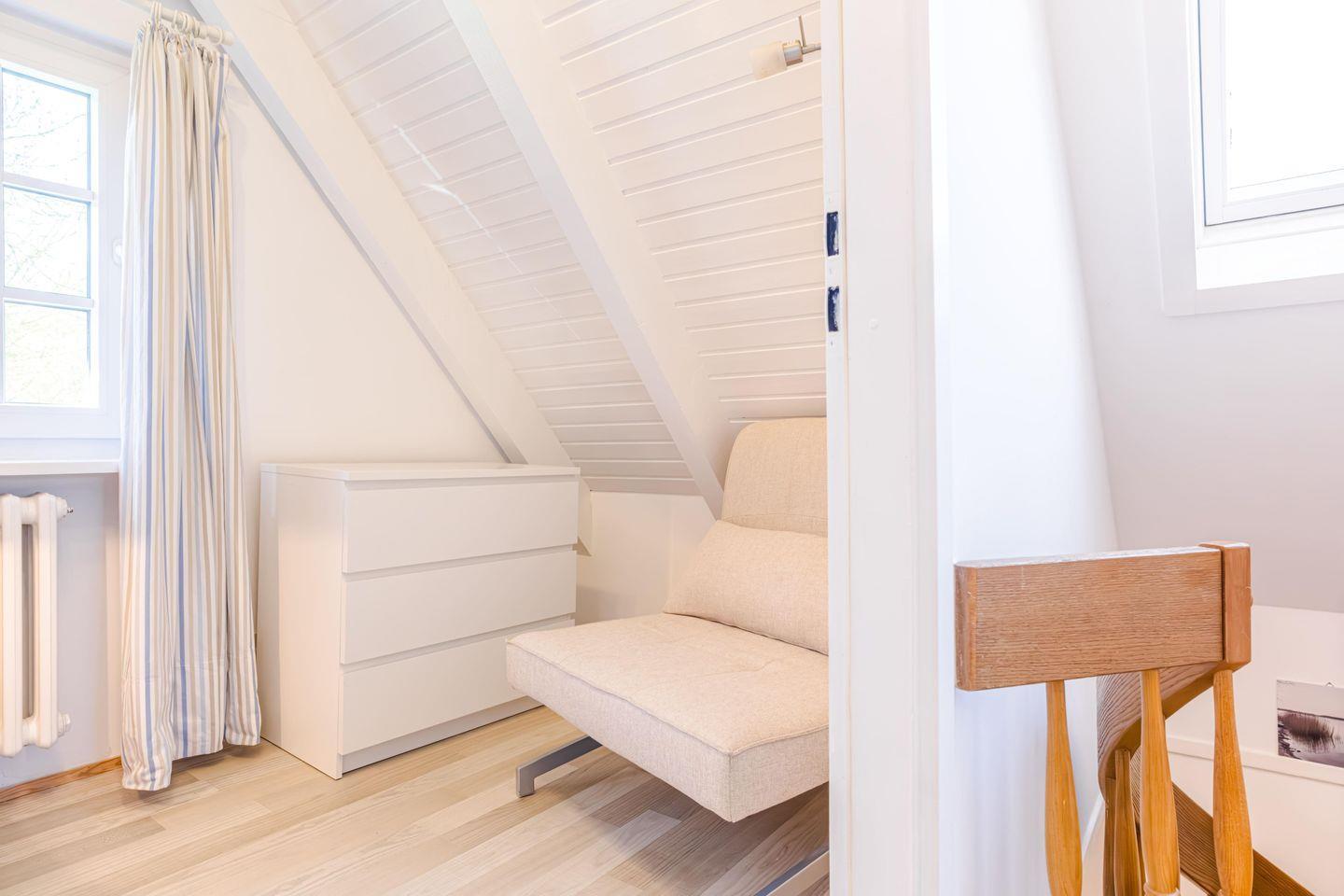 Zwei Schlafräume mit jeweils einem Doppelbett und das Bad befinden sich im Obergeschoss. Das Untergeschoss mit beidseitigem Tageslicht verfügt über einen Schlafraum mit Doppelbett in dem auch ein Schreibtisch zu finden ist. Außerdem ist dort das zweite Bad mit Dusche, WC und Waschmaschine.