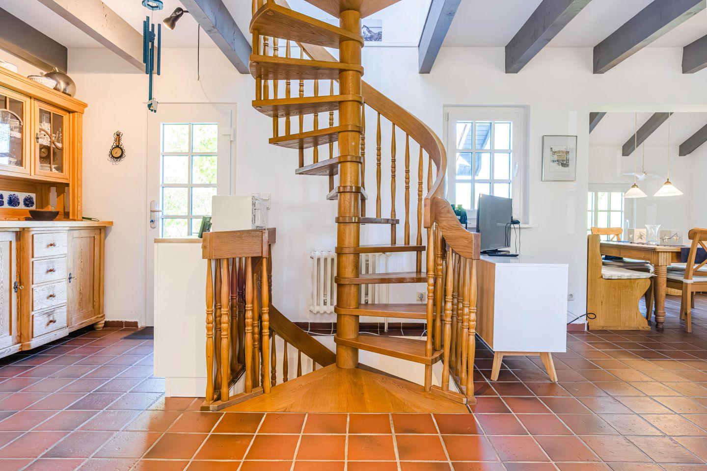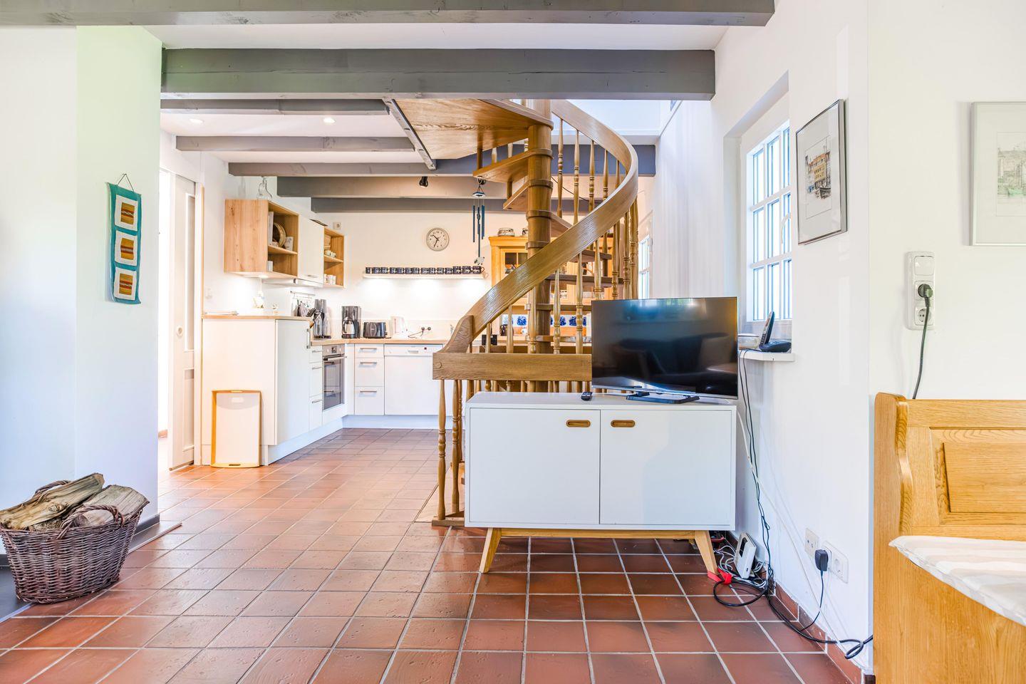 Das Haus besteht aus drei Geschossen, verbunden über eine Wendeltreppe. Im Erdgeschoss befindet sich der offene Wohnraum mit Kamin und integrierter Küche. Der Boden ist gefliest.