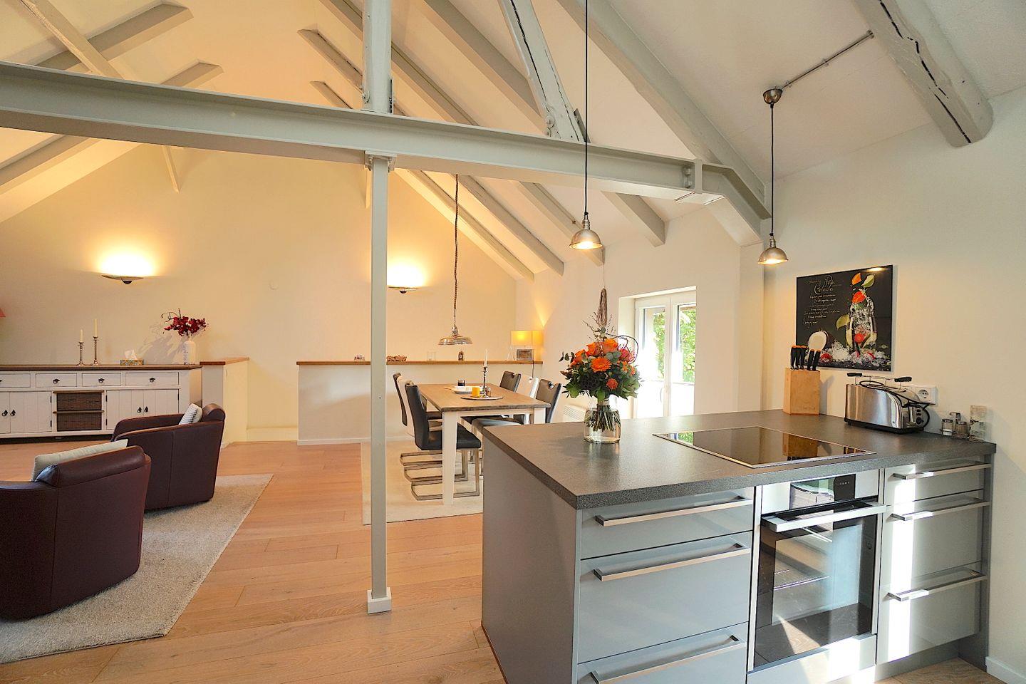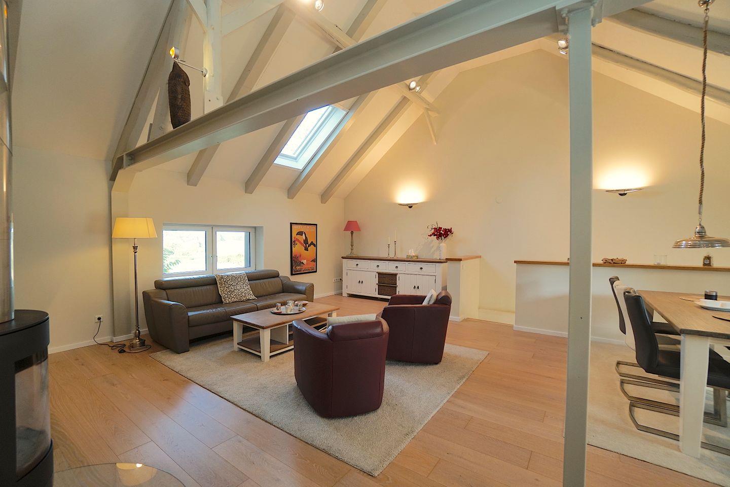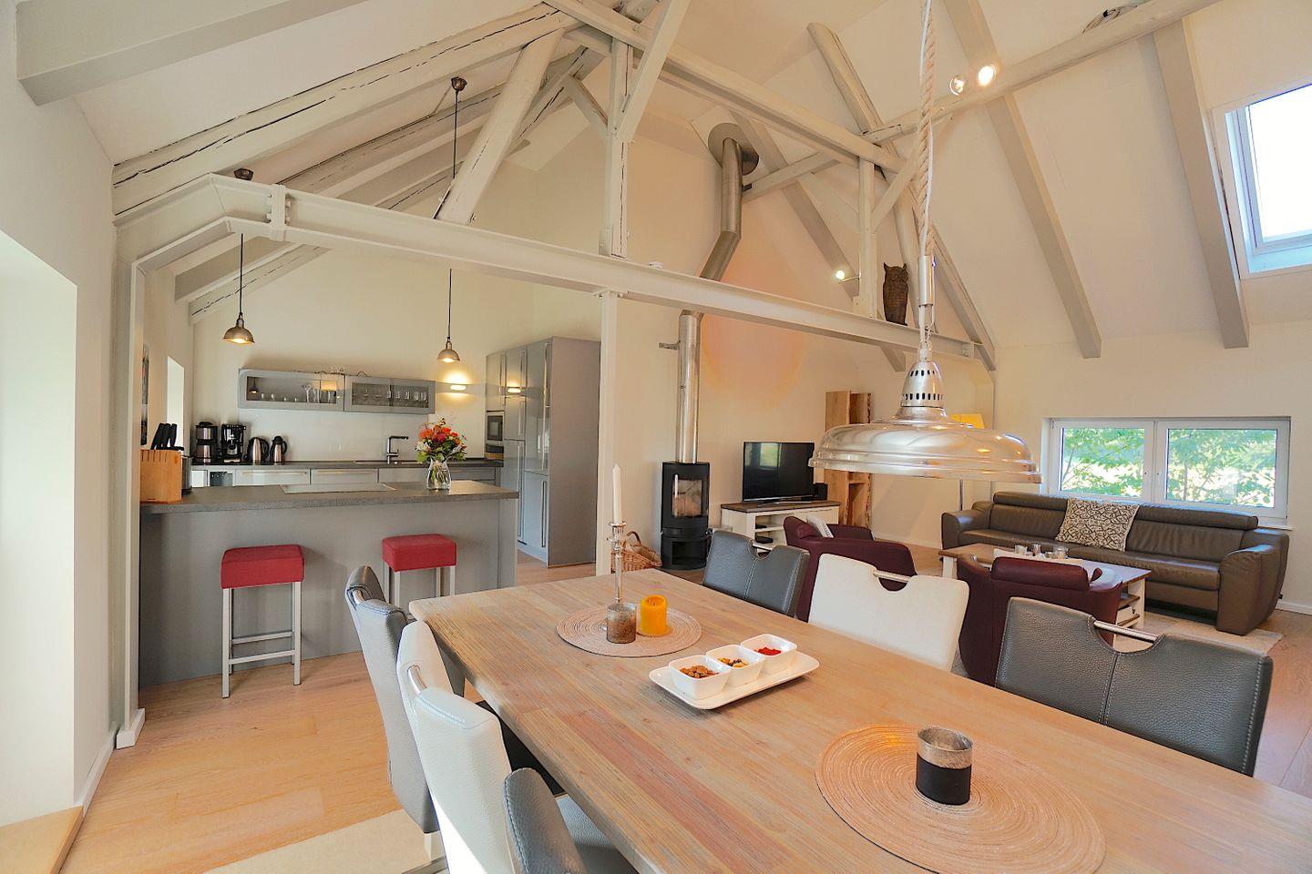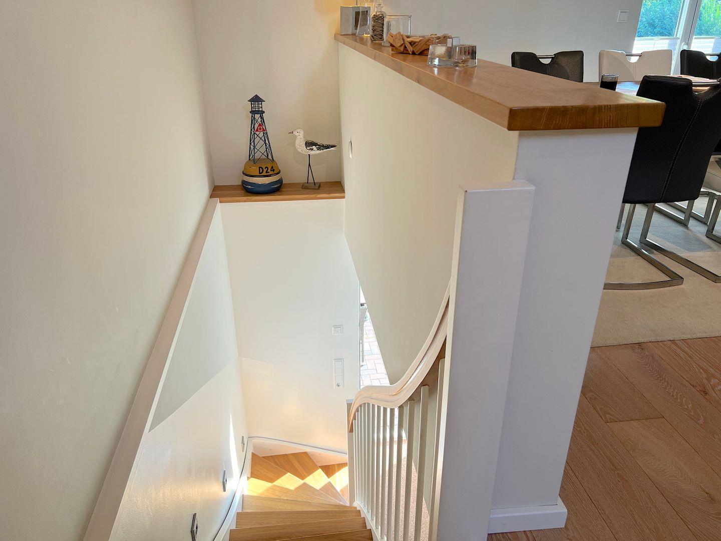 Im Obergeschoss liegt der helle, offene Wohn- und Essbereich. Der große Raum bietet viel Platz, egal ob man ein Glas Wein auf dem Sofa genießen möchte, am komfortablen Esstisch zusammen speist oder spielt, hier lässt sich auf genügend Raum gemeinsam eine unvergessliche Zeit verbringen.