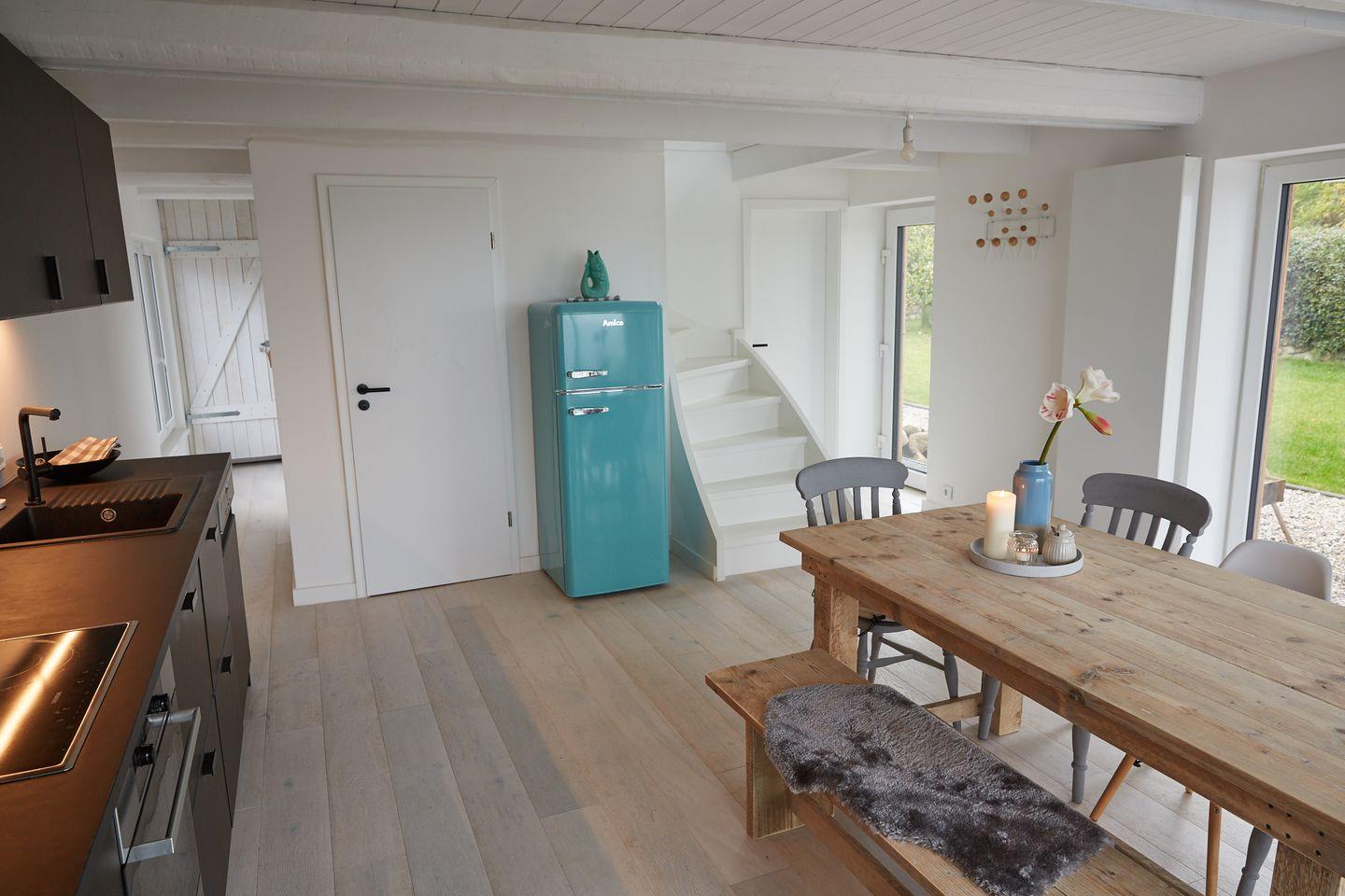 Das Haus erstreckt sich über zwei Ebenen: Im Erdgeschoss erwartet euch eine offene Küche mit Essbereich, die keine Wünsche offenlässt – hier könnt ihr gemeinsam kochen, klönen und genießen. Das freundliche und gemütliche Schlafzimmer mit Doppelbett und das moderne Duschbad befinden sich ebenfalls im Erdgeschoss. Der Kaminofen sorgt für eine wohlige Atmosphäre, ideal für gemütliche Abende. Eine Treppe führt ins Obergeschoss, wo sich ein offener Wohnbereich und ein separater, räumlich abgetrennter Schlafbereich befinden.