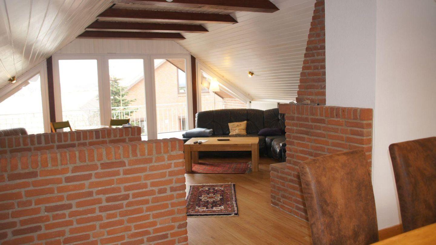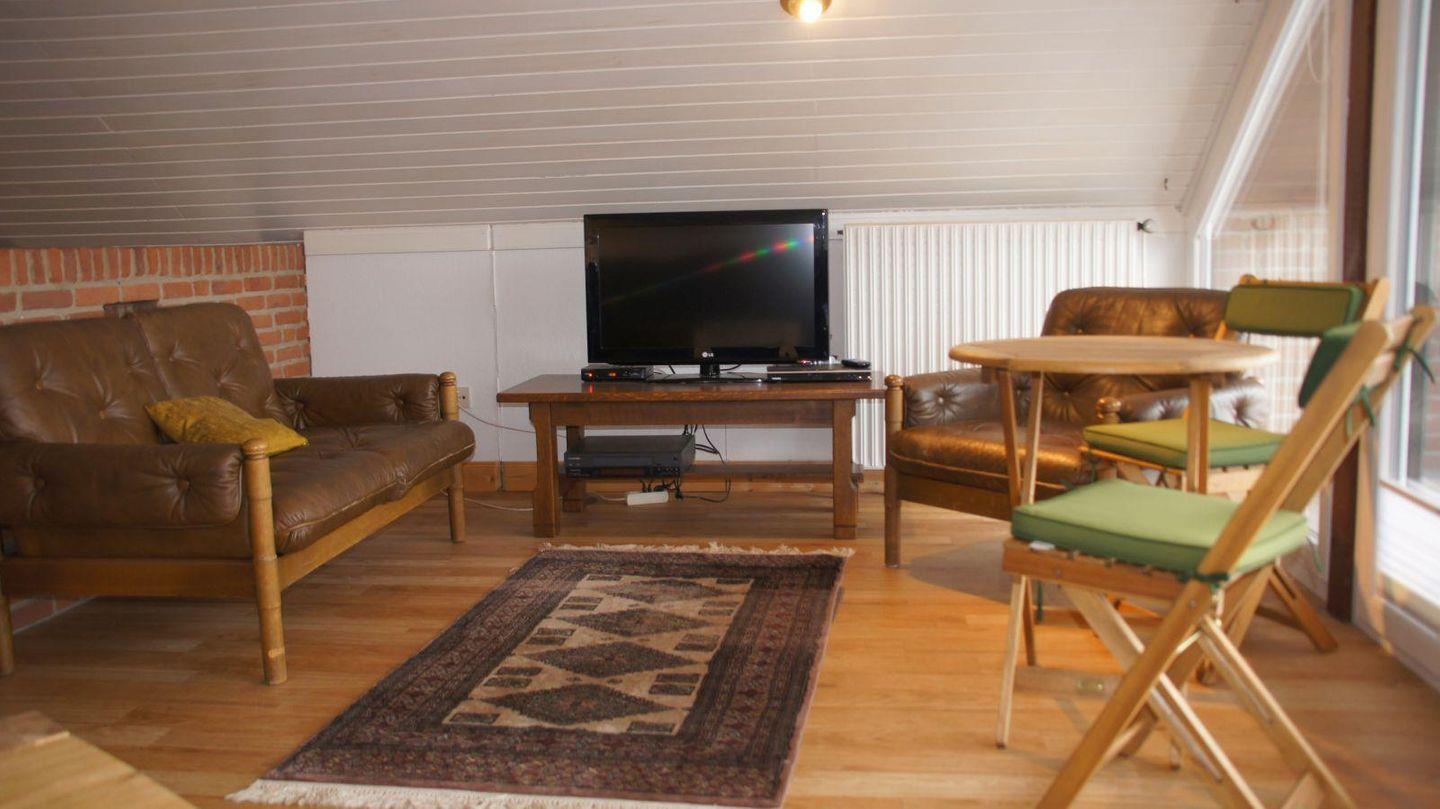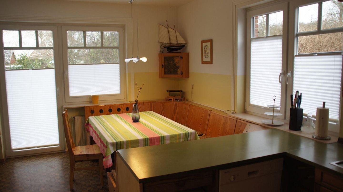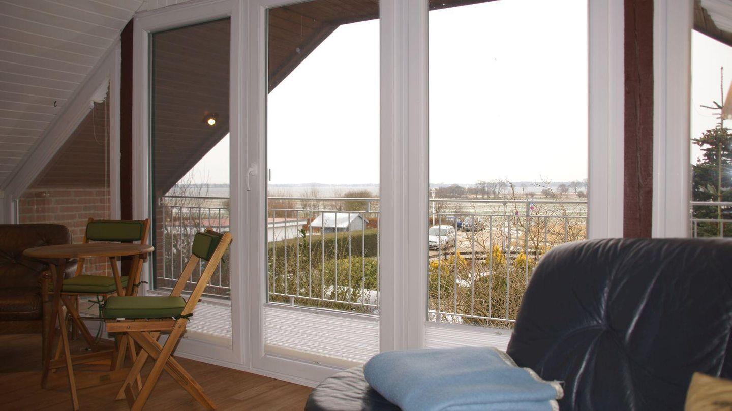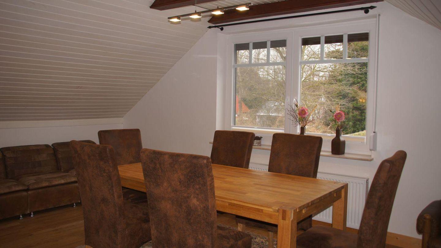 Die Treppe vom Flur führt Sie hinauf in die 1. Etage, zur Fernsehecke mit Kamin und großer Couchecke und zum Balkon mit Blick über die Felder und auf die Schlei. Ein großer Esstisch mit 6 Stühlen eignet sich als gemeinsamer Platz zum Spielen. Auch vom Balkon bietet sich ein einmaliger Weitblick auf die Schlei und die Wiesenlandschaft. Dort finden Sie auch einen schönen Platz an der kleinen Sitzgruppe mit Tisch.