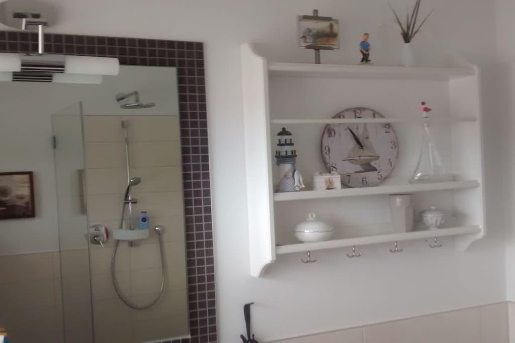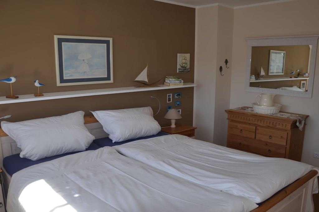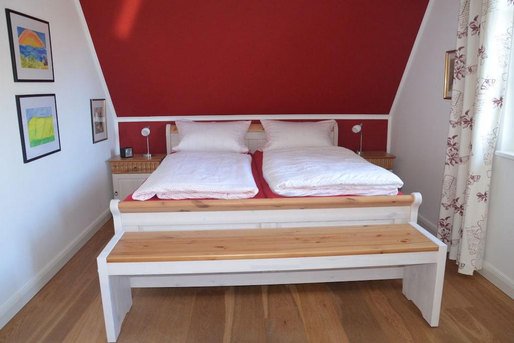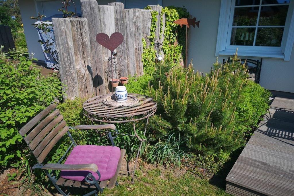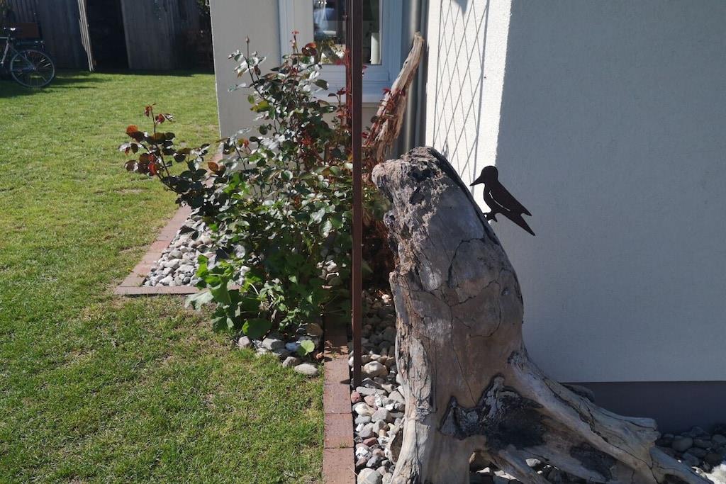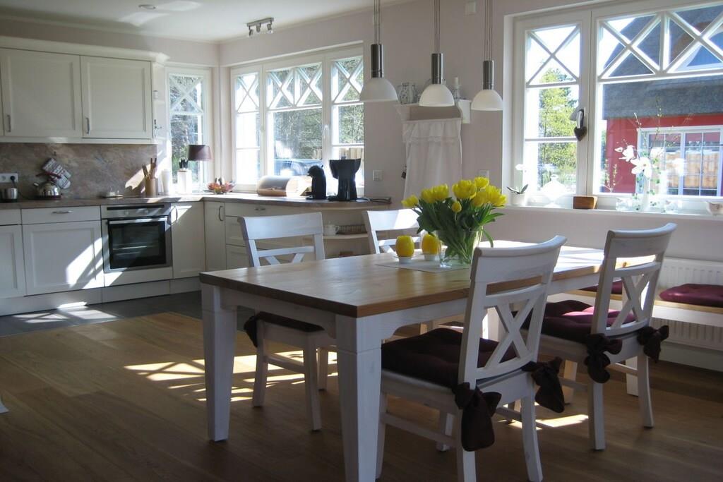 Genießen Sie Ihren Urlaub in unserem liebevoll gestalteten Ferienhaus. die kontrollierte Be-und Entlüftung sorgt für das perfekte Raumklima. Eichenbohlen im ganzen Haus. Eine ausziehbare Sitzecke lädt zum Fernsehen, Musik hören oder Lesen ein und der Kaminofen sorgt dafür, dass Sie sich auch in der kühlen Jahreszeit wohlfühlen. In der hochwertigen Landhausküche bleibt kein Wunsch offen. An dem großen Esstisch können sie auch nach dem Essen noch länger sitzen bleiben, zum Spielen oder Klönen. 2 großzügige Schlafzimmer (Doppelbetten), und 2 Bäder mit Dusche lassen keine Wünsche offen. Noch weiter, unterm Dach, finden Sie ein kuscheliges Studio. Für den Garten und die Holzterrasse stehen Ihnen Gartenmöbel und Sonnenschirm zur Verfügung.