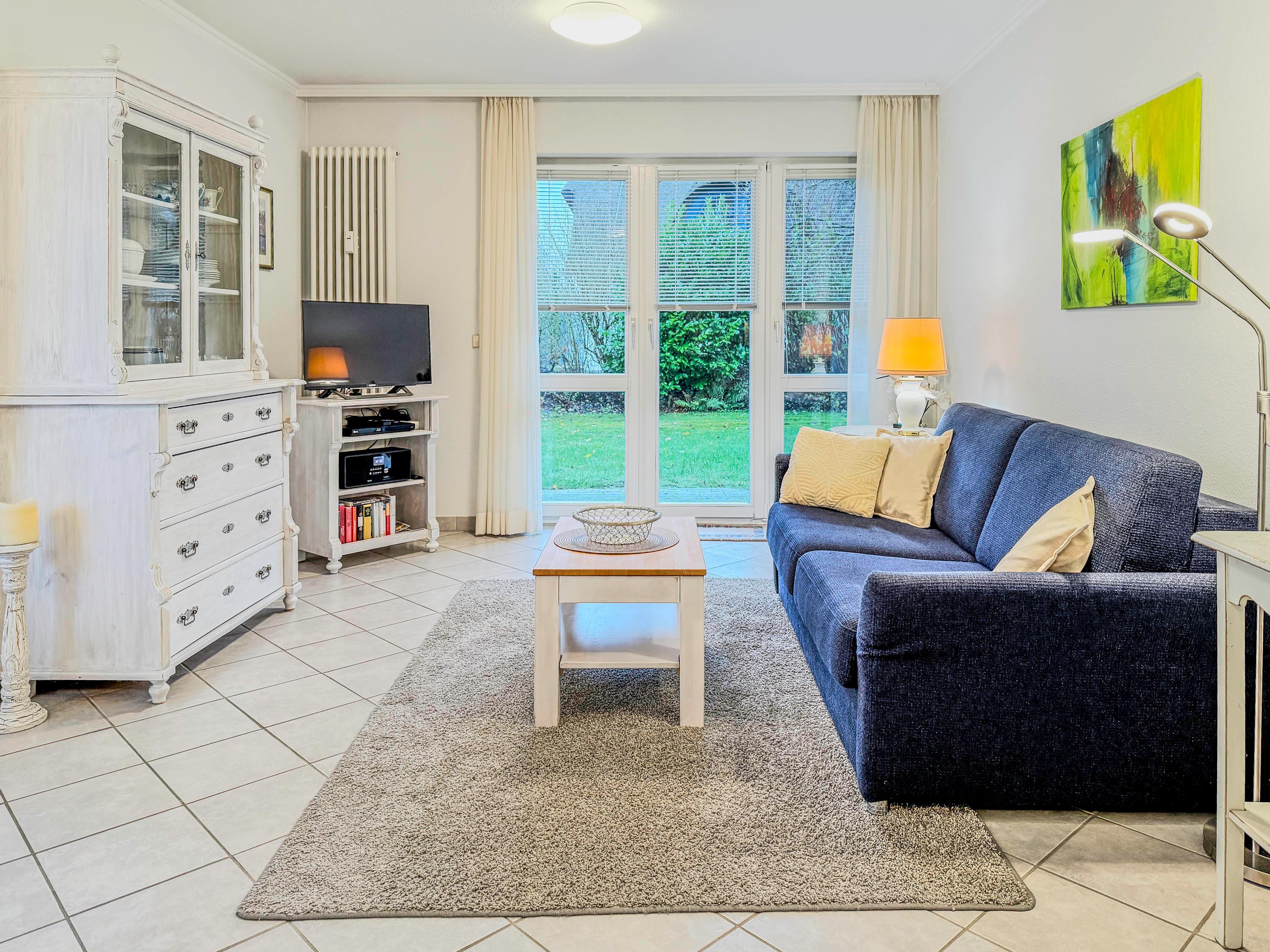 Wohnbereich: Heller, liebevoll eingerichteter Raum mit bequemer Sitzgruppe und Flachbild-TV