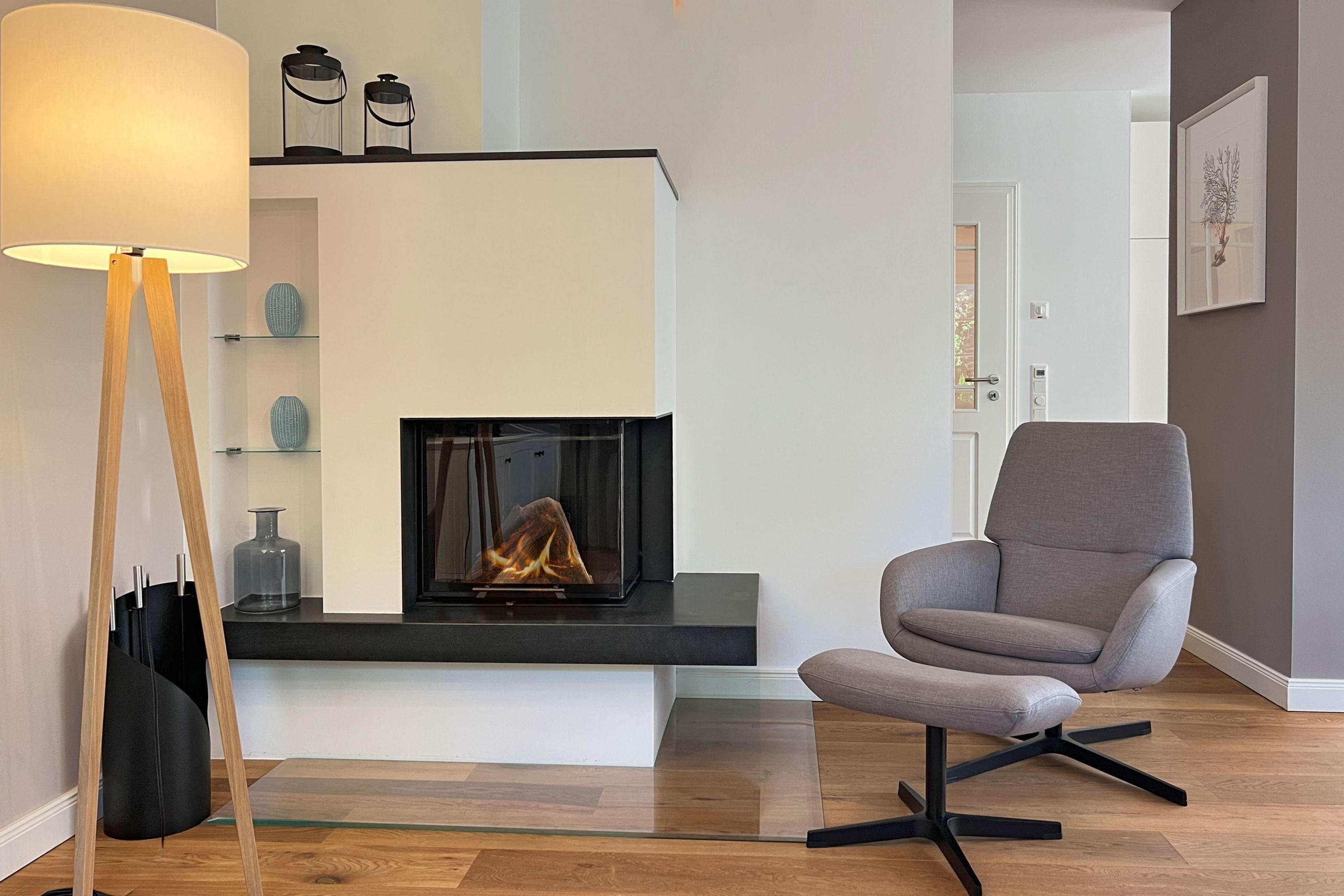 Der großzügige Wohnbereich mit Kamin bildet das Herzstück des Hauses – hier treffen edle Materialien auf Gemütlichkeit und schaffen Raum für gemeinsame Stunden.