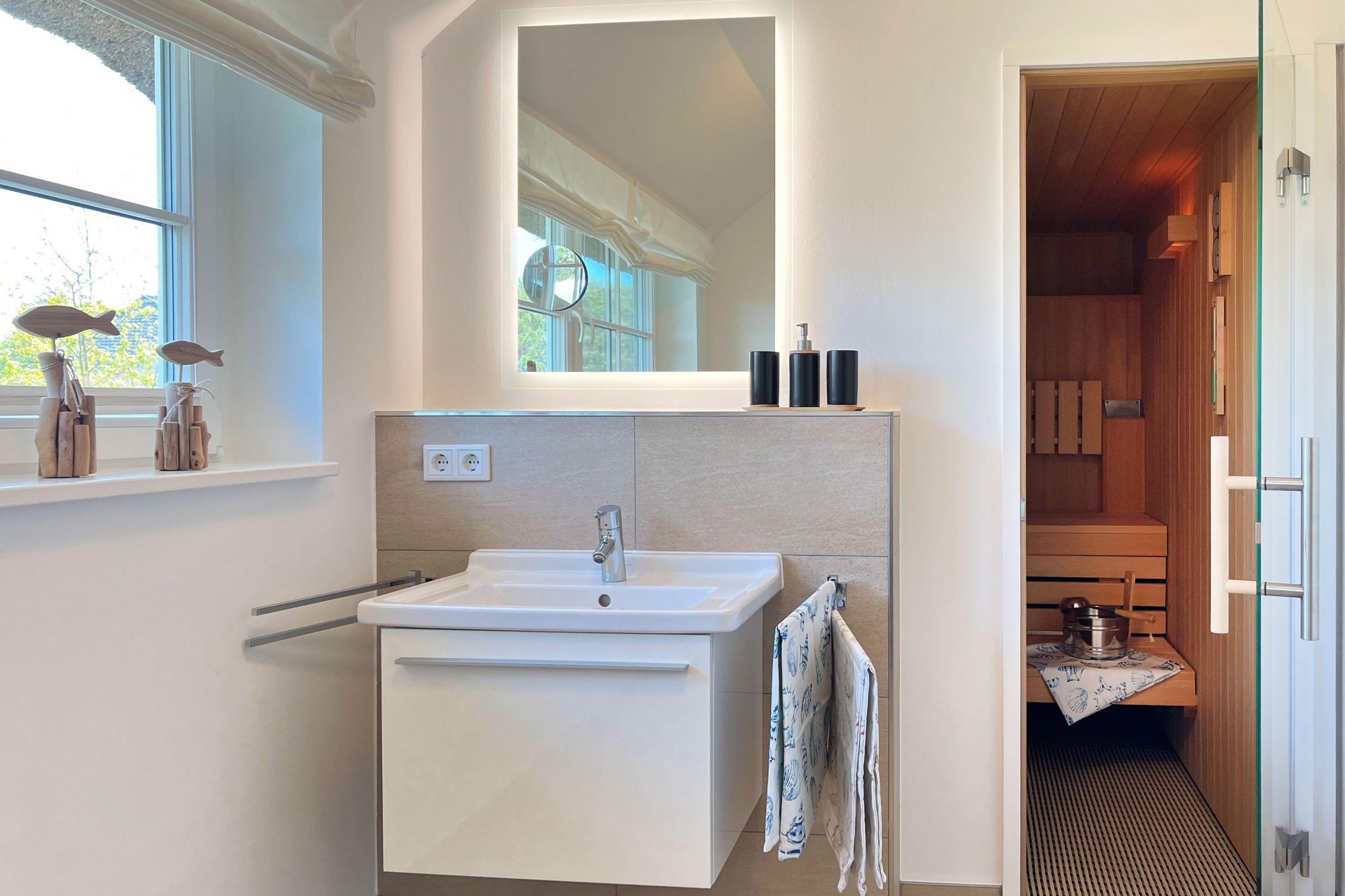 Badezimmer 2: Bodentiefe Dusche, WC, Sauna, Fußboden- und Handtuchheizung