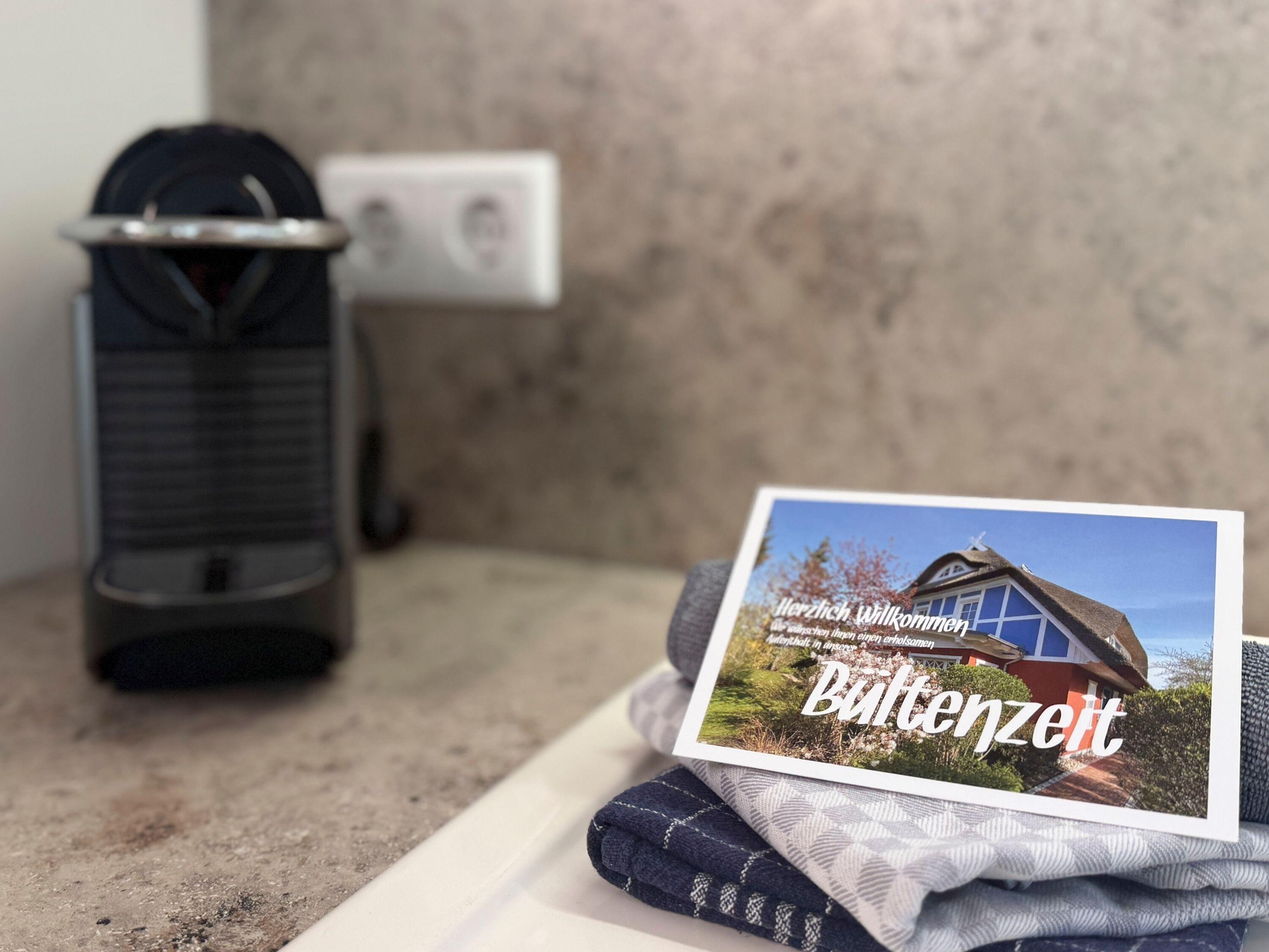 Offene, voll ausgestattete Küche mit Geschirrspüler, Backofen, Filterkaffeemaschine, Nespresso-Kapselmaschine, Toaster und Wasserkocher