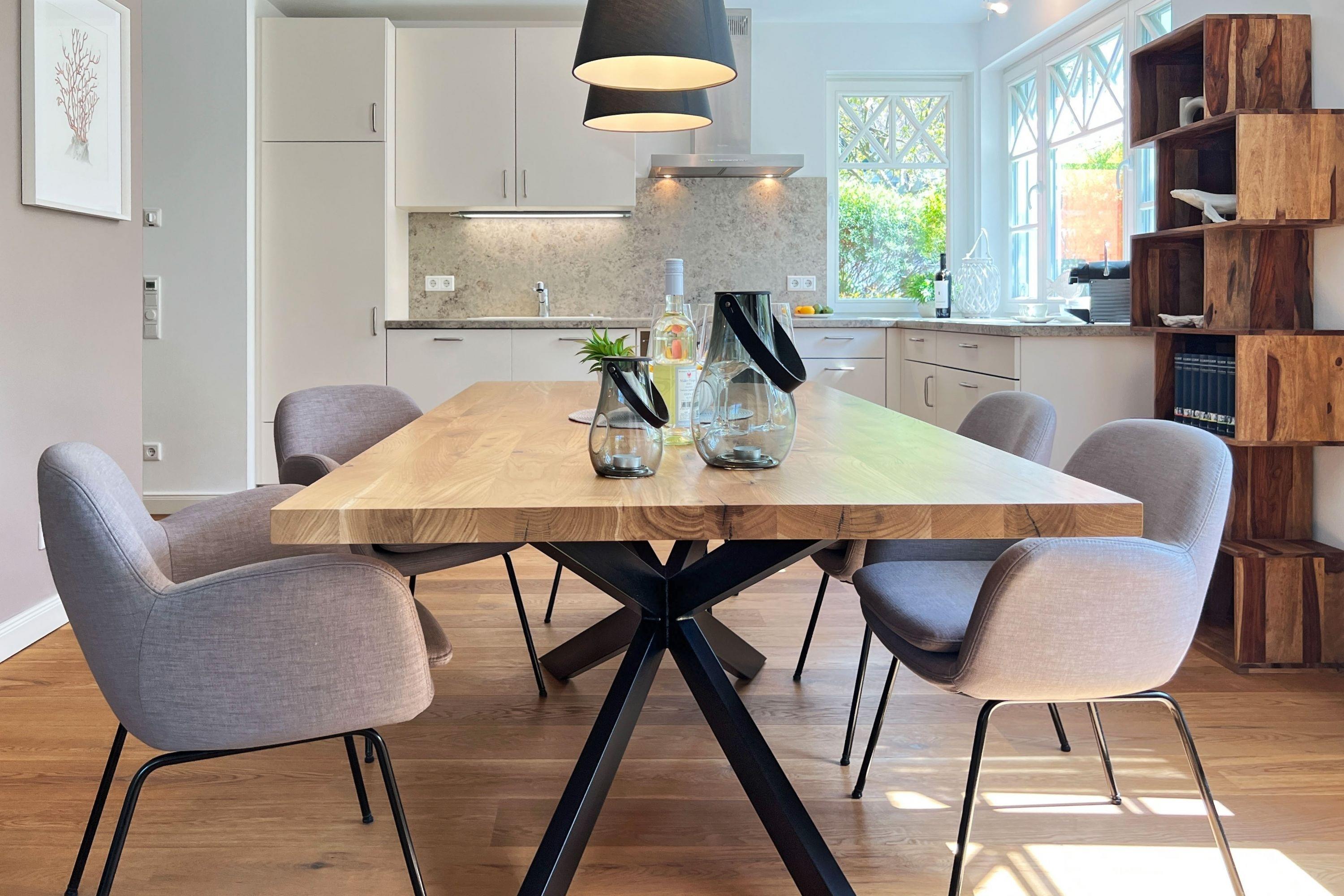 Die offene Küche lädt dazu ein, Lieblingsgerichte zuzubereiten und diese am Esstisch oder auf der großen Terrasse im Freien zu genießen.