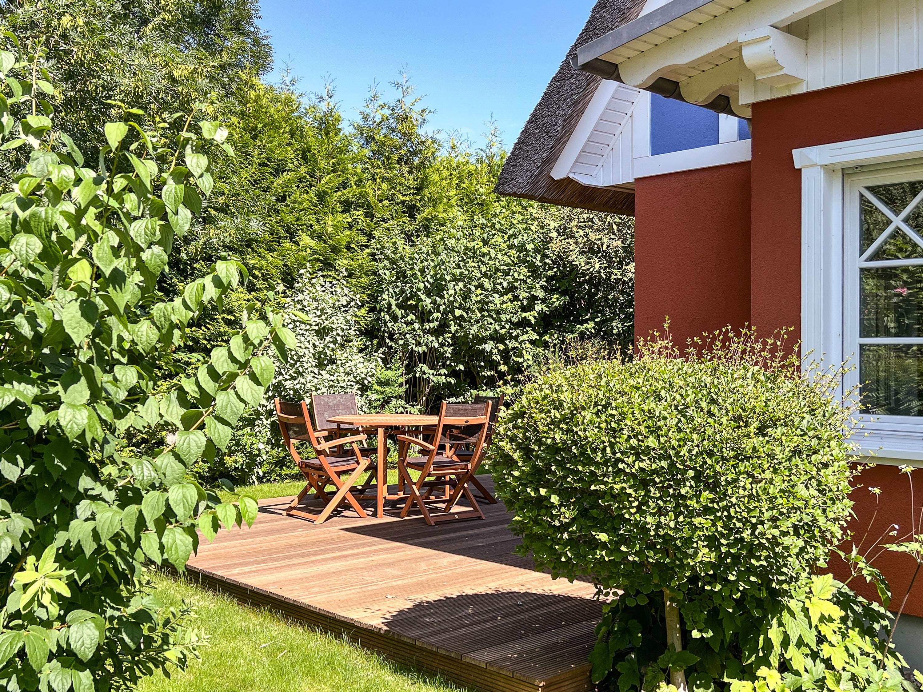 Das Ferienhaus Bültenzeit ist ideal für Familien – mit Kinderreisebett und Hochstuhl ausgestattet und mit viel Platz zum Spielen im Garten.