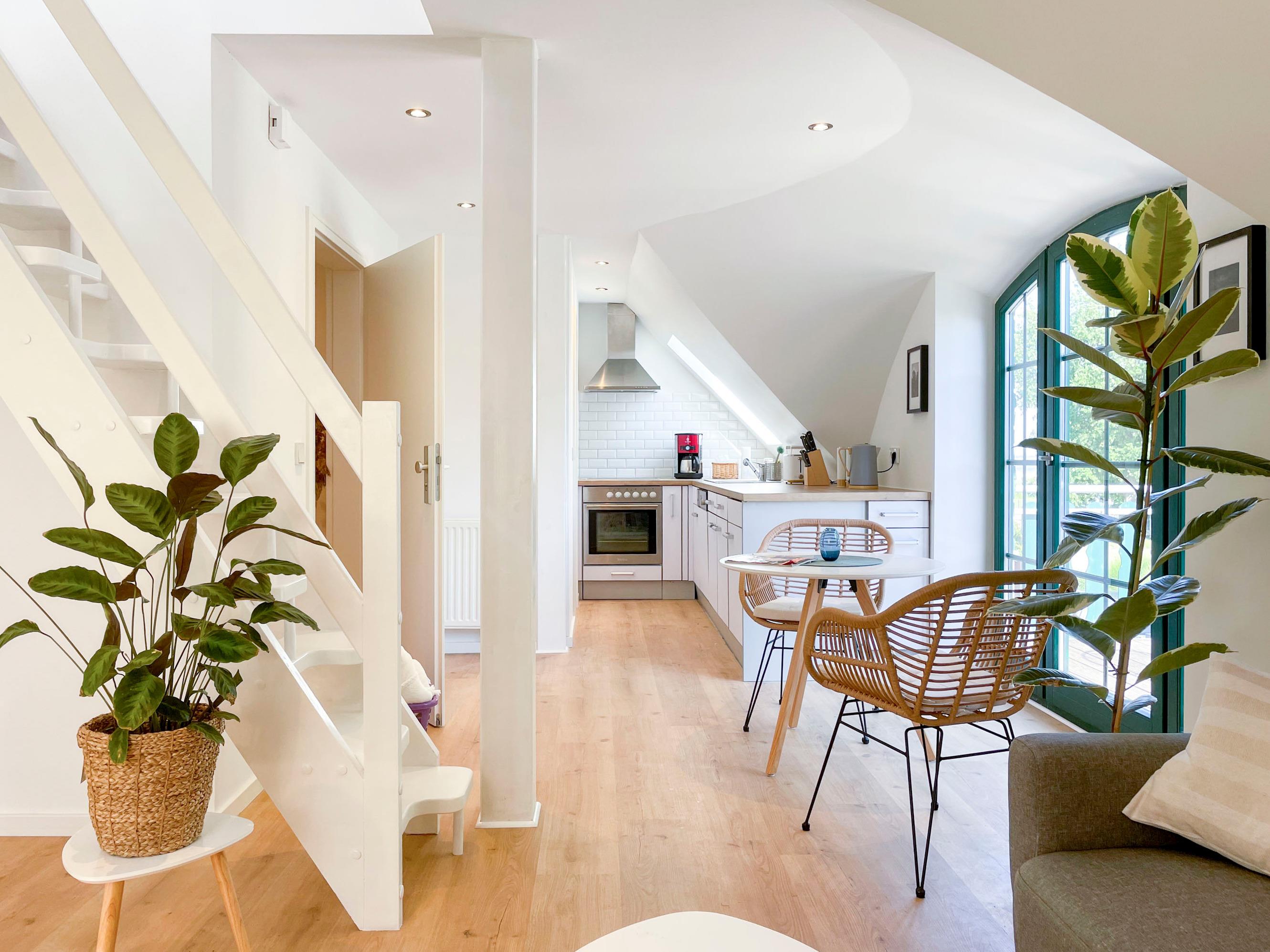In der modernen Küchenzeile lassen sich mühelos leckere Gerichte zubereiten, die Sie anschließend im gemütlichen Essbereich oder auf dem Balkon mit Boddenblick genießen können.