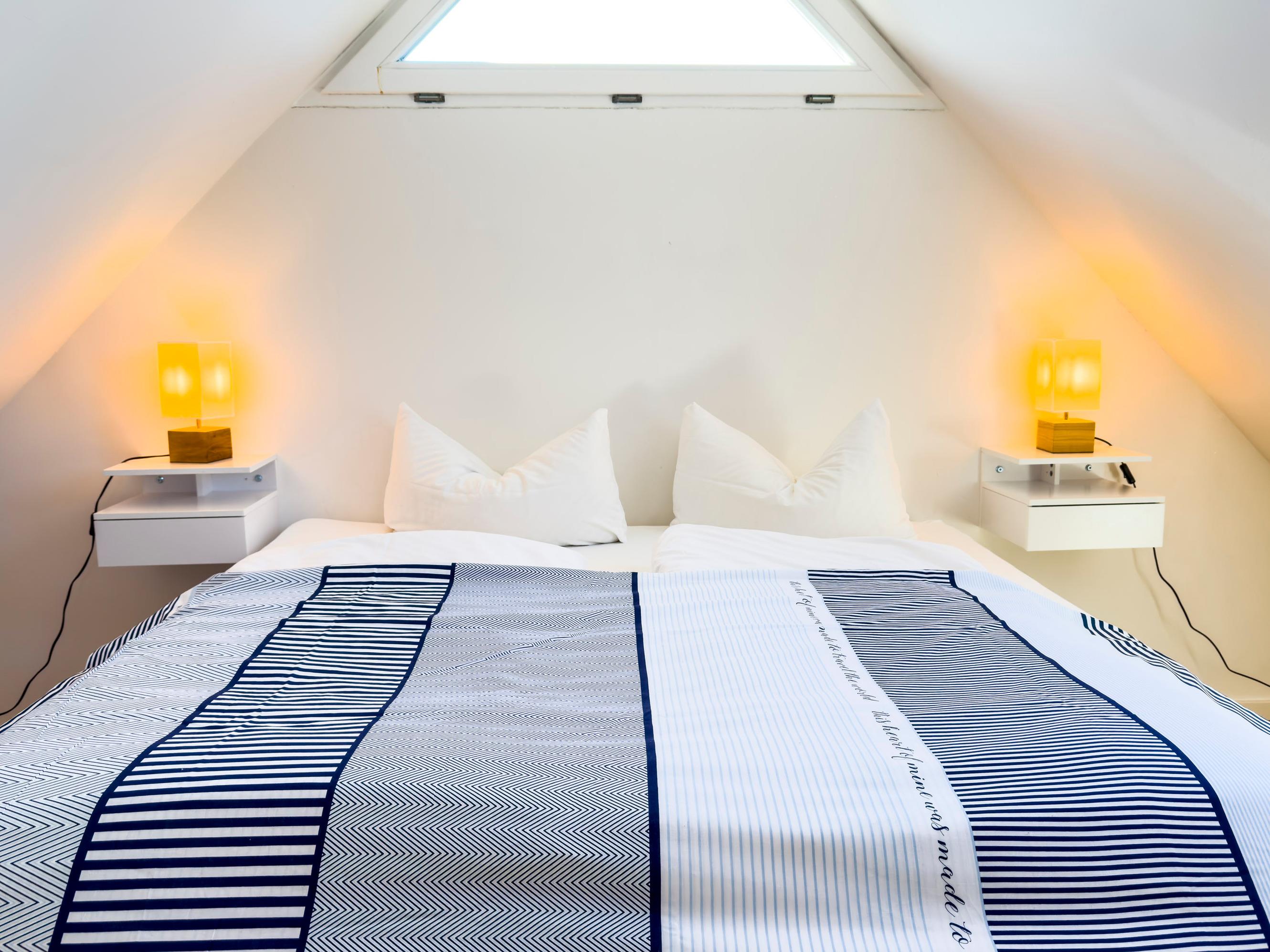 Schlafzimmer: Ein Schlafzimmer mit Doppelbett (180 × 200 cm) und Einzelbett (90 × 200 cm)