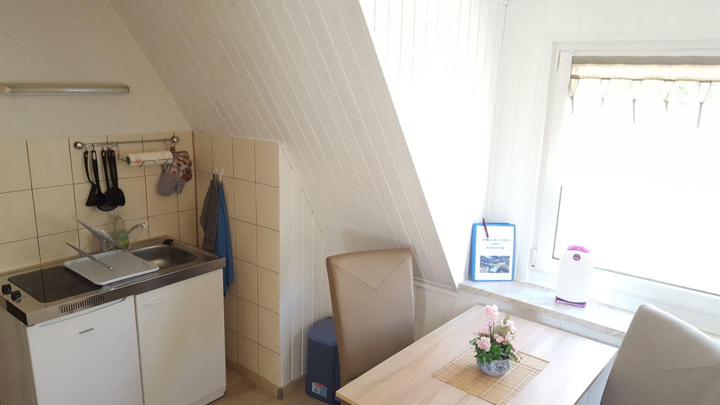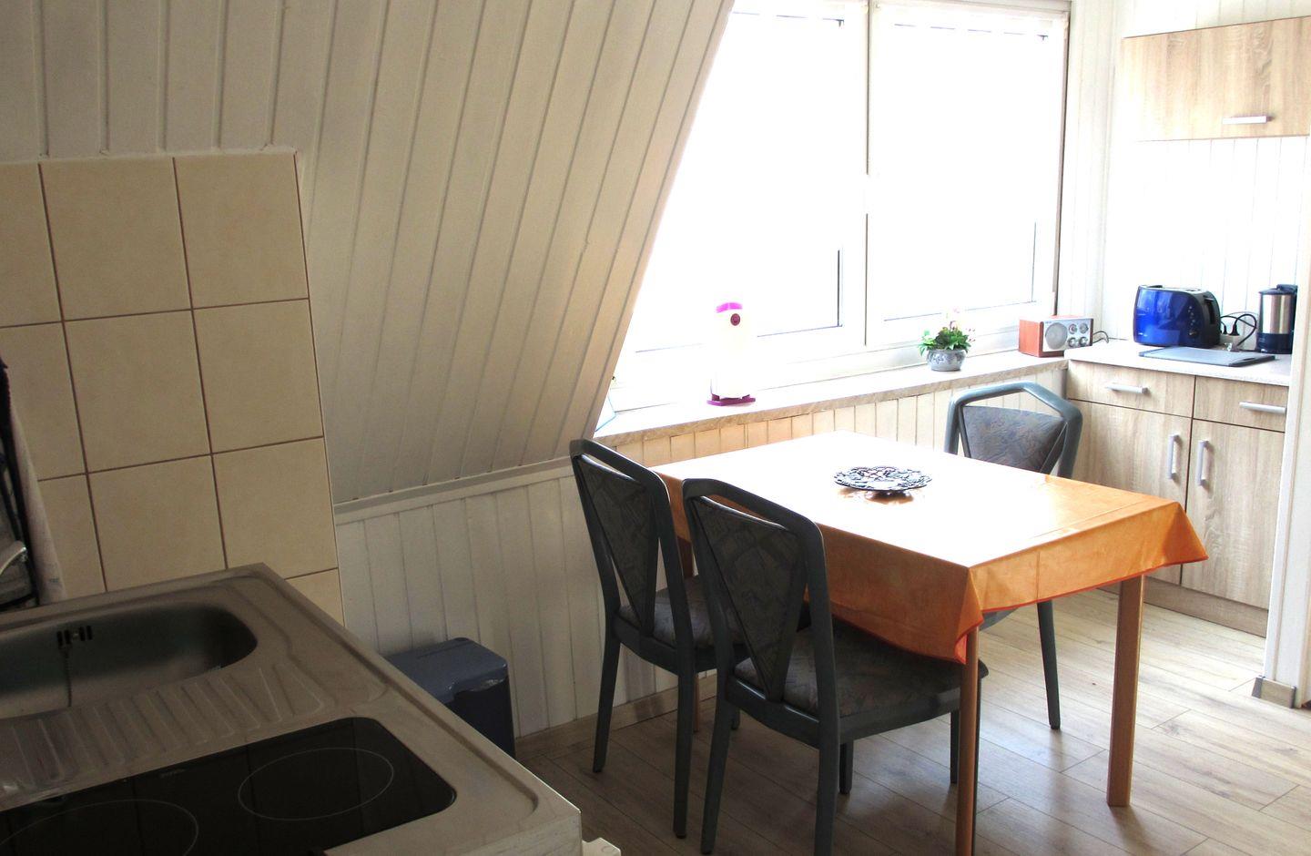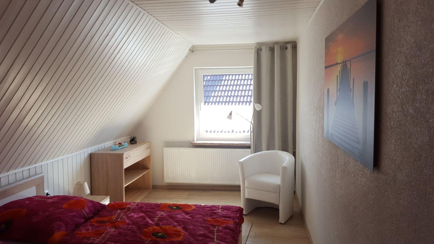 Die Ferienwohnung befindet sich in der 1 Etage eines Einfamilienhauses und ist über eine separate Außentreppe zu erreichen. Sie verfügt über ein separates Schlafzimmer mit Doppelbett (180x200m) und Kleiderschrank (Bettwäsche ist inklusive, keine Handtücher). Ein Wohnzimmer mit Ecksofa , Küche mit zwei Kochplatten sowie Kaffeemaschine, Toaster, Wasserkocher und einem kleinen Bad (Dusche und WC) sind vorhanden.