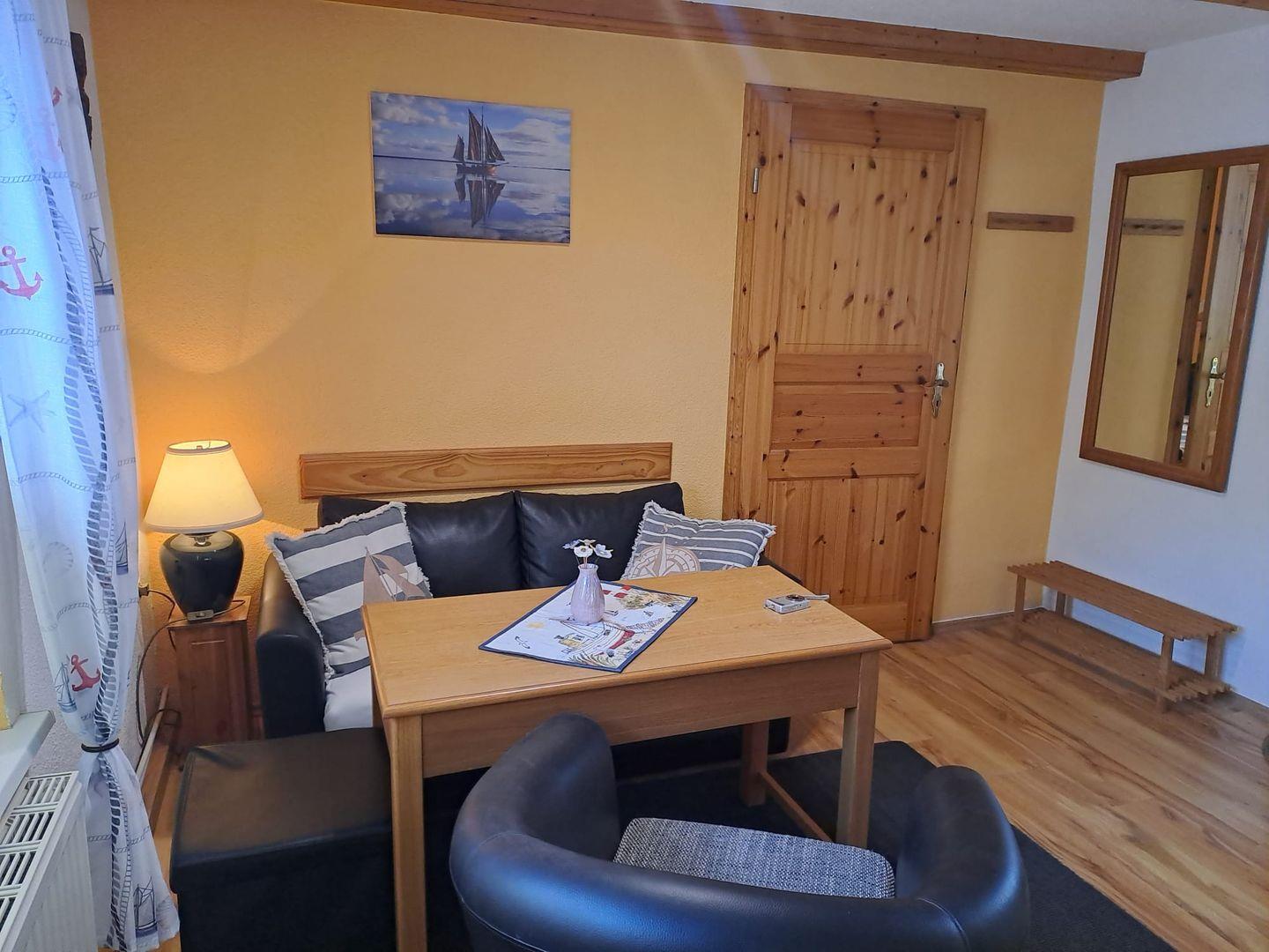 Die Ferienwohnung "Koje" ist hell und freundlich eingerichtet. Im Küchenbereich haben Sie eine kleine gemütliche Sitzecke.