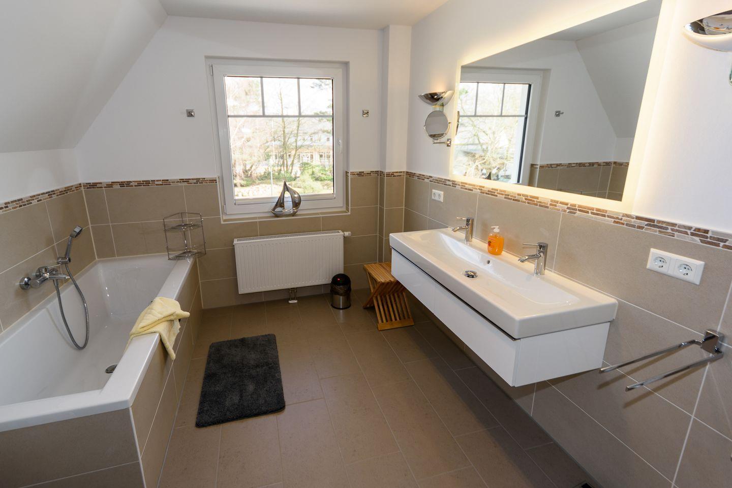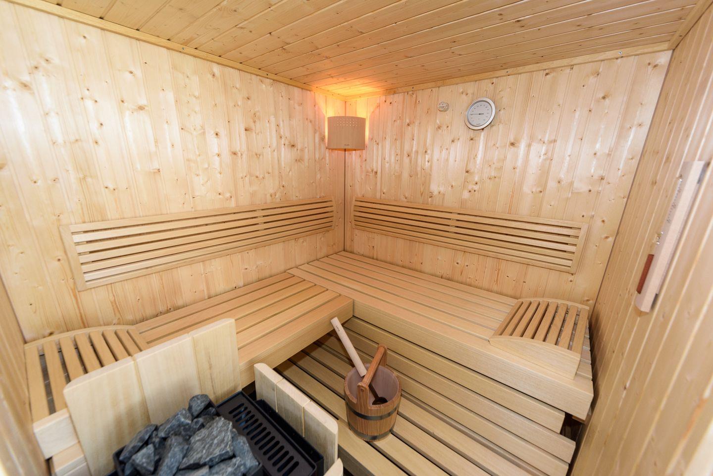Für Ihr Wohlbefinden ist am Premiumhaus auch eine Sauna vorhanden ( buchbar). Lassen Sie nach einem aktiven Tag die Seele baumeln und gönnen Sie sich die pure Entspannung. Hinzu kommen praktische Einrichtungen wie zwei Badezimmer – jedes ausgestattet mit bodengleichen Duschen und einer Badewanne, um den Tag gemütlich ausklingen zu lassen.