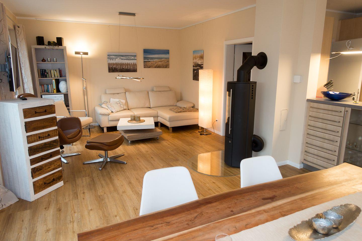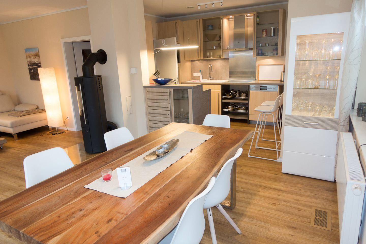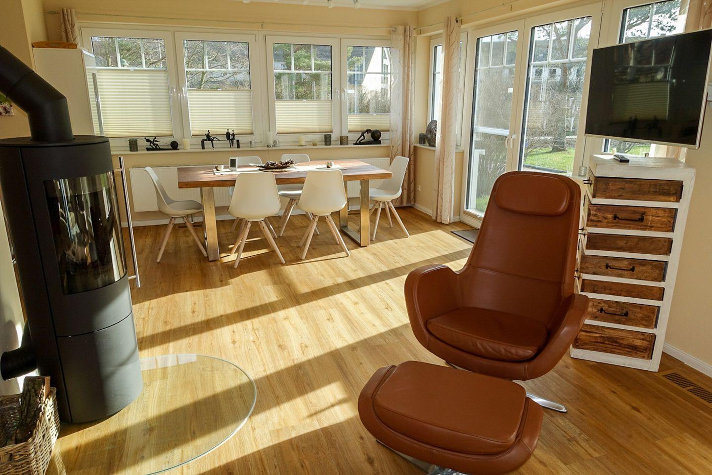 Zum Entspannen eignet sich das helle Wohnzimmer, das mit einem Kaminofen für warmes Ambiente sorgt. Der große Esstisch und die bequemen Sofas bieten die perfekte Kulisse für gesellige Abende. Zudem sind mehrere TV-Geräte (insgesamt drei) vorhanden, sodass Unterhaltung für Groß und Klein gesichert ist.