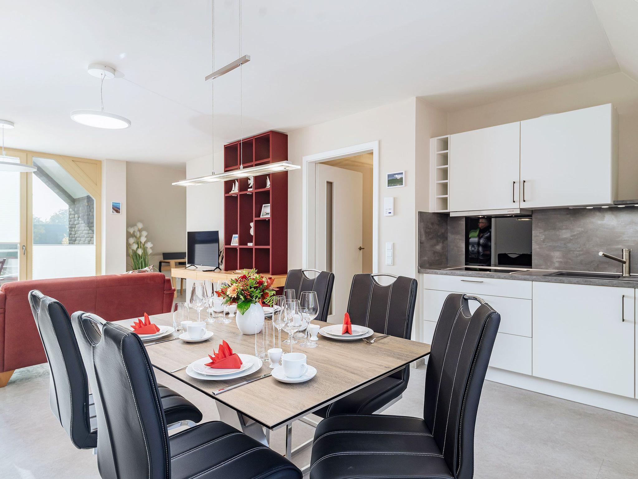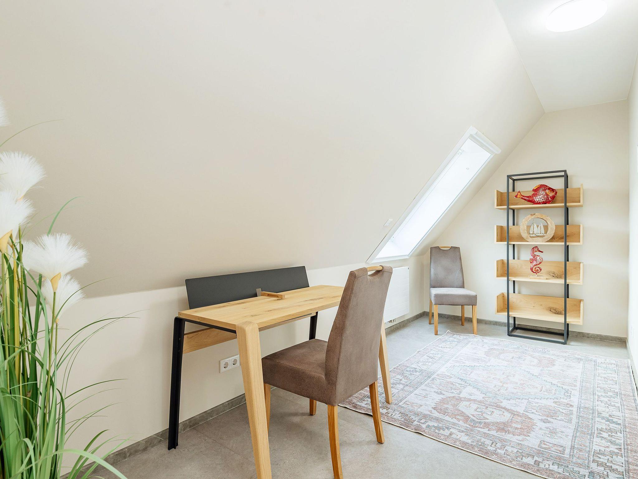 Der helle, offene Wohn- und Küchenbereich lädt zum gemeinsamen Kochen, Essen und Entspannen ein. Die moderne Einbauküche ist bestens ausgestattet ? mit allem, was das Hobbykoch-Herz höherschlagen lässt: Ceranfeld, Backofen, Mikrowelle, Geschirrspüler und hochwertige Utensilien von Zwilling. Und falls es doch mal ein bisschen zu ambitioniert wird ? die Spülmaschine ist auf Eurer Seite. Für ruhigere Momente gibt es eine gemütliche Schreib- und Leseecke ? ideal für ein gutes Buch, Urlaubsplanung oder das gepflegte „Ich tu mal so, als wäre ich produktiv“.