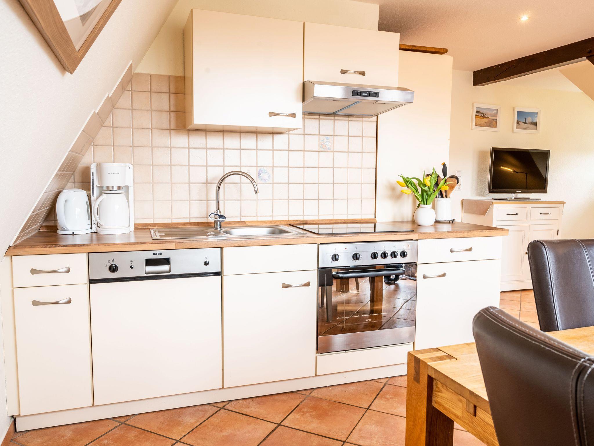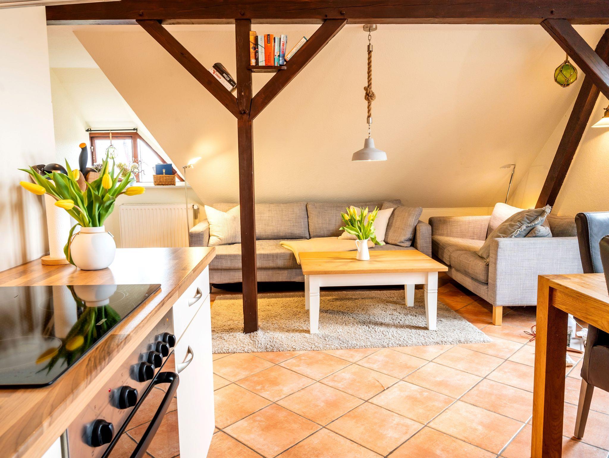 Die Ferienwohnung Boddenbrise ist eine gemütliche Dachgeschosswohnung im ersten Stock unter einem traditionellen Reetdach und verfügt über etwa 50 qm Wohnfläche. Sie ist ideal für zwei Personen geeignet, eine dritte Person kann auf Anfrage zusätzlich untergebracht werden.