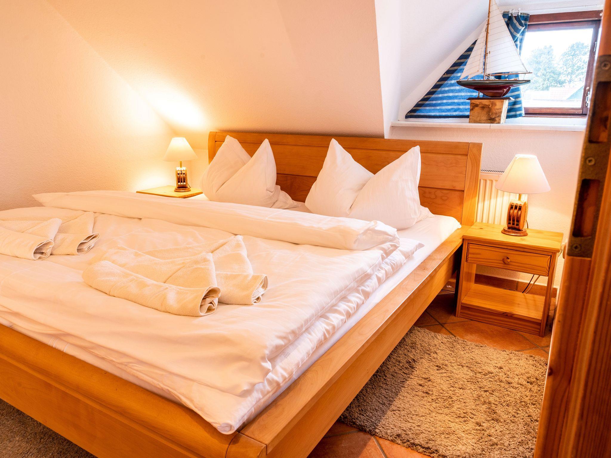 Das separate Schlafzimmer verfügt über ein Echtholzdoppelbett mit hochwertigen Naturmatratzen aus Rosshaar und Schafwolle sowie einem Bonnell Federkern, die für ein angenehmes Schlafklima sorgen. Für eine dritte Person steht im Schlafzimmer ein zusätzliches Einzelbett zur Verfügung. Ein großer Kleiderschrank in der Dachschräge sowie eine Echtholzkommode bieten ausreichend Stauraum.