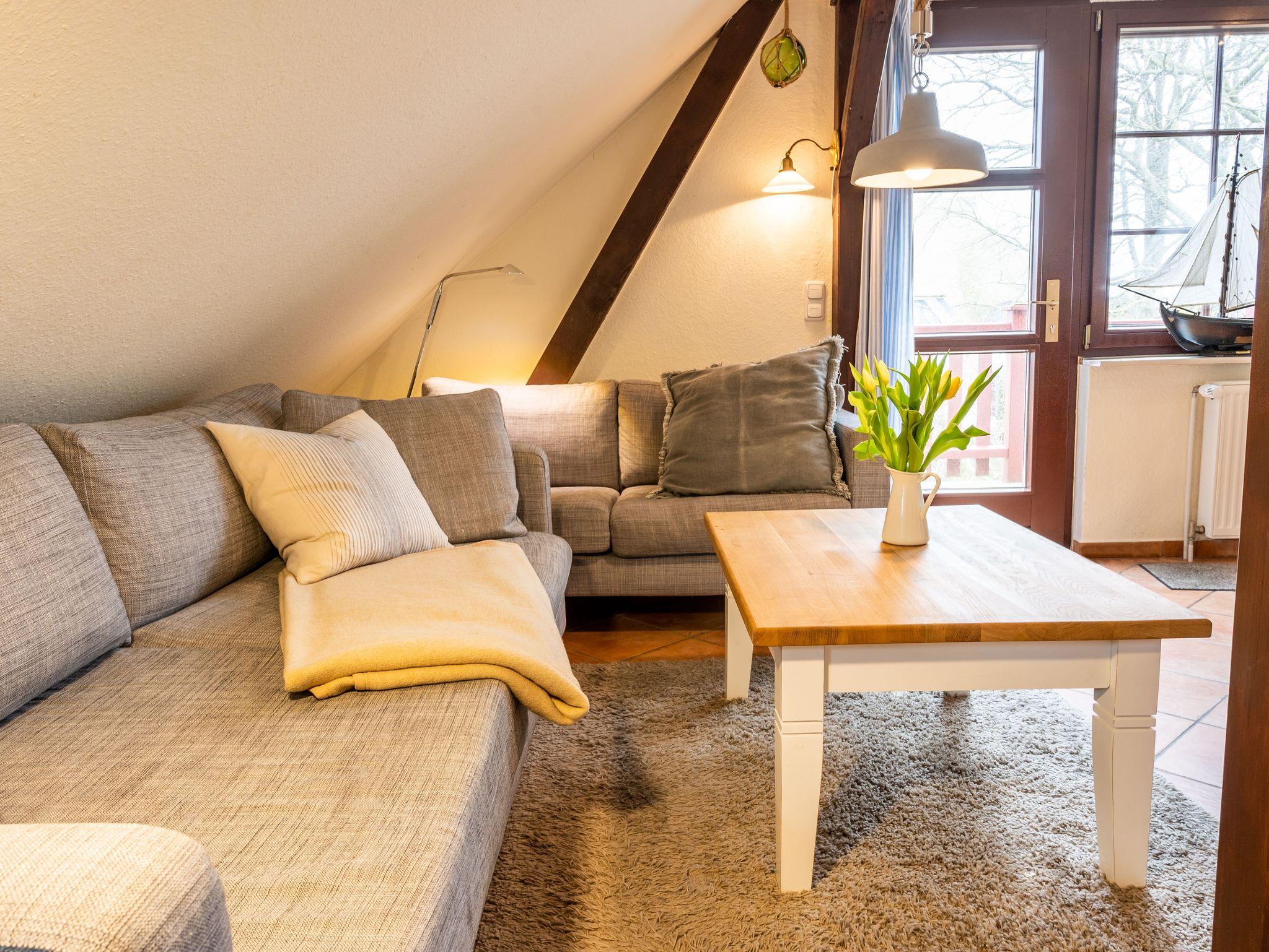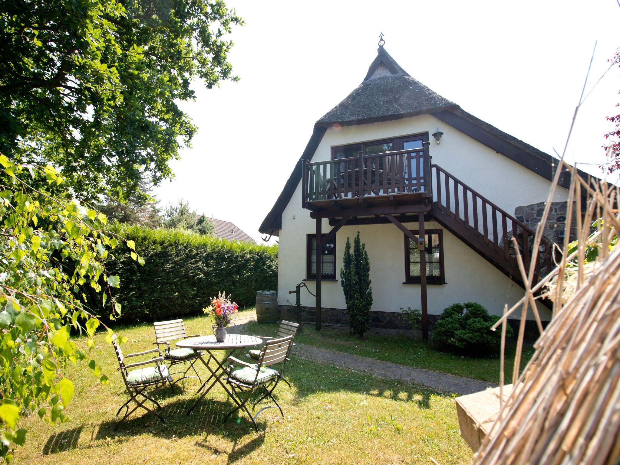 Gemütliche Ferienwohnung Boddenbrise mit Reetdach am ruhigen Ortsrand von Born auf dem Darß, ideal für Natur- und Ruhesuchende.
